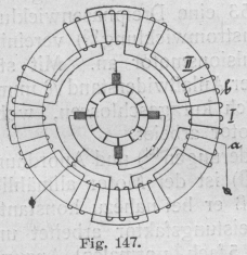 147 mit den Wicklungen I und II versehen. Beim Anlauf wird zwischen den Punkten a und b der Wicklung II nur eine geringe Spannung herrschen, da wegen der