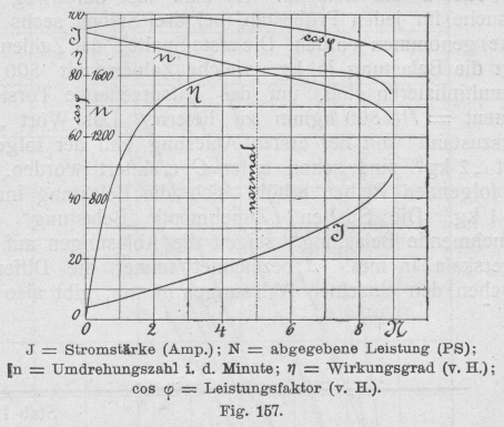 groß wie das normale ist, bei etwa 1½ fächern Normalstrom und cos φ = 0,6 bis 0,8. Der Leerlaufstrom beträgt 30–20 v. H.