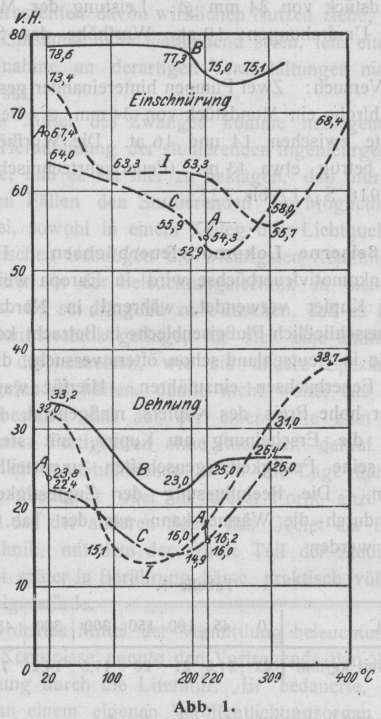 Einschnürungswerte eingetragen sind, enthält zum Vergleich auch die Linie I, die dem Werke von Bach
