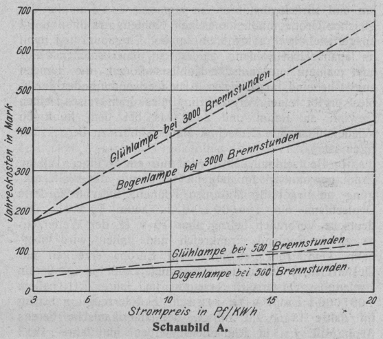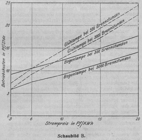 Bogenlampe und Glühlampe vergleicht Dipl.-Ing. Heyck in der Z. d. V. d. I. (1917 Heft 30) in bezug auf