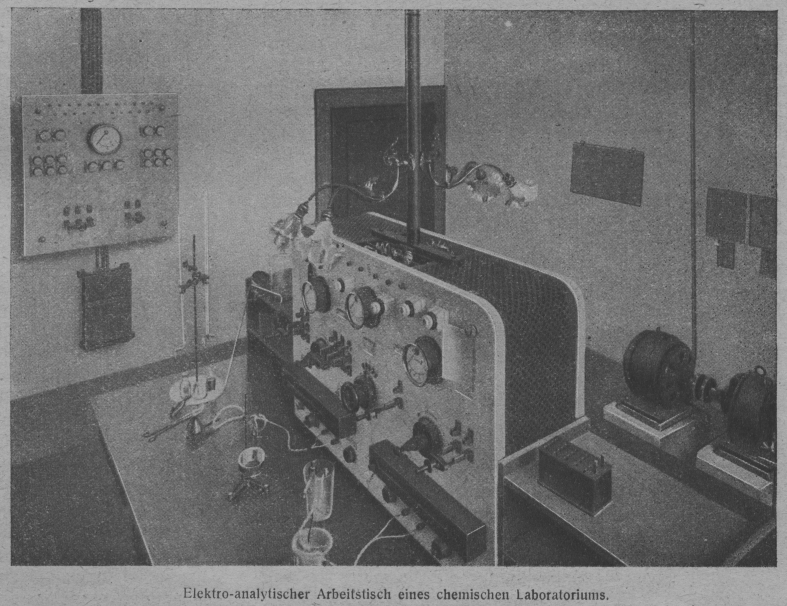 Elektro-analytischer Arbeitstisch eines chemischen Laboratoriums.