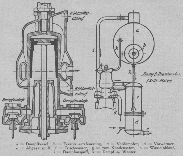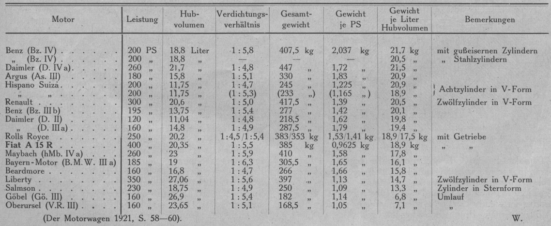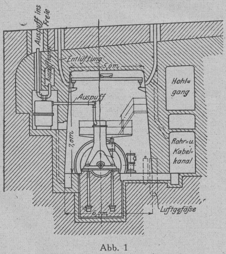 Polytechnische Schau. (Nachdruck der Originalberichte – auch im Auszuge – nur mit Quellenangabe gestattet.) Polytechnische Schau. Wärmekraftmaschinen. Fiat-Flugmotoren. Die bekannteste italienische Firma des Flugmotorenbaues sind die Fiat-Werke. Um bei Kriegsbeginn schnell und sicher einen brauchbaren Flugmotor bauen zu können, haben die Fiat-Werke in Turin zunächst den deutschen 100 PS-Mercedesmotor nachgebaut. Dieser Motor wird auch jetzt noch mit geringen Abänderungen als „Fiat A 10“ hergestellt. Auch der 240 PS-Fiatmotor „Fiat A 12“ erinnert hinsichtlich des allgemeinen Aufbaues an den deutschen Sechszylinder-Mercedes-Motor. Neuerdings hat die Firma einen neuen Flugmotor „Fiat A 15 R“ entworfen, dessen Leistung mit 400 PS angegeben wird. Die 12 Zylinder sind in zwei Reihen in V-Form angeordnet. Einschließlich der Ventile und der oben liegenden Steuerwellen ist der Motor ganz glatt verkleidet. Er erinnert dabei an den französischen Hispano Suiza-Motor. Die einzeln aus Stahl geschmiedeten Zylinder sind zu je drei in einem Block verschweißt. Jeder Zylinder hat vier Ventile. Der Antrieb der Steuerwellen geschieht durch Kegelräderpaare von der Mitte der Kurbelwelle aus. Die Kurbelwelle ist in 5 Gleitlagern mit Weißmetallausguß und in 2 Kugellagern an den beiden Enden gelagert. Die Kolben sind aus einer leichten Aluminiumlegierung hergestellt. Die Zylinderbohrung ist 120 mm, der Kolbenhub 150 mm. Das Vedichtungsverhältnis wird zu 5,5 angegeben, der mittlere Kolbenhub zu 7,7 kg/cm2. Die Kurbelwelle ist mit 58 mm hohlgebohrt. Durch die Bohrung kann mit einem Maschinengewehr hindurchgeschossen werden. Bei 1500 Uml./min. leistet er 400 PS, bei 2300 Umdrehungen dagegen wird die Leistung zu 425 PS. angegeben. Am Motor sind 4 Vergaser aus Aluminium angeordnet. Die Ansaugeleitung ist aus Stahlblech autogen geschweißt und ist so angeordnet, daß das Gemisch gut vorgewärmt wird. Der gewährleistete Brennstoffverbrauch wird zu 240 g PS-st, der gewährleistete Schmierölverbrauch zu 25 g PS-st angegeben. Für jeden Zylinder sind 2 Zündkerzen vorgesehen. Zur Beurteilung eines Flugmotors ist nicht nur das Gewicht für die Leistungseinheit, sondern auch das Gewicht je Liter Hubvolumen von Bedeutung. Die folgende Zusammenstellung enthält die dementsprechenden Vergleichsziffern bekannter Flugmotoren. Aus dieser Zusammenstellung geht hervor, daß hinsichtlich des Gewichtes je Liter Hubvolumen der Fiat A 15 R-Motor keine besseren Verhältnisse aufweist und mit den deutschen Motoren der letzten Zeit auf gleicher Stufe steht, aber dem Liberty-Motor, dem Sternmotor von Salmson und insbesondere den Umlaufmotoren unterlegen ist. Das Gewicht für 1 PS ist aber beim A 15 R-Motor am kleinsten. Der neue Motor muß aber erst im Dauerbetrieb seine Ueberlegenheit und Betriebssicherheit beweisen, was anderen Motoren, auch dem Hispano-Suiza-Motor, gegenüber den deutschen Motoren nicht gelungen ist. Textabbildung Bd. 336, S. 133 Motor; Leistung; Hubvolumen; Verdichtungsverhältnis; Gesamtgewicht; Gewicht je PS; Gewicht je Liter Hubvolumen; Bemerkungen; Benz (Bz. IV); Daimler (D. IV a); Argus (As. III); Hispano Suiza; Renault; Benz (Bz. III b); Daimler (D. II); Rolls Royce; Fiat A 15 R; Maybach (hMb. IV a); Bayern-Motor (B. M. W. III a); Beardmore; Liberty; Salmson; Göbel (Gö. III); Oberursel (V. R. III); mit gußeisernen Zylindern; mit Stahlzylindern; Achtzylinder in V-Form; Zwölfzylinder in V-Form; mit Getriebe; Zwölfzylinder in V-Form; Zylinder in Sternform; Umlauf. (Der Motorwagen 1921, S. 58–60). W. Dieselmaschinen für Festungswerke. Bei richtig arbeitender Maschine sind die Auspuffgase farblos und können an jeder Stelle des Festungswerkes abgeleitet werden. Da die Dieselmaschinen sehr betriebssicher arbeiten und die Explosionsgefahr des Brennstoffes und Schmieröles hierbei eine sehr geringe ist, so können die Maschinen in bombensicheren Zentralen angeordnet werden. Bereits im Jahre 1908 erhielt die Helgoländer Verteidigungsanlage als erste ihrer Art Dieselmaschinen. Die dann weiter ausgebaute Anlage hat während des Krieges die Gegner in vorsichtigem Abstande von Helgoland gehalten. Sie ist nach dem Diktate von Versailles dem Abbruche verfallen. Zu den vier Doppeltürmen (mit je zwei 30,5 cm Flachbahngeschützen), die in zwei Gruppen mit je 2 Türmen angelegt sind, gehören zwei bombensicher angelegte Maschinenzentralen. Die zwei Anlagen sind dazu bestimmt, das für den hydraulischen Antrieb der Türme notwendige Druckwasser zu liefern und die gesamten Werkanlagen, Türme, Munitions- und Mannschaftsräume, Kraftzentralen mit Beleuchtung und Lüftung zu versorgen. Für die gesamten Anlagen sind 5 Pumpwerke vorgesehen. Jede Dieselmaschine leistet bei 165 Uml/min. 345 PS. Zur Maschinenanlage gehören außerdem noch eine Dieseldynamo von 90 PS bei 200 Uml min., eine von 250 PS bei 160 Uml min. und eine solche von 150 PS bei 300 Uml min. Während des Krieges ist noch eine 300 PS und eine 250 PS-Maschine aufgestellt worden. Die Anlagen waren im Stande, 940 kW zu erzeugen. Die elektrischen Maschinen wurden von den Siemens-Schuckert-Werken geliefert. Textabbildung Bd. 336, S. 134 Abb. 1. Für die Bemessung der Pumpwerke war der Druckwasserbedarf der Türme maßgebend. Bei einer Feuergeschwindigkeit von 3,5 Schuß für Rohr und Minute sind 37 l sek. notwendig. Der Wasserdruck ist 60 at. Somit ergibt sich eine Pumpenleistung von 239 PSe und eine Maschinenleistung von 345 PSe. Die Abb. 1 zeigt das Querprofil der Zentrale. Die Zentrale ist 70 m lang, 7 m hoch und unten 6 m breit. Der Laufkran hat eine Tragfähigkeit von 3000 kg. Der Raum für die Zentrale wurde durch Sprengung erhalten. Die im Juli 1914 in Helgoland ausgeführten Abnahmeversuche bei einer 150 PSe Dieseldynamo ergaben bei Vollast einen Brennstoffverbrauch von 195 g für 1 PSe/st. Der Einblasedruck betrug 60 at. Abb. 2 zeigt das Diagramm für die Dieselmaschine und für die Pumpe bei Vollast. Die Pumpenleistung wurde dabei