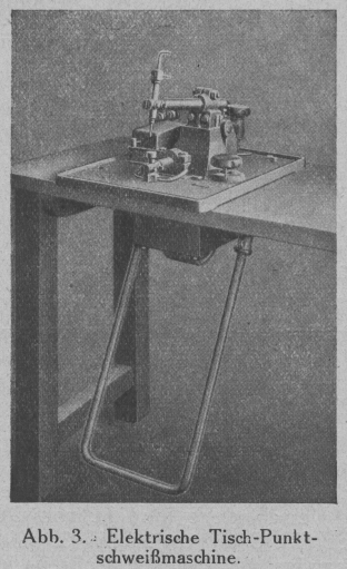 Die im Betriebe vorgeführte Tisch-Punkt-Schweißmaschine (Abb. 3) dient dazu, kleinere Metallteile von einer Gesamtstärke bis 1,5