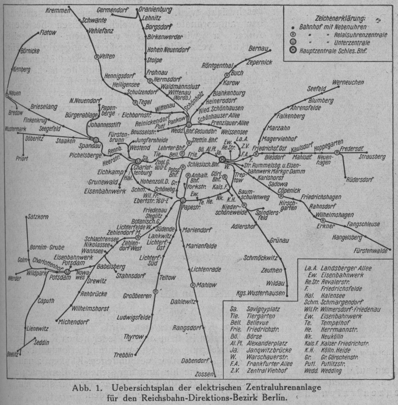 Die elektrische Zentraluhrenanlage umfaßt, wie aus Abb. 1 hervorgeht, das gesamte Gebiet des Berliner