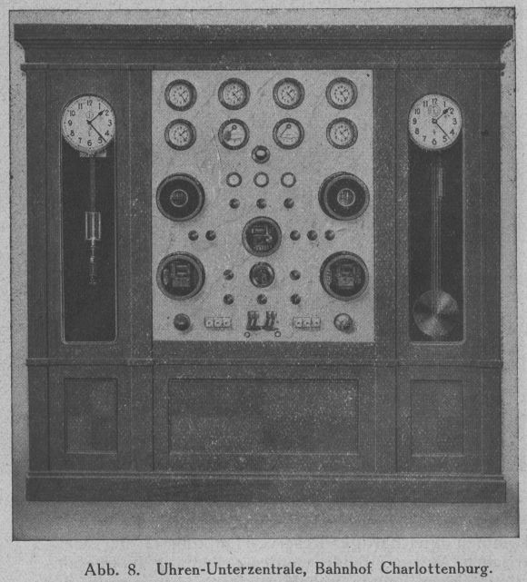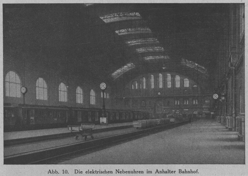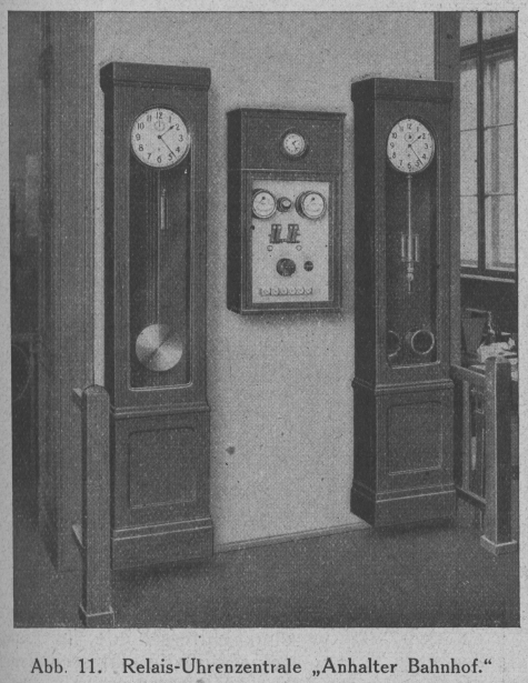 Nebenuhren im Anhalter Bahnhof. Die zu letzteren gehörige Relaisuhren-Zentrale ist auf Abb. 11