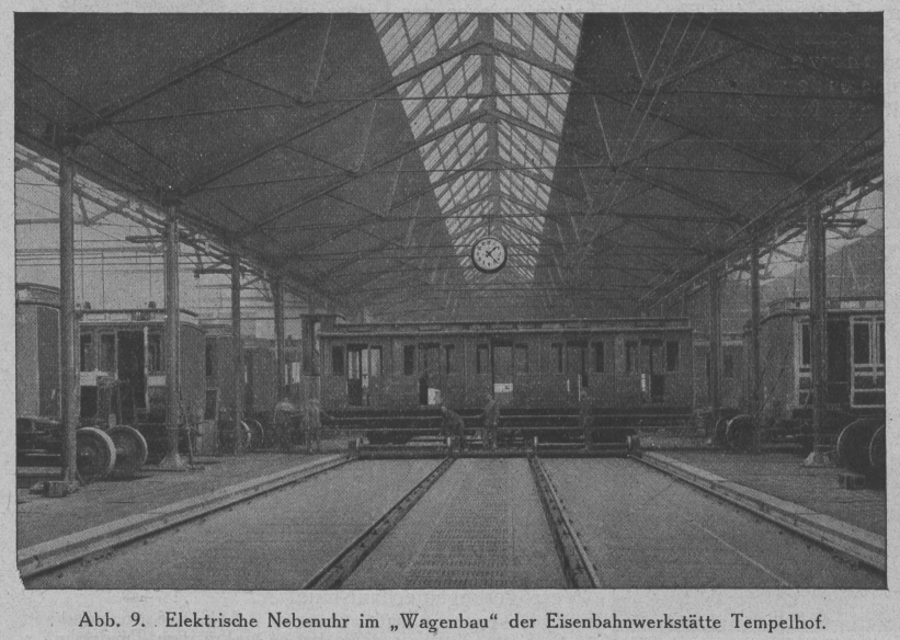 Pausensignalanlagen an die Uhrenzentrale angeschlossen sind. Abb. 9 zeigt die Nebenuhr im „Wagenbau“ der