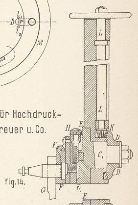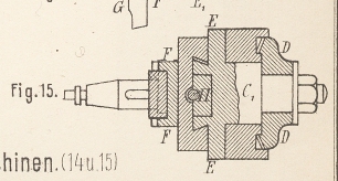 eines Handrades durch die Welle L und dem Rädchen K bethätigt wird, wodurch der Stahl G schräg gestellt und im Kreise geführt wird.