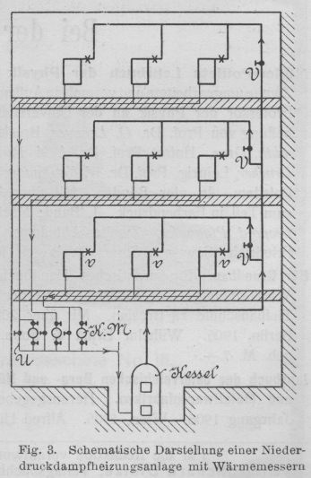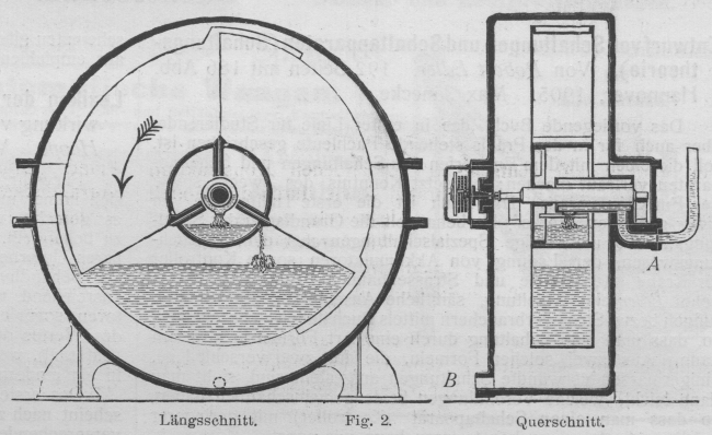 Kleinere Mitteilungen. Kleinere Mitteilungen. Apparat zur Bestimmung der aus Zentralheizungen entnommenen Wärmemengen. Die Anwendung der Zentralheizungen mit ihren Vorzügen, in Sonderheit der Niederdruckdampfheizung, für Mietshäuser findet man nur sehr vereinzelt. Gewöhnlich wird die relativ teure Wasserheizung, und zwar als Etagenwarmwasserheizung ausgebildet, zur Ausführung gebracht. Damit sind aber Nachteile von nicht geringer Tragweite verknüpft. Als solche sind zu nennen: 1. Erhöhte Feuersgefahr durch mehrere Feuerstellen. 2. Grössere Russ- und Staubbelästigungen durch den Transport des Brennstoffes und der Rückstände nach bezw. von den Etagen. 3. Erhöhte Bedienung durch Anfeuern und Wartung der Feuerstellen. 4. Erhöhte Betriebskosten für den einzelnen Mieter. Alle diese Misstände fallen weg bei Versorgung genannter Gebäude mit Wärme von nur einer im Keller gelegenen Feuerstelle aus. Die Etagenheizung ist doch im Grunde nichts anderes als eine Lokalheizung, wenn auch im weiteren Sinne. Textabbildung Bd. 321, S. 223 Fig. 1. Ansicht des Wärmemessers. Ein Hauptgrund, der gegen die Einführung der Niederdruckdampfheizung spricht, dürfte nicht zuletzt in der nicht gerechten Festlegung der Wärmekosten für den einzelnen Mieter liegen. Eine gleichmässige Verteilung derselben, selbst unter Zugrundelegung des Wärmebedarfes führt zu Ergebnissen, die der Wirklichkeit nicht entsprechen, denn man darf nicht übersehen, dass nicht immer alle Räume gleichzeitig geheizt und gleichmässig auf der vollen Temperaturhöhe gehalten werden. Dieser bestehende Mangel wird aber völlig beseitigt durch Einfügung von Kondenswassermessern in das System. Diese Apparate bringen alle Aenderungen der Raumerwärmung zum Ausdruck, indem sie genau diejenigen Kondenswassermengen, die sich in den Heizkörpern niedergeschlagen haben, und damit auch die von letzteren tatsächlich abgegebenen Wärmemengen messen. Die Einrichtung und Wirkungsweise des Apparates ist folgende: In einem gusseisernen Gehäuse (s. Fig. 1 und 2) befindet sich eine rotierende Messtrommel, deren drei Kammern sich nach einander füllen und entleeren und deren Umdrehungen auf das aussen angebrachte Zählwerk übertragen werden, welches zu jeder Zeit ersichtlich macht, wieviel Liter Niederschlagwasser durch den Apparat geflossen sind. Das zu messende Wasser gelangt bei A (Fig. 2) in den Apparat und weiter durch ein die Trommelachse umgebendes Rohr in den inneren Zylinder der Messtrommel. Aus diesem Zylinder fliesst das Wasser durch eine schmale Spalte in die am tiefsten stehende Trommelkammer, welche sich dadurch genau senkrecht unter die Mittellinie der Achse einstellt, eine Drehung der Trommel findet jetzt nicht statt. Ist nun die Kammer vollständig gefüllt, so steigt das Niveau des Wassers im inneren Zylinder an, bis das Wasser durch die nächste Spalte in die zweite (linke) Trommelkammer überfliesst. Die hier sich ansammelnde Wassermenge bewirkt nunmehr eine Verlegung des Schwerpunktes der Trommel nach links und letztere beginnt infolgedessen sich in der durch den Pfeil angegebenen Richtung zu drehen. Hierdurch wird die Einströmungsspalte der ersten Kammer so hoch gehoben, dass ein weiteres Eindringen von Wasser in die Kammer nicht mehr stattfinden kann. Im ferneren Verlauf der Trommeldrehung senkt sich die an der Peripherie der Trommel befindliche Ausflussöffnung der ersten Kammer so tief, dass das in dieser Kammer befindliche Wasser in den unteren Teil des Gehäuses ausfliesst, von wo es bei B durch ein Abflussrohr weiter geführt wird. – An Stelle der ersten Kammer tritt nun die zweite Kammer und es wiederholt sich der beschriebene Vorgang. Hierauf folgt die dritte Kammer usw. Textabbildung Bd. 321, S. 223 Fig. 2. Längsschnitt; Querschnitt. Bei den kleinsten vorwiegend in Betracht kommenden Apparaten z.B. fasst jede Kammer genau 2 Liter. Nach jeder Kammerschüttung rückt also das Zählwerk um 2 Liter weiter, und die Messtrommel vermag bei diesem Apparat bis 200 Liter Kondenswasser in einer Stunde zu vermessen. Das gemessene Kondenswasser wird ausserdem auf + 4° C reduziert angegeben. Eine Filtrierung oder Kühlung des Wassers ist nicht erforderlich. Letztere würde auch nur unvorteilhaft sein. Sie bedingt einen entsprechend unwirtschaftlichen Betrieb. Textabbildung Bd. 321, S. 223 Fig. 3. Schematische Darstellung einer Niederdruckdampfheizungsanlage mit Wärmemessern. Die nebenstehende Skizze (Fig. 3) zeigt die schematische Darstellung eines mehrgeschossigen Mietshauses mit eingeschalteten Wassermessern. Vom Niederdruckdampfkessel wird eine Dampfleitung bis in das oberste zu beheizende Geschoss geführt. Von diesem Hauptstrange zweigt in jeder Etage eine Dampfleitung ab, die den Dampf den einzelnen Heizkörpern zuführt. Mittels der Absperrventile V können die Etagen unabhängig von einander betrieben werden. Dass jeder Heizkörper ein besonderes Regulierventil v erhält, ist selbstverständlich. Das Niederschlagwasser wird für jede Etage getrennt nach dem Kesselraum zurückgeleitet und muss, bevor es in den Kessel gelangt, den Kondenswassermesser KM passieren. Zweckmässig wird jeder Wassermesser mit einer Umgehung U ausgestattet, damit derselbe gegebenen Falles untersucht werden kann, ohne den Betrieb zu stören. Die Apparate haben nach vorgenommenen Untersuchungen im Dresdner Fernheizwerk, wo solche von der Firma Rietschel & Henneberg aufgestellt sind, gute Ergebnisse geliefert und die Wassermengen genau ermittelt. – Nebenher wird noch bemerkt, dass mit Hilfe der Wassermesser an Stelle der Niederdruckdampfheizung auch die Dampfwarmwasserheizung ohne Schwierigkeiten und ohne dass die eingangs niedergelegten Nachteile hervortreten, gesetzt werden kann. – Die Kondenswassermesser werden ausgeführt von der Firma Gebr. Siemens-Charlottenburg. W. Mehl-Dresden.    Berat. Heizungsingenieur. Die Temperatur des negativen Lichtbogenkraters. Während die Temperatur des positiven Kraters des elektrischen Flam