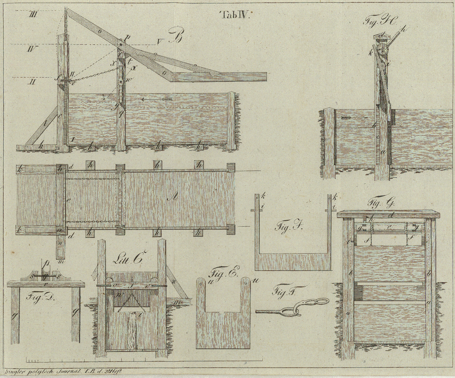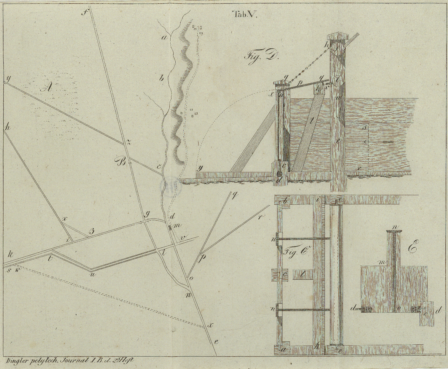 hoͤher steht, als der gewoͤhnliche Wasserstand im Kanal. Bei v ist ein eiserner Hebezapfen. Waͤchst nun der