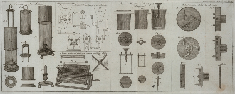 IV. Beschreibung eines verbesserten Gestelles zum Trocknen des Wollen-Werftes. Von Hrn. Georg Rhodes, zu Saddleworth bei Manchester. Aus den Transactions of the Society for the Encouragements of Arts, Manufactures et Commerce, im Repertory of Arts, Manufactures et Agriculture. II. Series. N. CCXXIII. December 1820. S. 40Der Uebersezer hat alles Ueberfluͤssige, Certificate und Zeugnisse etc. weggelassen.. Hr. Rhodes erhielt fuͤr seine Erfindung die silberne Isis-Medaille und zehn Guineen. Mit Abbildung Tab. I. Rhodes verbessertes Gestelle zum Trocknen des Wollen-Werftes. Hr. Rhodes erfand vor fuͤnf Jahren eine Maschine zum Trocknen des Wollen-Werftes, welche von allen aͤhnlichen bisher bekannten auf eine ausgezeichnete Weise verschieden ist, und mit welcher der Weber im Winter, unter den unguͤnstigsten Verhaͤltnissen, in ungefaͤhr drei Stunden mit dieser Arbeit fertig werden kann, waͤhrend er sonst fuͤnfzehn bis zwanzig Stunden zu derselben brauchte. Sein Gestell kann so gebaut seyn, daß es, wenn die Stube groß genug ist, mehr dann ein Werft zu fassen vermag. Das Werft wird auf das Gestell in walzenfoͤrmiger oder viereckiger Form aufgeschlagen, und jedes Werft wird von dem anderen durch Schieber, die in Ausschnitte der Arme des Gestelles eingelassen sind, getrennt. Durch das Umdrehen des Gestelles, welches mit der Hand oder auf irgend eine andere Weise geschehen kann, wird die Feuchtigkeit von dem Mittelpunkte nach dem Umfange getrieben, und die Waͤrme des Ofens wirkt allmaͤhlig und gleichfoͤrmig auf dieselbe. Das Werft wird auf hoͤlzerne Staͤbe aufgezogen, die ungefaͤhr ein Zoll im Gevierte betragen, und in Einschnitte der beiden Arme des Gestelles eingelassen werden, welche sich an beiden Enden einer Achse kreuzen, und mittelst der Hand vor einem Ofen gedreht werden. Die Brauchbarkeit dieser Trocken-Maschine bezeugen, nach Versuchen, welche sie mit derselben angestellt haben, die Hrn. Joh. Schoffield, Wilh. Wilson, Jak. Pontefract, alle drei zu Saddleworth. Fig. 14 auf der I. Tafel zeigt dieses Gestell von der Seite dargestellt, Fig. 17. im Querdurchschnitte. aa ist die Achse; b die Kurbel; cccc sind die an der Achse befestigten Arme; ddd die Querstangen, von welchen zwei abgenommen dargestellt sind in Fig. 16. Diese Stangen lassen sich in Einschnitten, welche in den Armen angebracht sind, hin- und herschieben, wie Fig. 15 zeigt. Die Weise, das Werft aufzuziehen, ist sehr einfach. Man faͤngt damit an, alle Querstangen herauszuziehen bis auf diejenige, welche der Achse am naͤchsten ist, legt das Ende des Werftes uͤber dieselbe, und waͤhrend man das Werft in einer Hand haͤlt, dreht man mit der anderen die Kurbel, und legt bei jeder Viertel-Umdrehung eine Querstange ein, bis das ganze Werft aufgezogen ist.