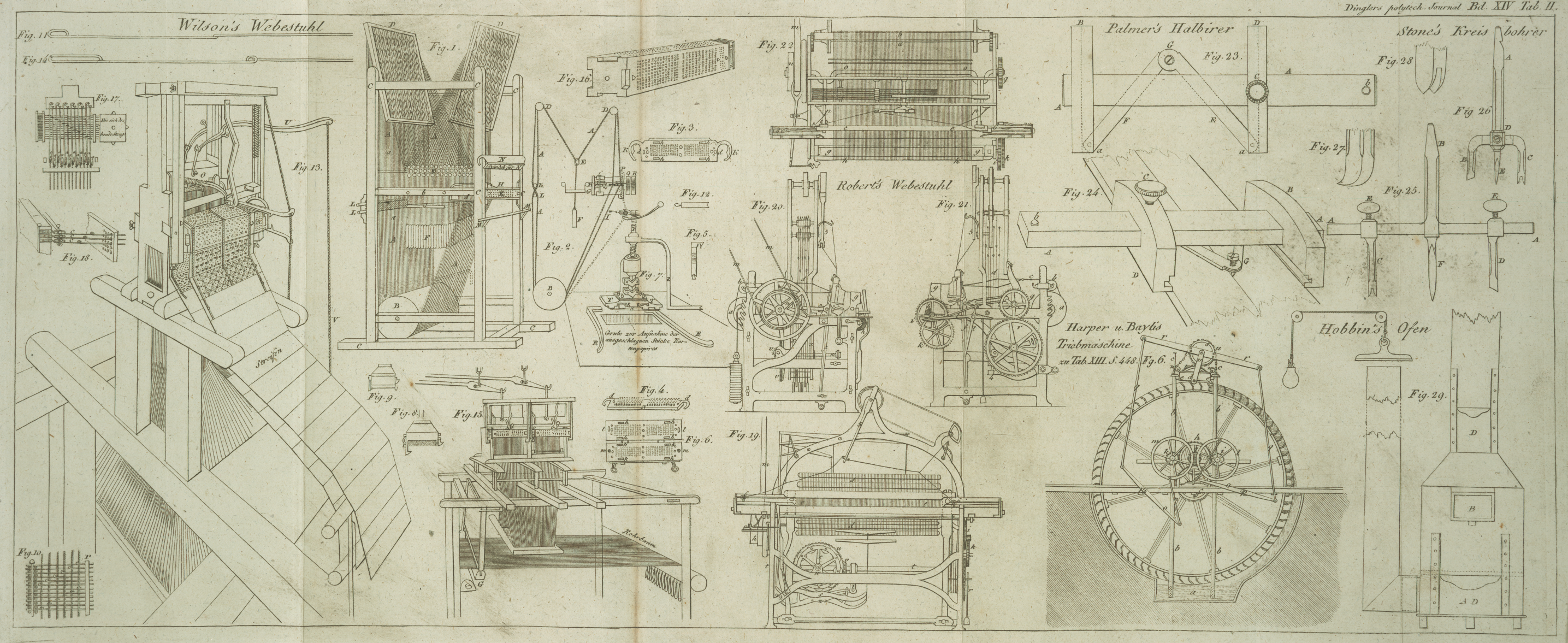 XIV. Verbesserung an den Maschinen zum Weben figurirter Zeuge; worauf Steph. Wilson, zum Theil nach Mittheilungen von Auslaͤndern, sich den
