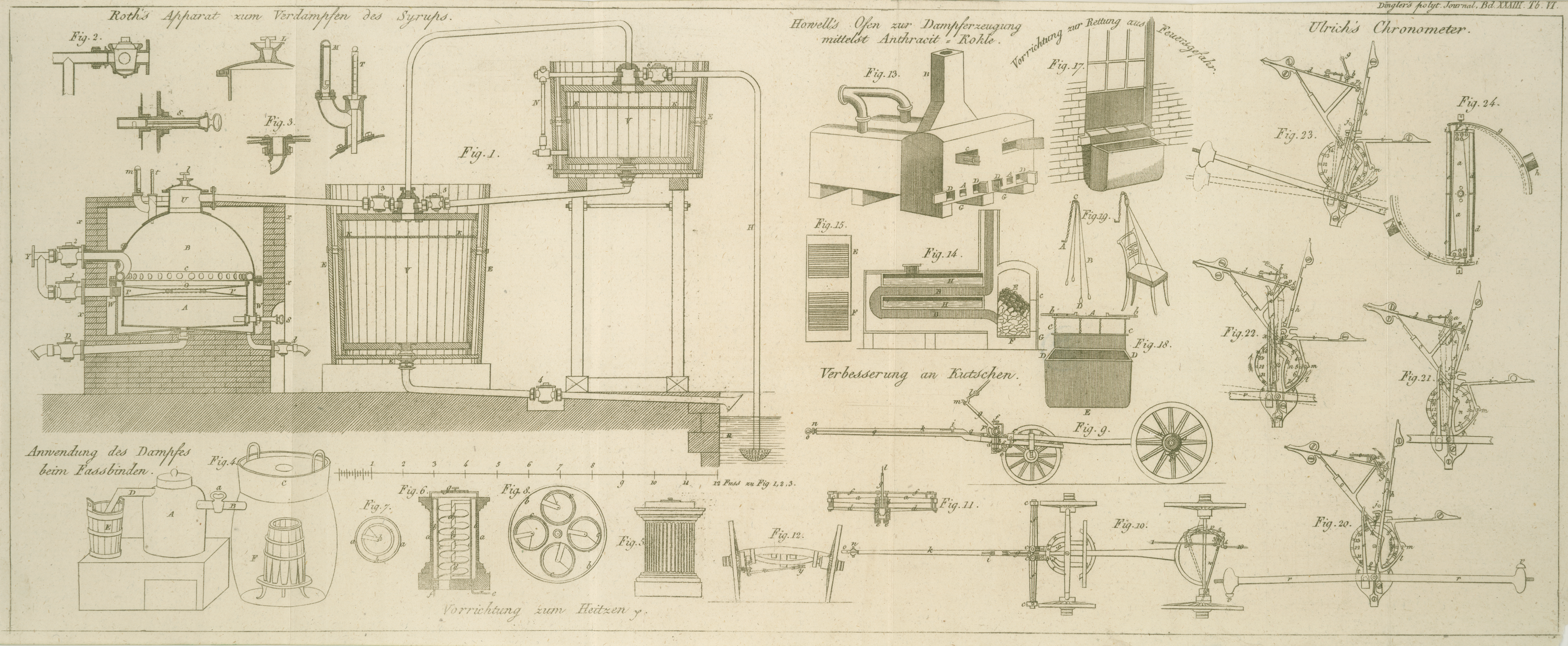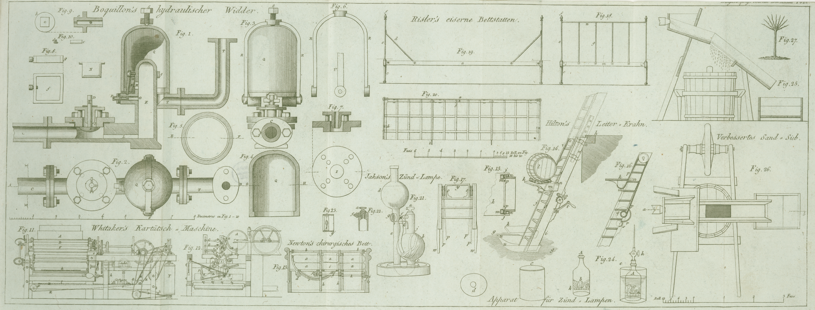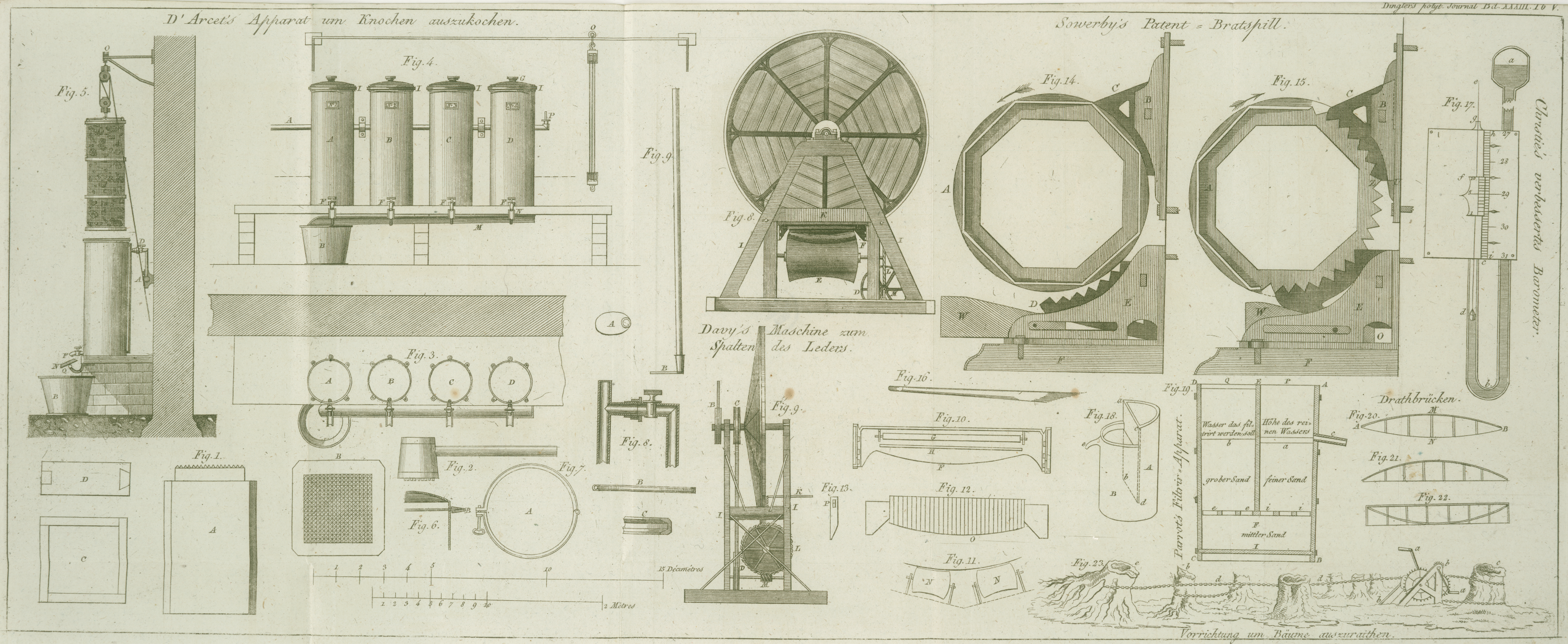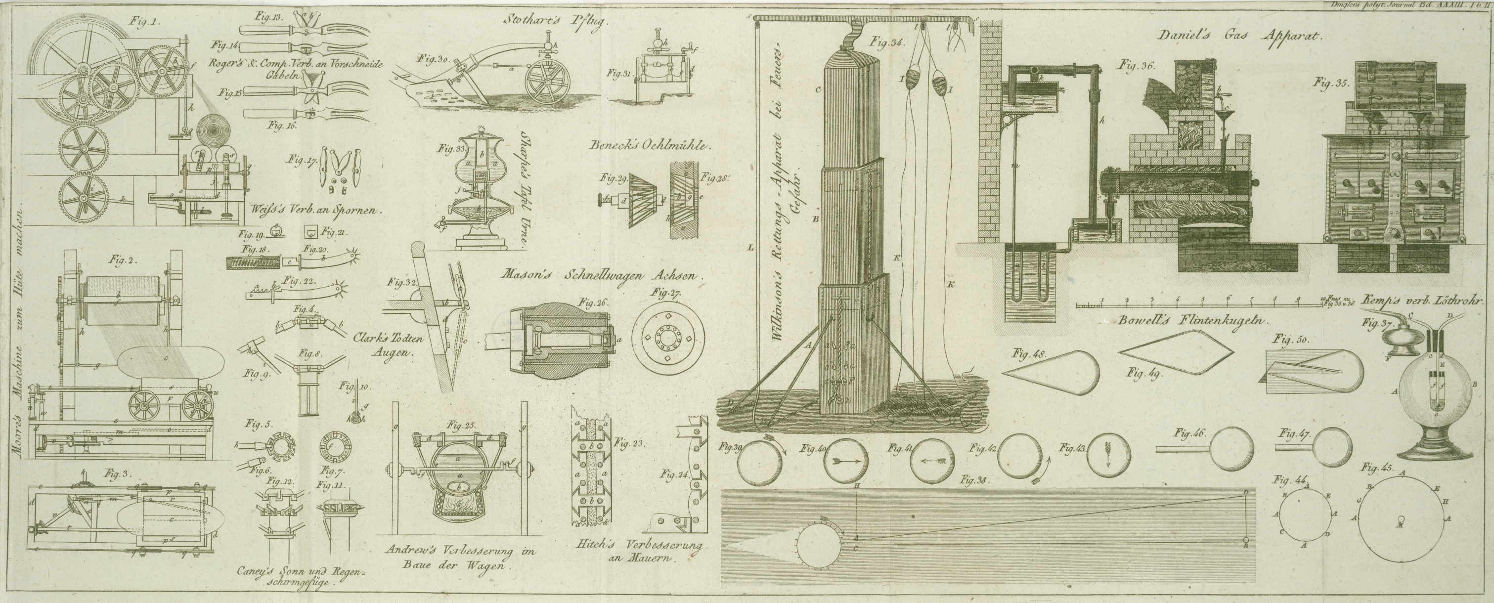 XXIV.Miszellen.Jahres-Bericht der Société industrielle de Mulhouse vom J. 1828. 68Ueber den gegenwärtigen Zustand des Fabrikwesens und des Handels. 69Ausfuhr der Manufakturen und Producte Großbritanniens vom Jahre 1814 bis 1828 inclusive nach officiellem und declarirtem Werthe. 70Ueber Perkinson's und Crosley's Patent-Vorrichtung zum Treiben der Maschinen. 74Ueber eine Maschine Flachs zu spinnen und zu verfeinern. 74Maschine zum Straßenkehren. 74Lieut. Wilh. Rodger's verbesserte Anker. 75Das Dampfboth, Potomac. 75Ueber S. Clegg's verbesserte Dampfmaschine 75Vergleichung der Kraft einer Dampfmaschine von Hrn. Risler und von den HHrn. Peel und Williams. 75Neue Art von Kanonen. 75Versuche mit dem Erdbohrer um Mülhausen. 75Ueber eine Heizungs-Methode zu Manchester. 76Zunahme des Umfanges des Guß-Eisens durch wiederholtes Heizen. 76Ueber südamerikanische Amalgamation. 76Ferdinand de Fonvielle's Patent-Filtrir-Apparat. 77Ueber die versteinernde Kraft des Wassers des Irawadi. 77Der Themse Stollen (Thames Tunnel). 77Kosten der Werfte zu Sheerneß. 77Winke für diejenigen, die sich des Eichmaßes oder der Schieber-Maßstabe bedienen. 78Goldmünze. 78Schnelligkeit englischer Traber und amerikanischer. 78Ueber die Obstbaumzucht in Italien. 79Litteratur.a) Deutsche. 79