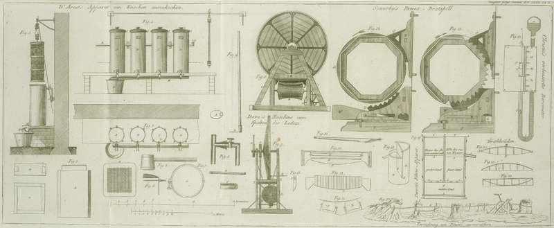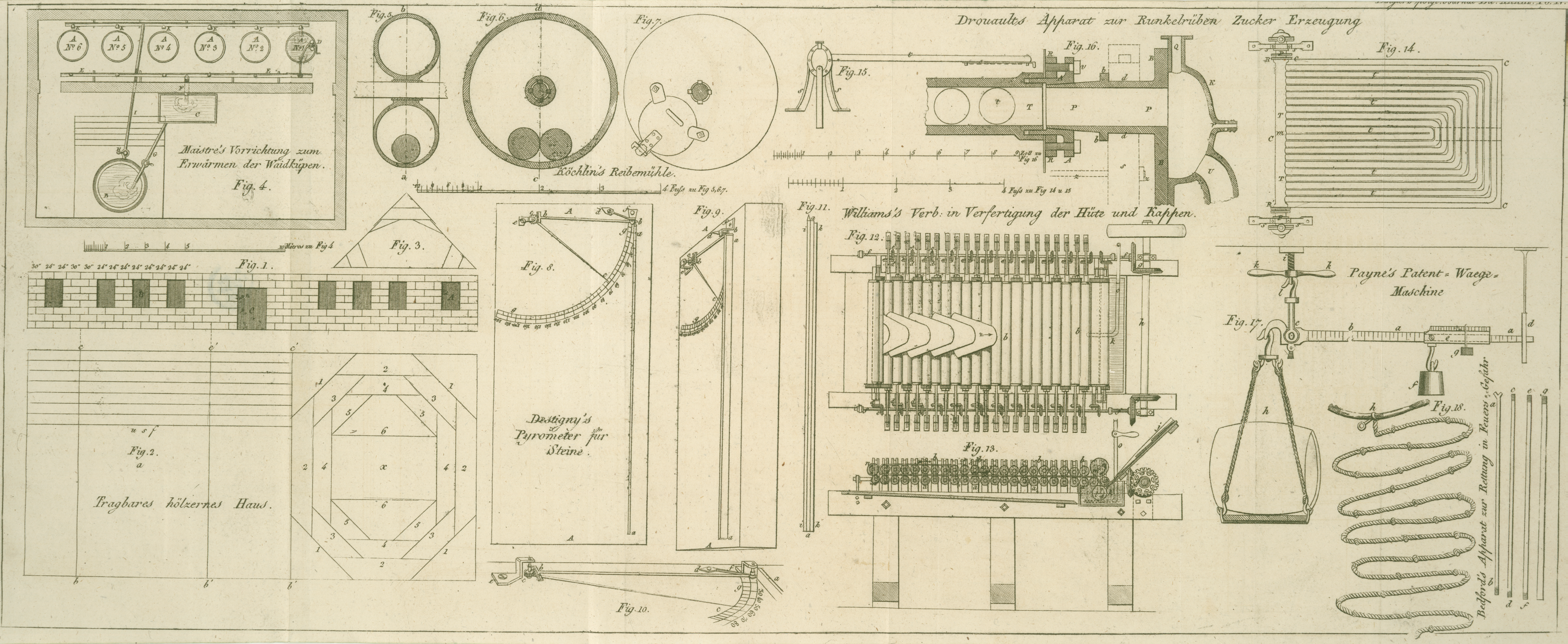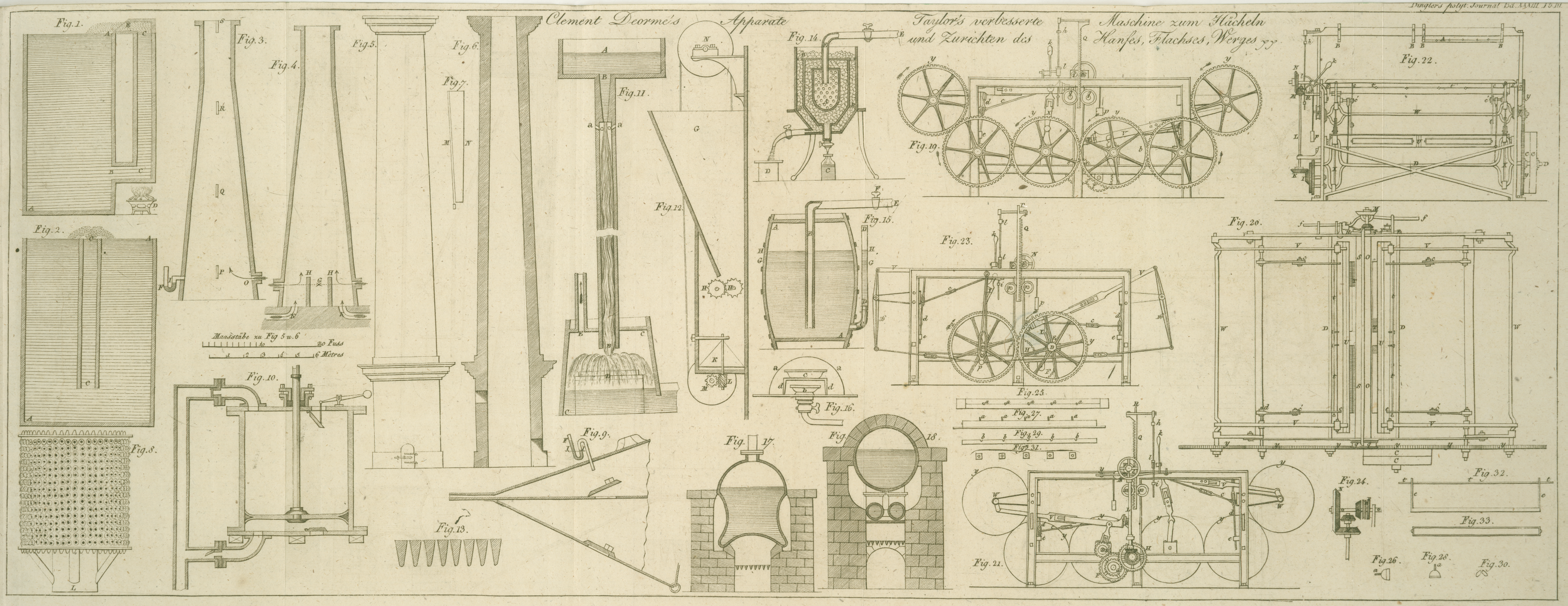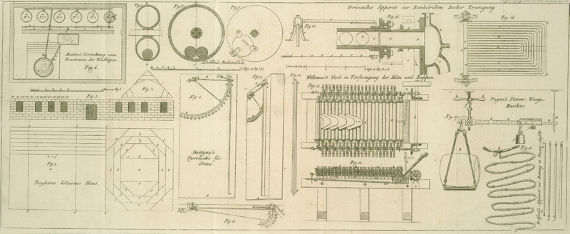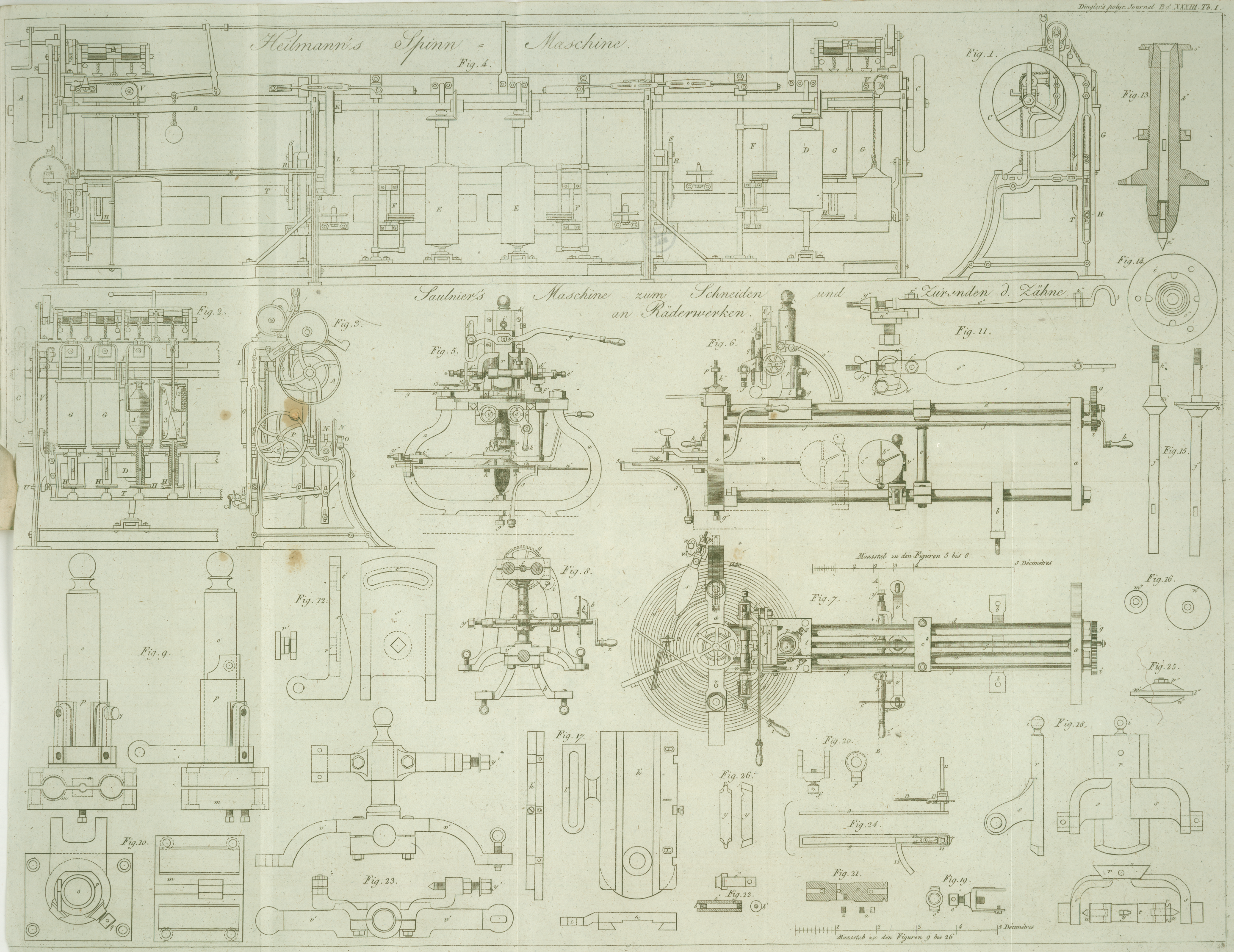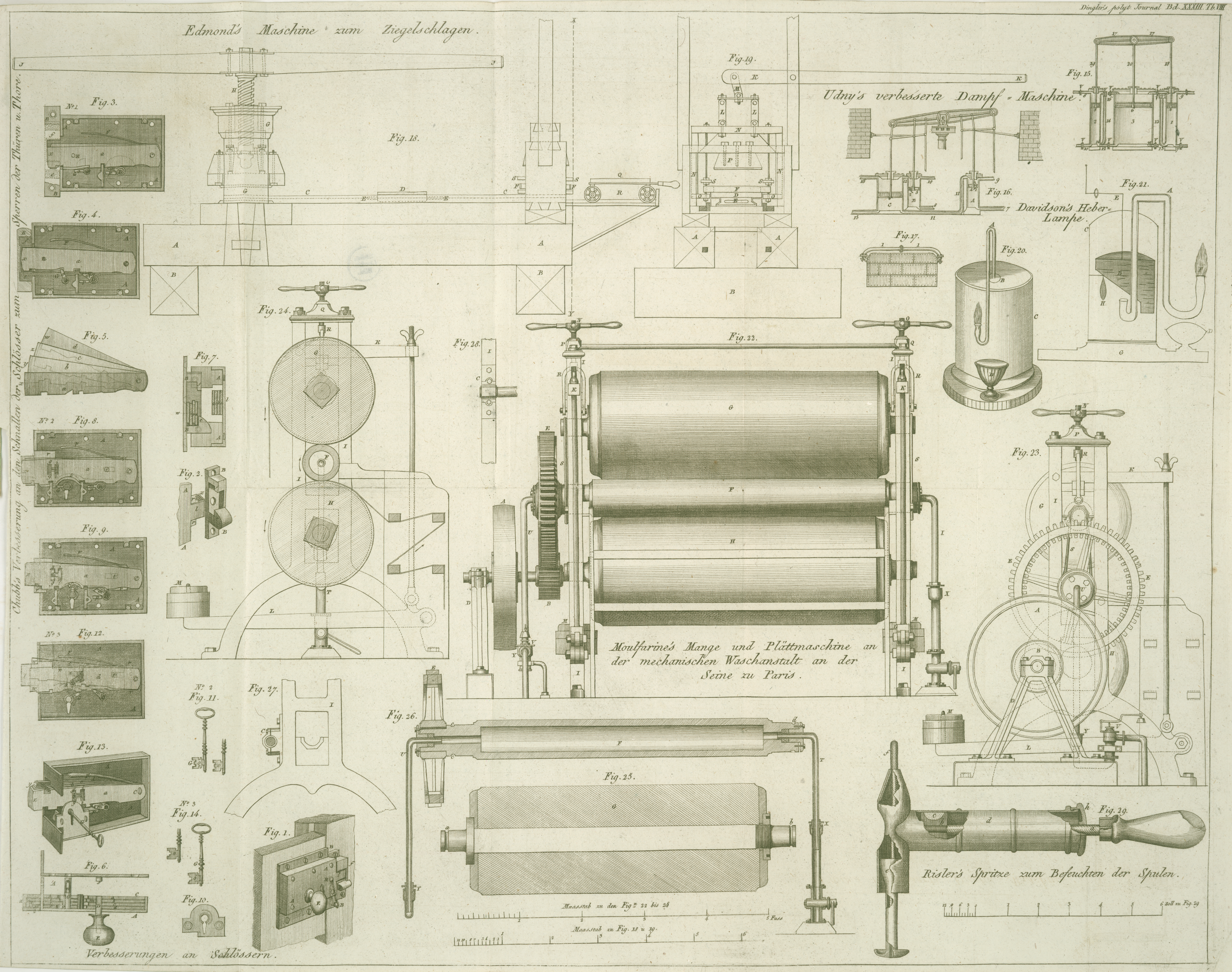 XXIV.Miszellen.Jahres-Bericht der Société industrielle de Mulhouse vom J. 1828. 68Ueber den gegenwärtigen Zustand des Fabrikwesens und des Handels. 69Ausfuhr der Manufakturen und Producte Großbritanniens vom Jahre 1814 bis 1828 inclusive nach officiellem und declarirtem Werthe. 70Ueber Perkinson's und Crosley's Patent-Vorrichtung zum Treiben der Maschinen. 74Ueber eine Maschine Flachs zu spinnen und zu verfeinern. 74Maschine zum Straßenkehren. 74Lieut. Wilh. Rodger's verbesserte Anker. 75Das Dampfboth, Potomac. 75Ueber S. Clegg's verbesserte Dampfmaschine 75Vergleichung der Kraft einer Dampfmaschine von Hrn. Risler und von den HHrn. Peel und Williams. 75Neue Art von Kanonen. 75Versuche mit dem Erdbohrer um Mülhausen. 75Ueber eine Heizungs-Methode zu Manchester. 76Zunahme des Umfanges des Guß-Eisens durch wiederholtes Heizen. 76Ueber südamerikanische Amalgamation. 76Ferdinand de Fonvielle's Patent-Filtrir-Apparat. 77Ueber die versteinernde Kraft des Wassers des Irawadi. 77Der Themse Stollen (Thames Tunnel). 77Kosten der Werfte zu Sheerneß. 77Winke für diejenigen, die sich des Eichmaßes oder der Schieber-Maßstabe bedienen. 78Goldmünze. 78Schnelligkeit englischer Traber und amerikanischer. 78Ueber die Obstbaumzucht in Italien. 79Litteratur.a) Deutsche. 79