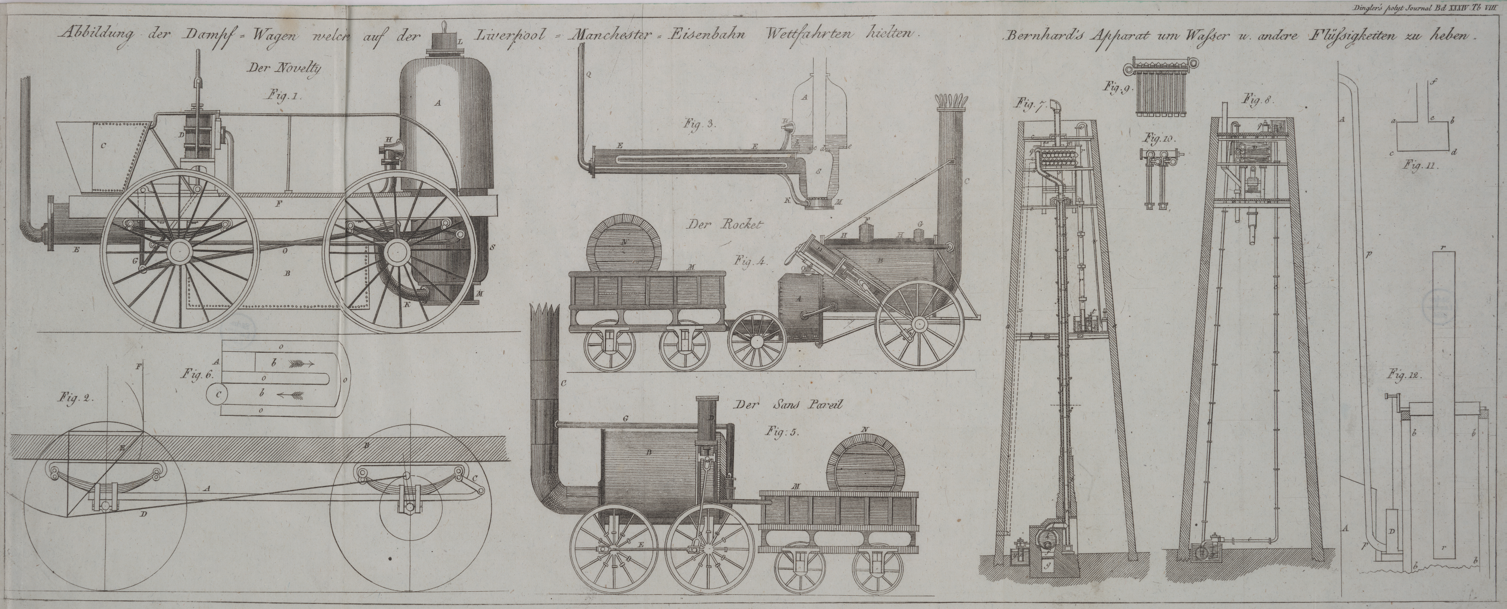 Wettfahrten auf der Liverpool-Manchester-EisenbahnDie Beschreibung und Abbildungen der Dampfwagen, welche bei diesen Wettfahrten