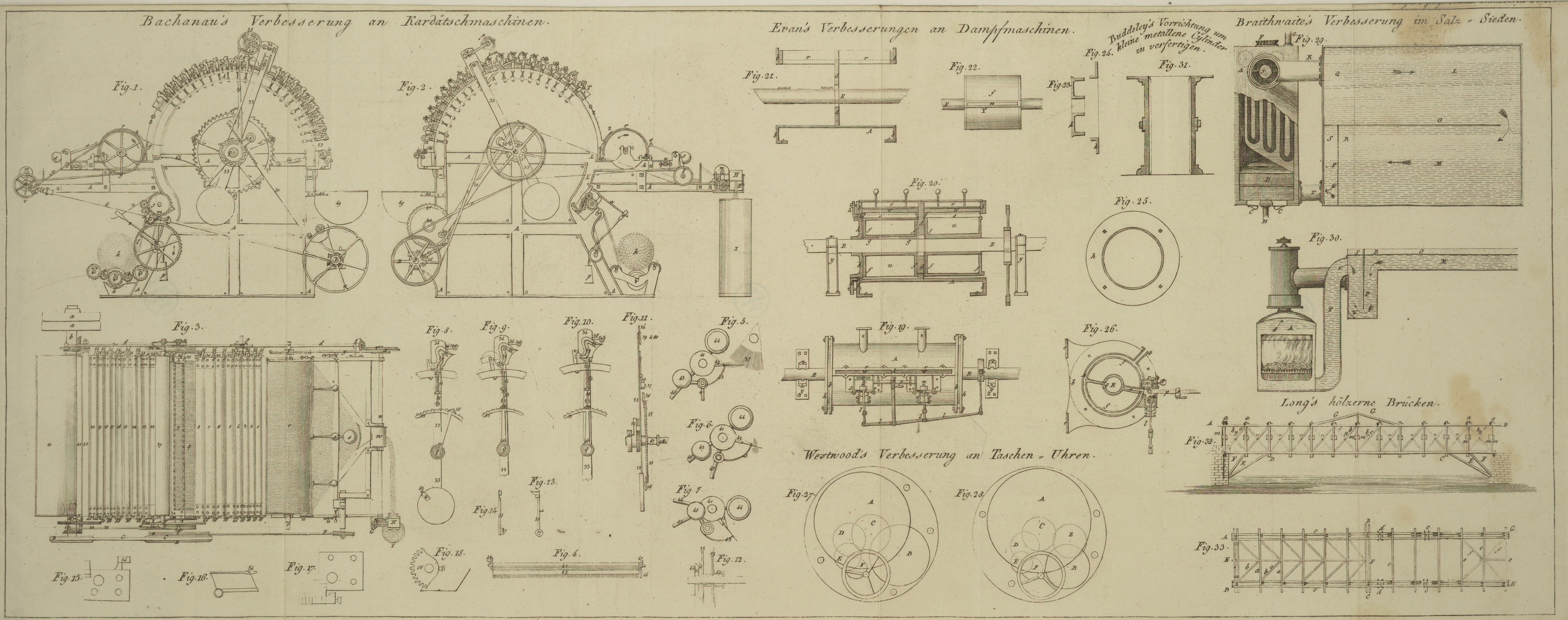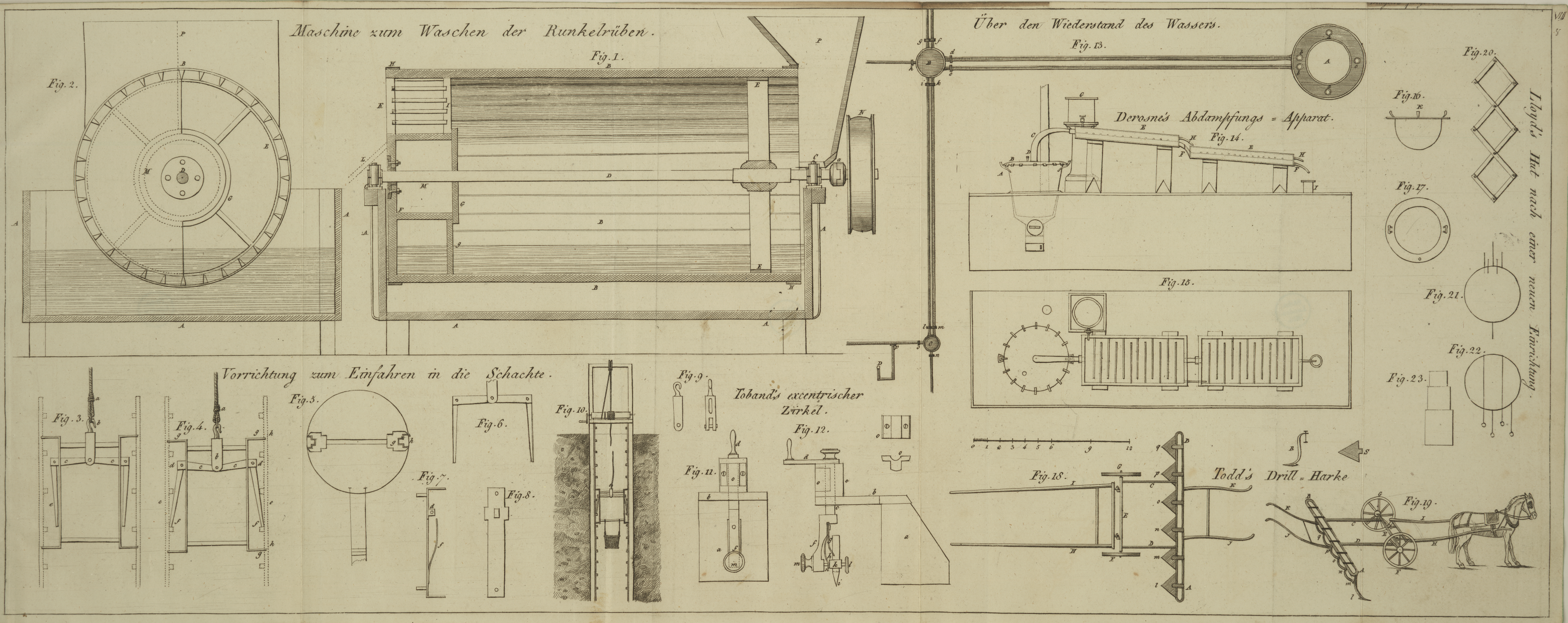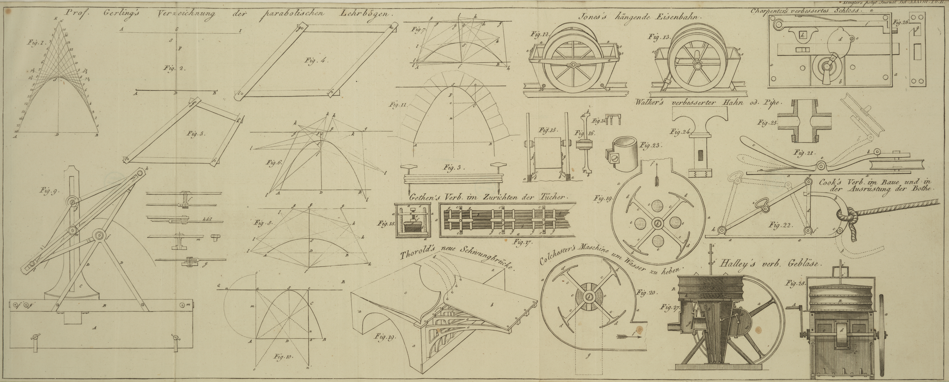 und Bohrmaschinen, Bortenweberei etc.), so wie auf 19 Kupfertafeln die Abbildungen zahlreicher