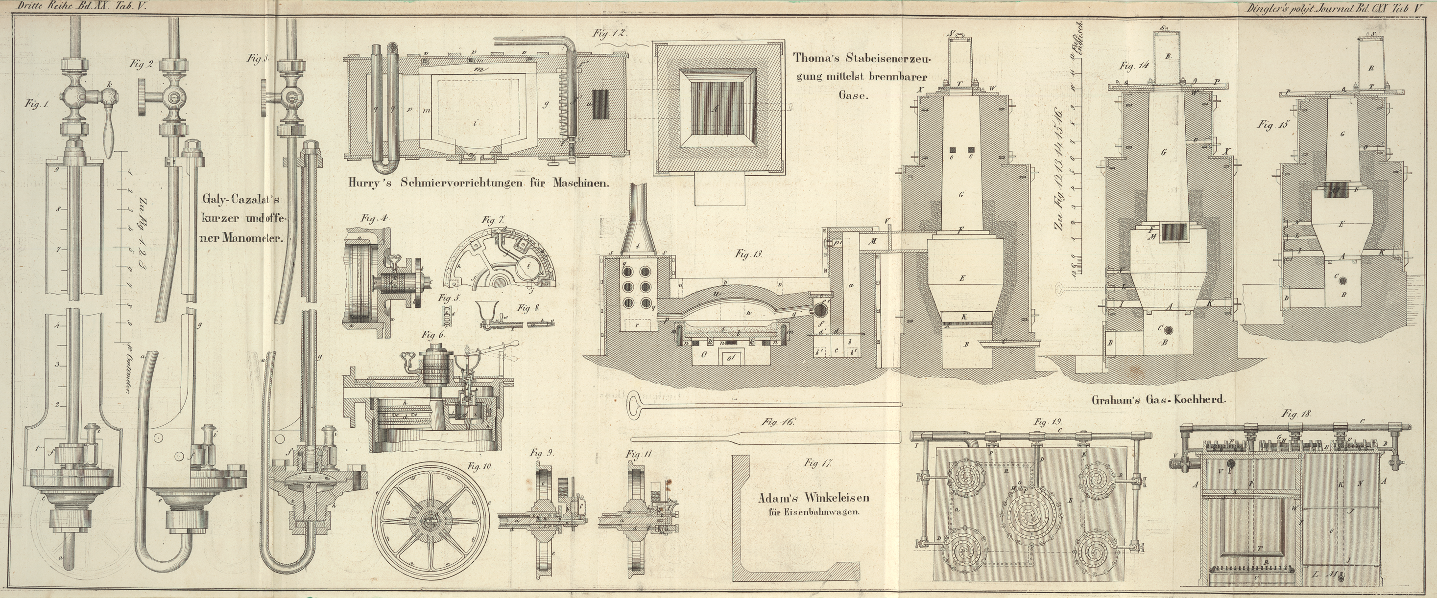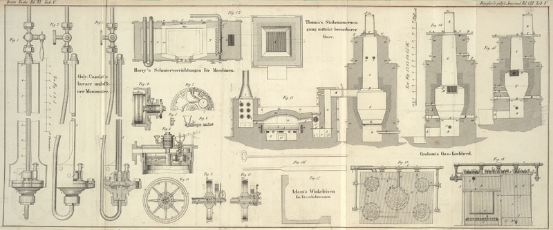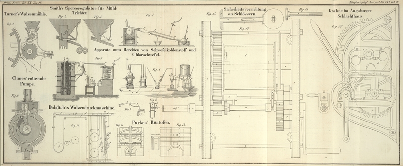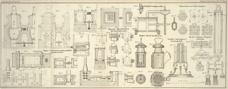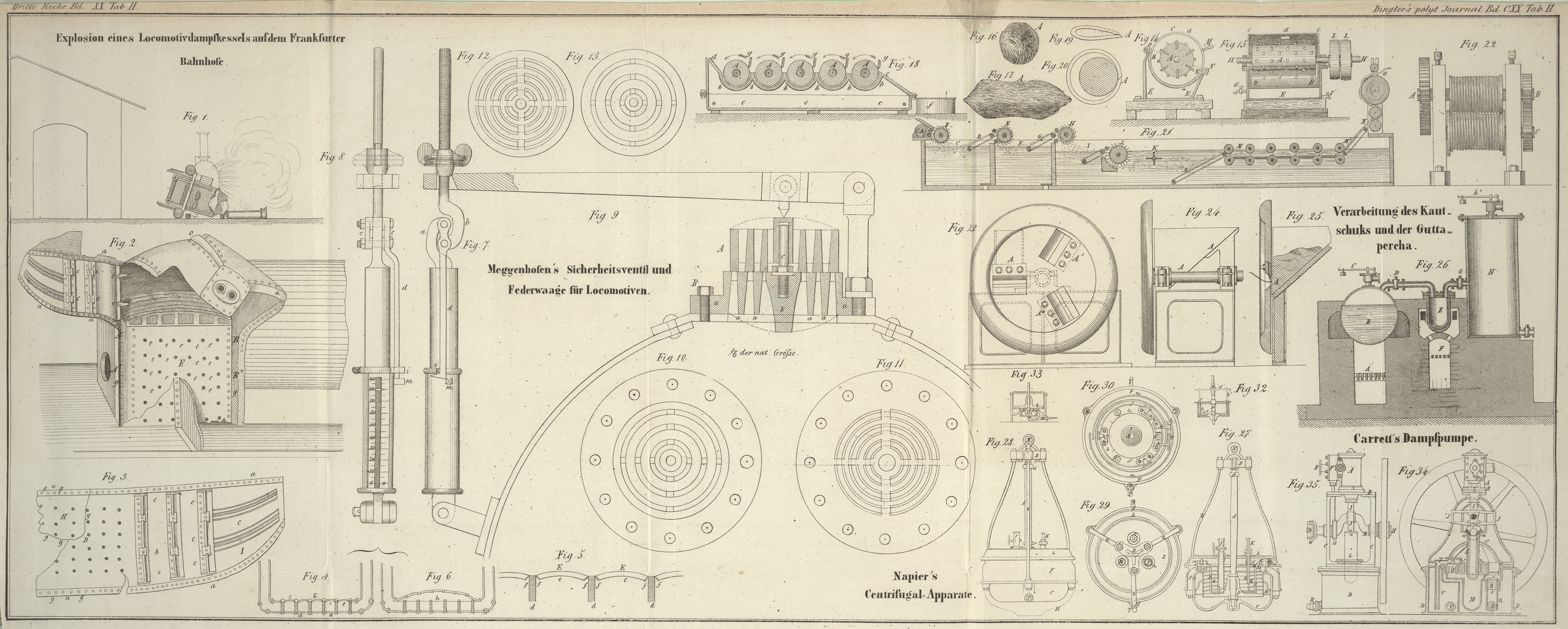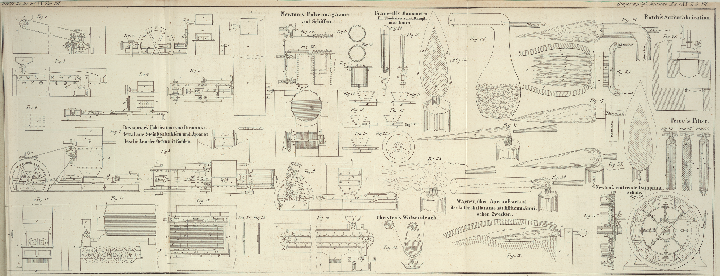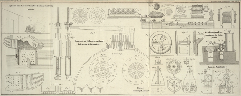 Miscellen. Ueber Pumpen. S. 74.Ueber das Tönen der Metallglocken. 74.Glastafeln mittelst Locheisen und Stanze zu lochen. 75.Angreifen harter Körper durch rotirende Papierstreifen. 75.Anwendung der Gutta-percha bei den Druckwalzen der Flachsspinnmaschinen. 75.Ueber das Krystallinisch- und Sprödewerden des Schmiedeisens durch fortgesetzte