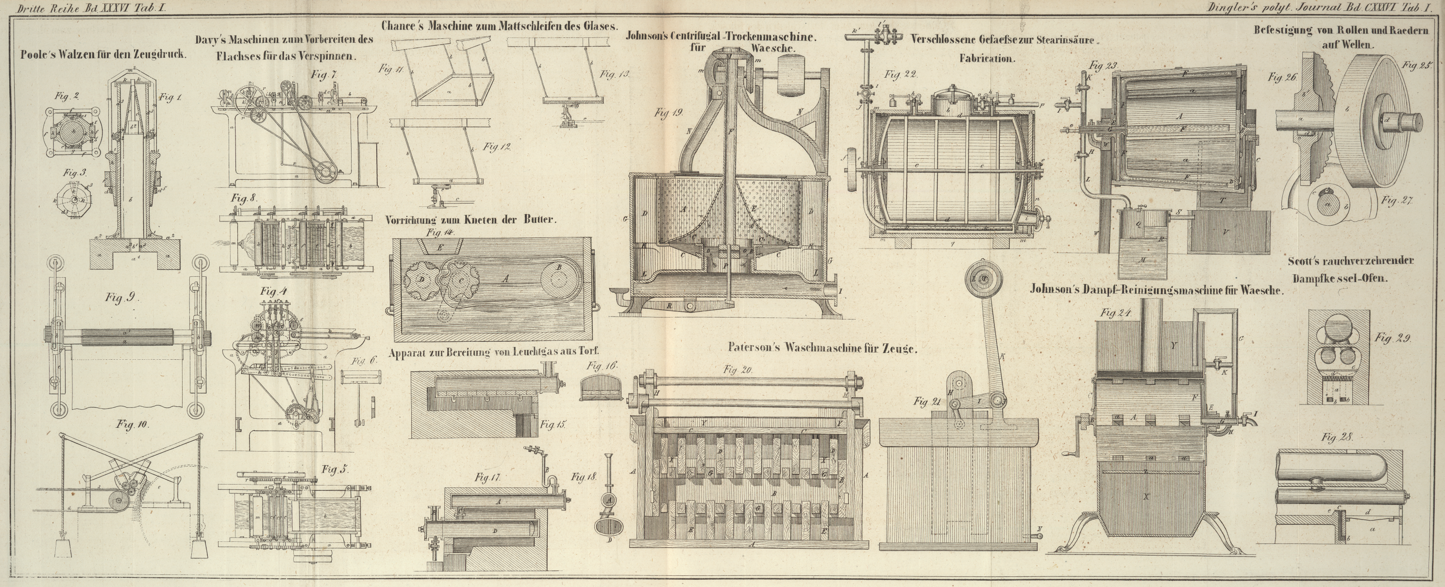 VI. Wasch-Maschine für Zeuge, welche sich J. Paterson zu Beverley am 10. März 1854 patentiren ließ. Mit Abbildungen auf Tab. I.