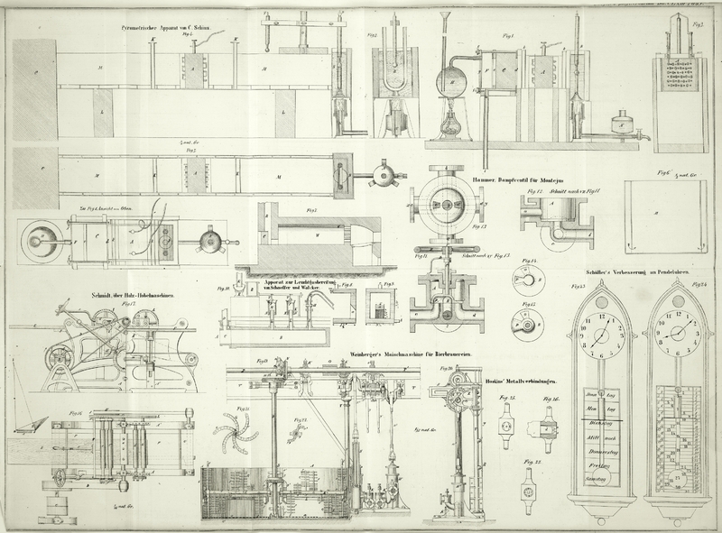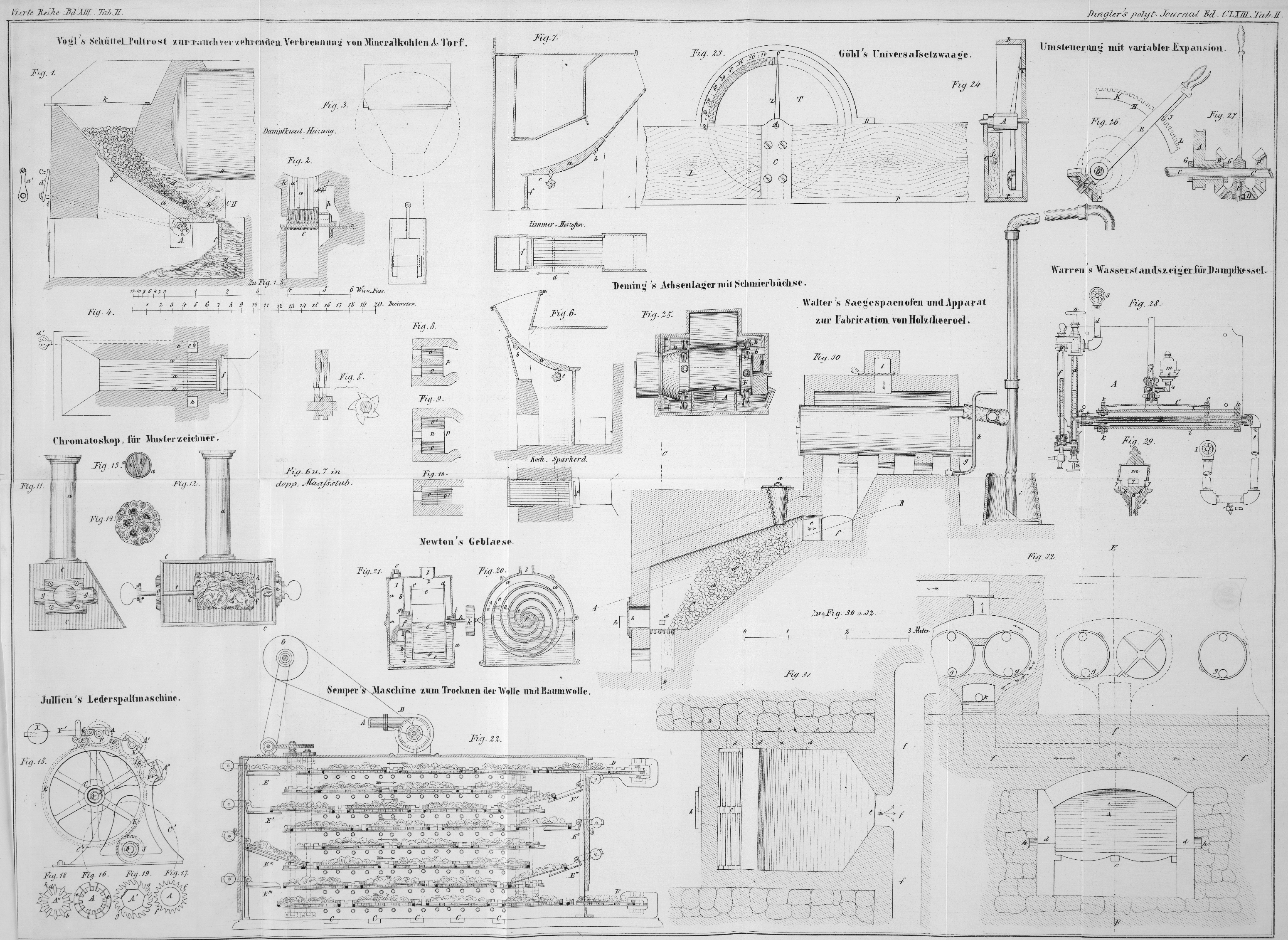 PolytechnischesJournal. HerausgegebenvonDr. Emil Maximilian Dingler. Vierte Reihe. Dreizehnter Band. Jahrgang 1862. Mit sechs Tafeln Abbildungen. Augsburg.Druck und Verlag der J. G. Cotta'schen Buchhandlung. PolytechnischesJournal. HerausgegebenvonDr. Emil Maximilian Dingler. Hundertdreiundsechzigster Band. Jahrgang 1862. Mit sechs Tafeln Abbildungen. Augsburg.Verlag der J. G. Cotta'schen Buchhandlung. Inhalt des hundertdreiundsechzigsten Bandes. Erstes Heft. I. Verbesserungen an der Giffard'schen Dampfstrahlpumpe; von Th. Hunt in Crewe, Cheshire. Mit Abbildungen auf Tab. I. 1 II. Einiges über locomobile Dampfmaschinen in constructiver und polizeilicher Hinsicht; vom Professor Rühlmann. Mit Abbildungen auf Tab. I. 2 III. Rändelmaschine für Münzen; von M. Jones, Beamter der königl. Münze in London. Mit Abbildungen auf Tab. I. 11 IV. Such- oder Fang-Apparat; von C. Glaser, Maschinen-Werkmeister. Mit Abbildungen auf Tab. I. 12 V. Ueber das Schneiden der Schrauben und Schraubenmuttern mittelst Kluppen und Bohrern; von W. Jeep, Ingenieur in Cöln. Mit Abbildungen auf Tab. I. 14 VI. Einfache Methode zum Schneiden der Holzschrauben; von W. Jeep, Ingenieur in Cöln. 19 VII. Verbesserungen in der Fabrication schmiedeeiserner und messingener Röhren; von C. Kesseler, Hütteningenieur in Greifswald. 22 VIII. Verbesserungen an Barometern, von E. A. L. Negretti und J. W. Zambra in London. Mit einer Abbildung auf Tab. I. 30 IX. Experimentelle Untersuchungen über die zum Schmelzen des Roheisens, ferner des Zinns, Bleies, Zinks, der Glockenbronze, des Geschützmetalls und des Messings erforderliche Wärme; von den Ingenieuren Minary und Résal. Mit einer Abbildung auf Tab. I. 32 X. Ofen für Sägespäne, Gerberlohe und anderes fein zertheiltes Brennmaterial, von André. Mit Abbildungen auf Tab. I. 41 XI. Ueber die Ventilation geschlossener Wohnräume; vom Regierungsassessor Marcard in Hannover. 42 XII. Ueber Heißwasserheizungen und Ventilation; von Johannes Haag, Civilingenieur und Besitzer einer Maschinen- und Röhrenfabrik in Augsburg. Mit einer Abbildung auf Tab. I. 50 XIII. Ueber eine Methode die Kohlensäure in der atmosphärischen Luft zu bestimmen; von Dr. Max Pettenkofer. 53 XIV. Beschreibung eines Apparats zum Auffinden mehrerer Säuren; von Pisani. Mit einer Abbildung auf Tab. I. 62 XV. Ueber die Bildung von salpetrigsaurem Ammoniak beim Verbrennungsproceß; von Prof. Böttger. 63 XVI. Wiedergewinnung der Alkalien und Säuren, welche in Mineralölfabriken zum Reinigen der Oele benutzt worden sind; von H. Perutz. 65 XVII. Verbesserungen in der Verseifung und Destillation der Fette; als Mittheilung patentirt für E. F. Hughes in London. Mit Abbildungen auf Tab. I. 67 XVIII. Selbstthätiger, intermittirender Aufgießapparat für Essigbildner. Mit Abbildungen auf Tab. I. 70 Miscellen. Regulativ, betreffend die Anlage von Dampfkesseln in Preußen. 71 Neue Art der Locomotivfeuerungen. 76 Verhütung von Steinabsatz in Dampfkesseln. 77 Verunglückungen auf Eisenbahnen. 77 Schmiervorrichtung an Wagenachsen. 78 Gewinnung comprimirter Luft als Triebkraft. 78 Ueber die Ergiebigkeit der artesischen Brunnen. 78 Ueber Schmelztiegel aus Speckstein. 78 Feilen des Glases mit Hülfe verdünnter Schwefelsäure. 79 Ueber die Entwickelung von Wasserstoffgas durch Zerlegung des Wassers mittelst eines Natriumkügelchens. 79 Verfahren um die Verfälschung von Bienenwachs mit Pflanzenwachs zu erkennen. 80 Gutachten einer Commission der französischen Akademie über Alkoholometrie. 80 Zweites Heft. XIX. Wasserstandszeiger für Dampfkessel, von S. W. Warren in Brooklyn (Nordamerika). Mit Abbildungen auf Tab. II. 81 XX. Umsteuerung mit variabler Expansion; beschrieben von O. Helmholtz. Mit Abbildungen auf Tab. II. 83 XXI. Universalsetzwaage von Gottlieb v. Göhl, Lehrer der praktischen Mechanik zu Landau. Mit Abbildungen auf Tab. II. 84 XXII. Achsenlager mit Schmierbüchse, von J. H. Deming in Paris. Mit einer Abbildung auf Tab. II. 87 XXIII. Maschine zum Abgleichen der Häute bei der Lederfabrication, von E. Jullien in Marseille. Mit Abbildungen auf Tab. II. 88 XXIV. Maschine zum Trocknen von Wolle und Baumwolle, vom Civilingenieur E. Semper in Görlitz. Mit einer Abbildung auf Tab. II. 89 XXV. Maschine zum Aussaugen und Comprimiren der Luft, als Mittheilung patentirt für W. E. Newton in London. Mit Abbildungen auf Tab. II. 91 XXVI. Ueber die Schlickeysen'sche Torfpresse; vom Bergmeister W. Leo. 92 XXVII. Der Schüttet-Pultrost zur rauchverzehrenden, vollkommeneren Verbrennung von Mineralkohlen und Torf; von Rudolph Vogl, k. k. Hüttenmeister in Joachimsthal. Mit Abbildungen auf Tab. II. 96 XXVIII. Ueber einen neuen Sägespänofen und die Fabrication von rohem Holztheeröl; von Conrad Walter, technischer Chemiker aus Augsburg. Mit Abbildungen auf Tab. II. 104 XXIX. Das Chromatoskop, ein neuer Apparat für Musterzeichner. Mit Abbildungen auf Tab. II. 106 XXX. Ueber Becquerel's galvanische Batterie, eine Combination von Zink, Blei und schwefelsaurem Bleioxyd; von E. H. Worlée in Hamburg. 108 XXXI. Der Inductionsmagnetismus des Eisens und sein Verhältniß zur Boussole; von R. Wabner. Mit einer Abbildung. 111 XXXII.Lang's Verfahren zum Verschmelzen von Eisenfrischschlacken. 116 XXXIII. Ueber die Bestimmung des Kohlenstoffs im Eisen; von W. Weyl. 120 XXXIV. Anwendung des natürlichen Schwefelantimons zur Darstellung einer weißen und einer gelben Anstrichfarbe; von Dr. John Stenhouse und George Hallett. 123 XXXV. Ueber die Producte der Einwirkung der Luft und des Ammoniaks auf metallisches Kupfer, und über die Darstellung eines als Malerfarbe anwendbaren blauen Kupferoxydhydrats; von E. Peligot. 125 XXXVI. Werthbestimmung zweier Thone und eines Sandsteins in feuerfester Hinsicht; von Dr. Carl Bischof. 127 XXXVII. Ueber die Patentbrenner von Oldfield und Dixon; von Dr. C. Stammer. Mit einer Abbildung. 137 XXXVIII. Einige Anwendungen des Paraffins zu chemischen Zwecken; von Dr. August Vogel. 139 XXXIX. Neue Maschin