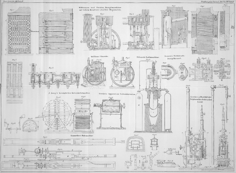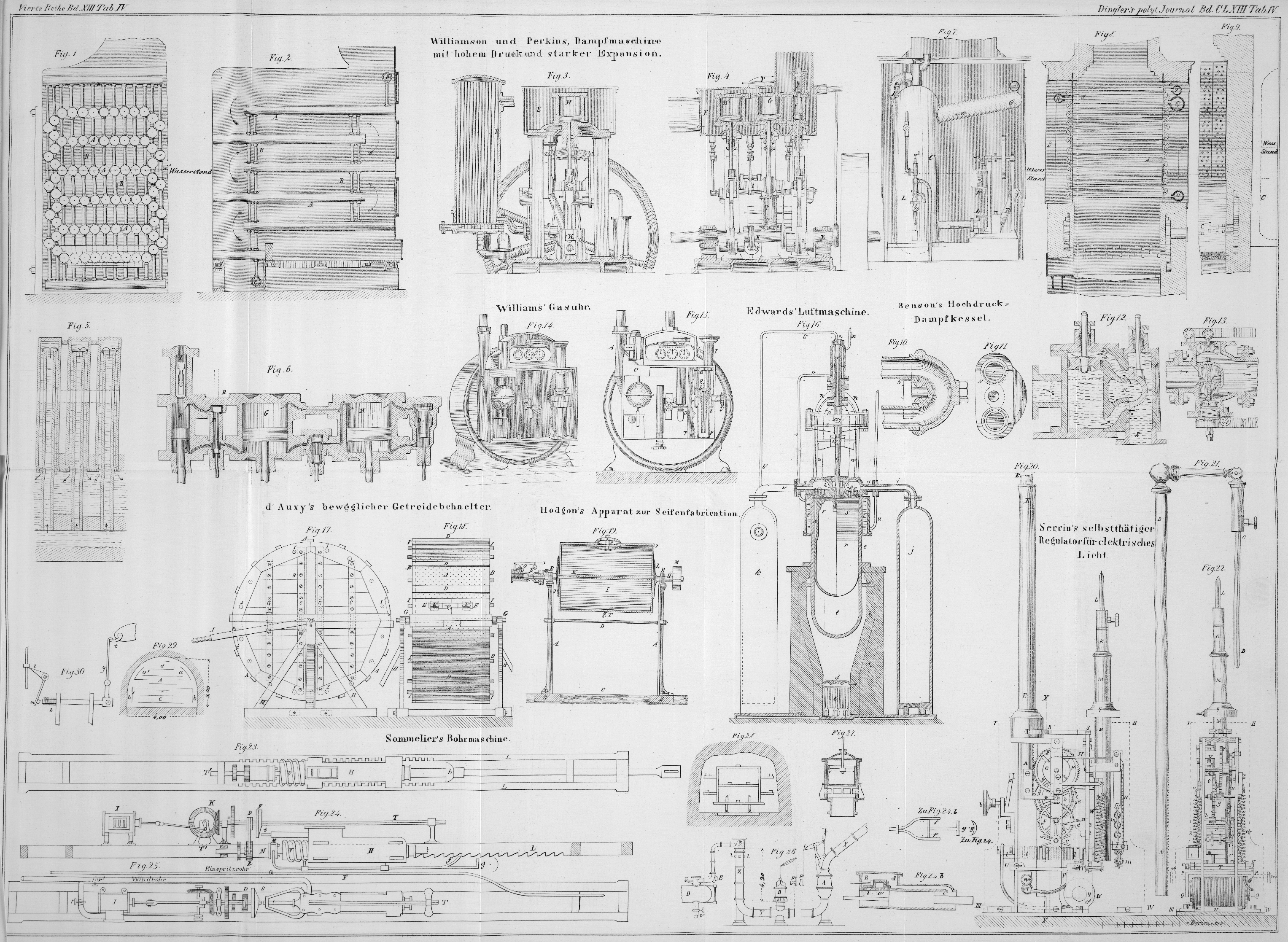 LXIII. Dampfkessel, nebst Maschine und Oberflächencondensator, für sehr hohen Druck und starke Expansion, von A. W. Williamson und L. Perkins in London. Aus dem Mechanics' Magazine, November 1861, S. 325. Mit Abbildungen auf Tab. IV. Williamson's und Perkins' Dampfmaschine für sehr hohen Druck und starke Expansion.