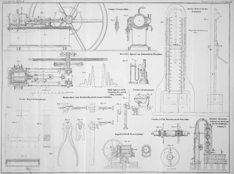 XLIII. Tresca's Bericht über Versuche mit der Lenoir'schen Gasmaschine. Mit Abbildungen auf Tab. III. Tresca's Bericht über Versuche mit Gasmaschine.
