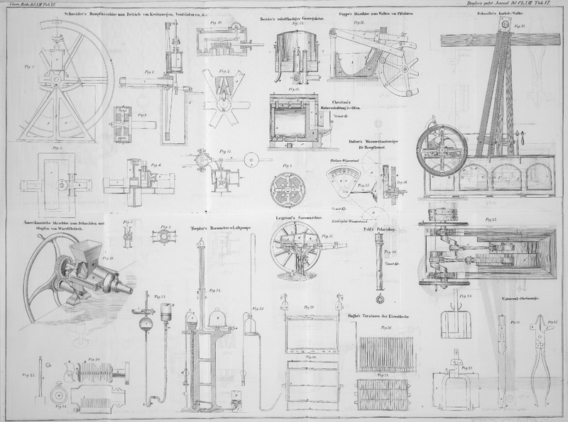CVI. Amerikanische Maschine zum Schneiden und Stopfen von Wurstfleisch; von Pintus. Mit Abbildungen auf Tab. VI. Pintus, über die amerikanische Maschine zum Schneiden und Stopfen von Wurstfleisch.