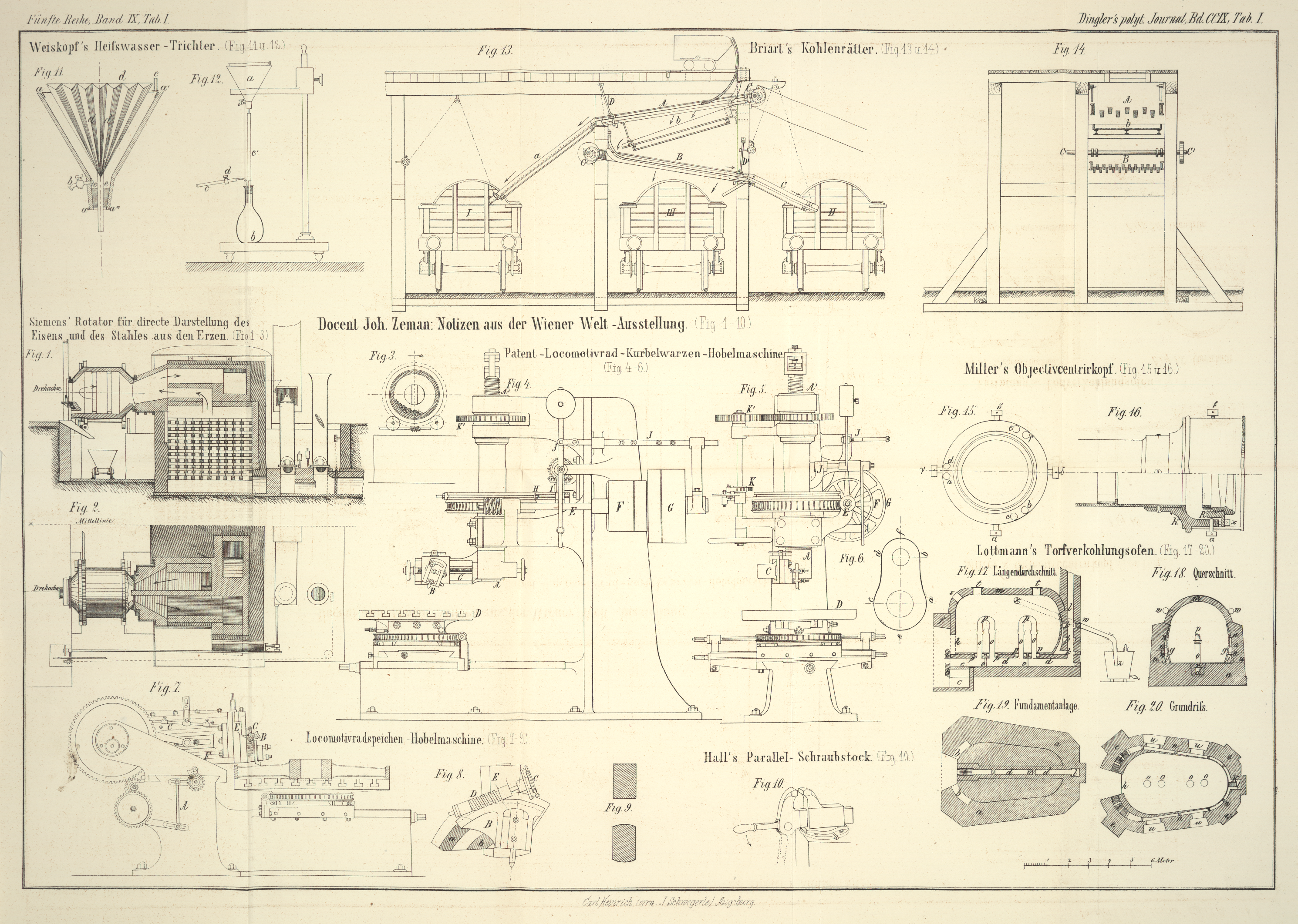 Chemnitz. – 12. Platt's Egrenirmaschine. 13. Hall's Parallel-Schraubstock. – 14. Bolzano's Klarkohlenrost.