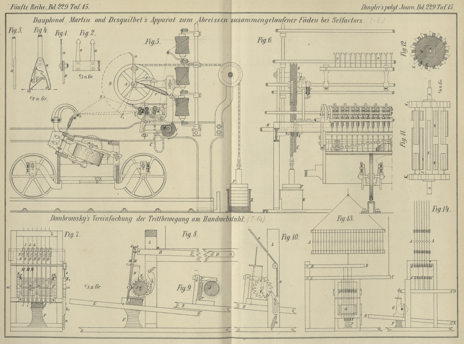 Feinspinnmaschine für schwachgedrehtes Baumwollgarn 3Maigron's Spinnmaschine für Seilerei * 4Broux's Jacquardstuhl 6Verdol's Jacquardmaschine mit endlosem Papier statt