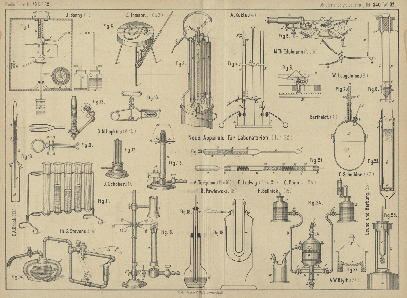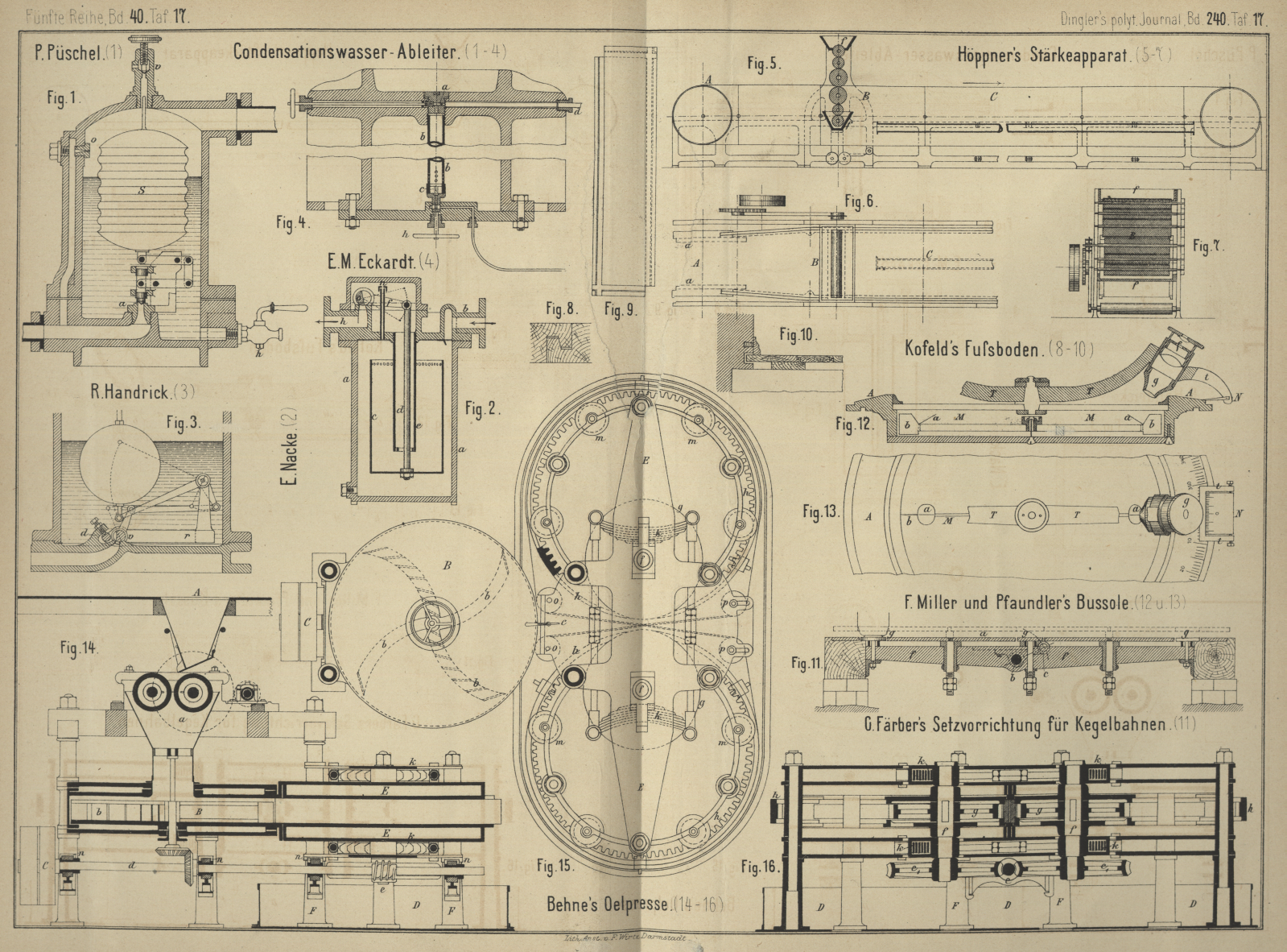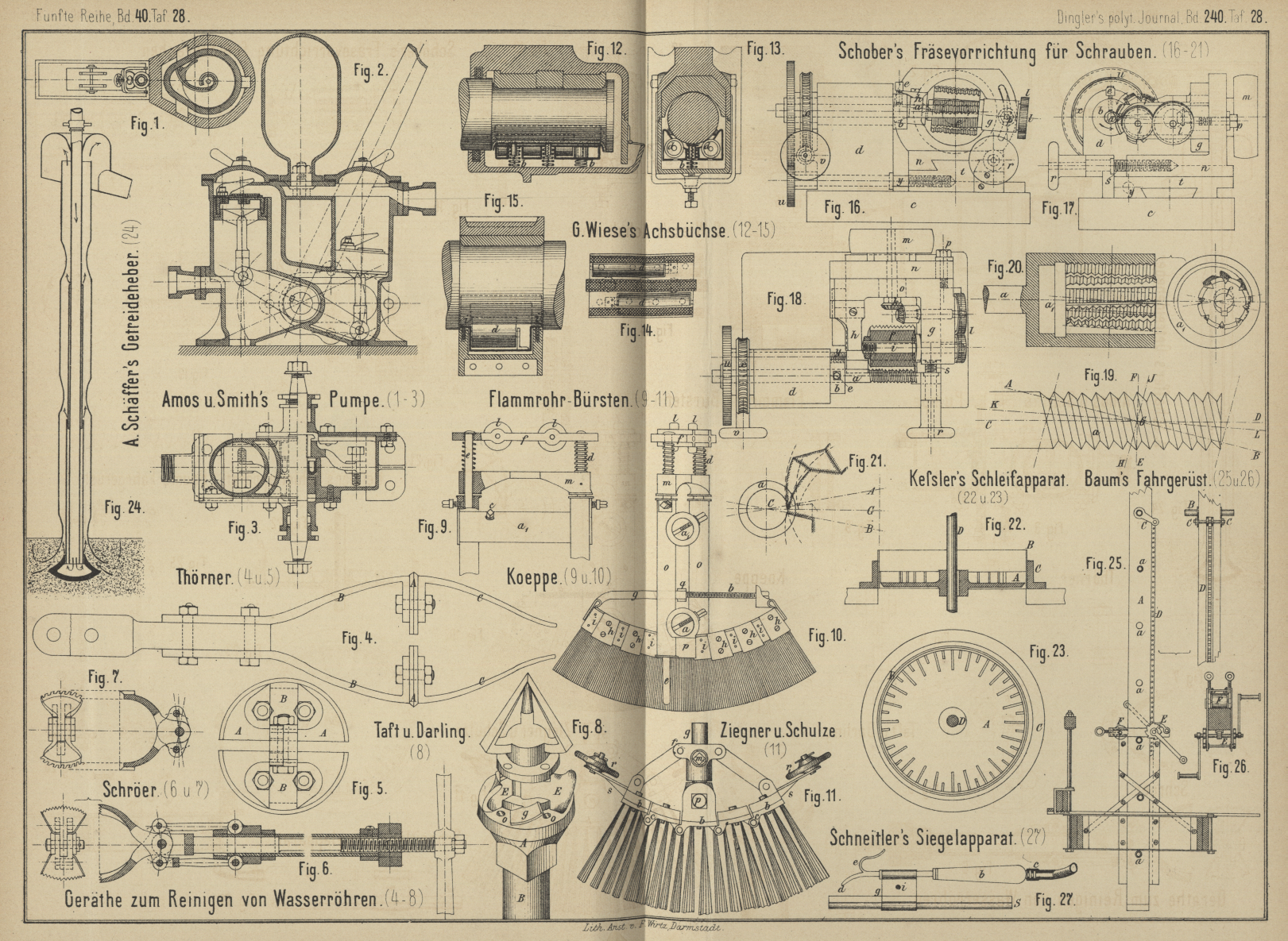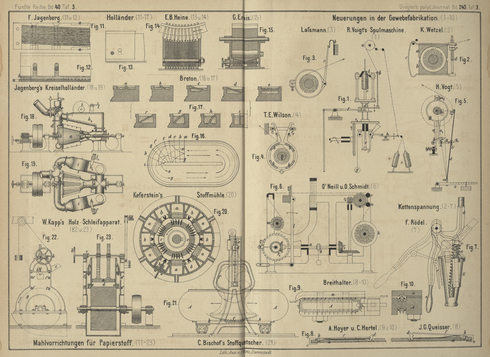 27G. H. Ennis' Stellvorrichtung * 28C. Breton's Holländertrog * 28F. Jagenberg's Stoffmühle, genannt Kreiselhollander * 29A. Keferstein's neue Holländerform * 30C. Th. Bischof's Stoffquetscher * 31W. Kapp's Schleifapparat für Holzabfälle *