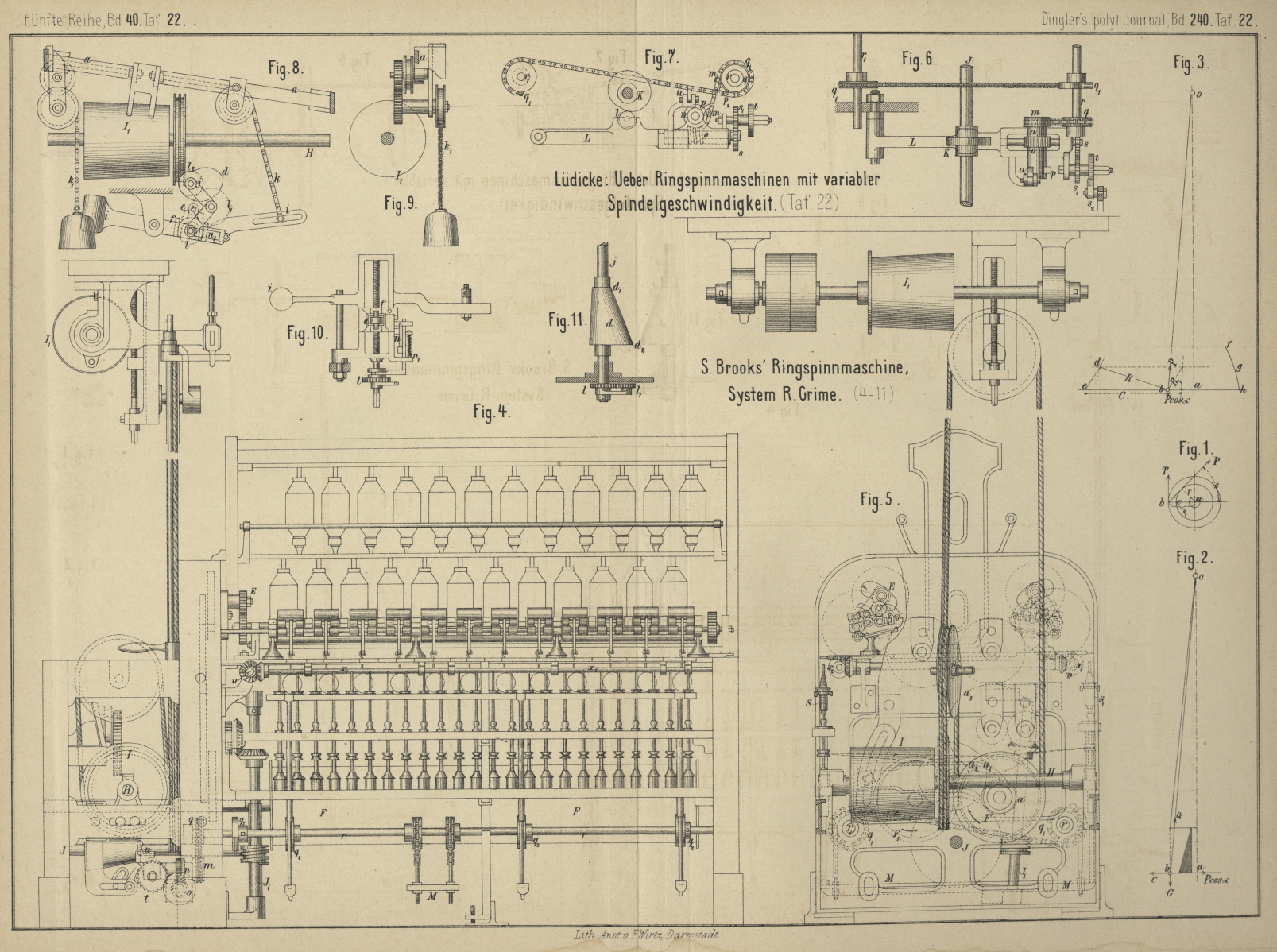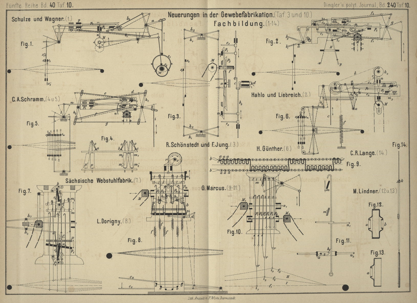 Spulmaschine * 19B) Gewebe-Erzeugung.I) Spannung der Kette und des Gewebes im Stuhl:a) Längenspannung 20K. Wetzel * und L. Laſsmann * (Backenbremsen) 21T. Wilson * (Constanterhaltung