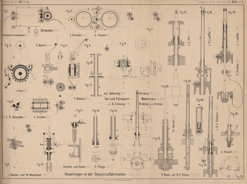 Steinlen27E. Blocher * 28III) Verspinnen der Faserstoffe. Vor- und Feinspinnmaschinen 28a) Continuirlich spinnende Maschinen: Cöl. Martin