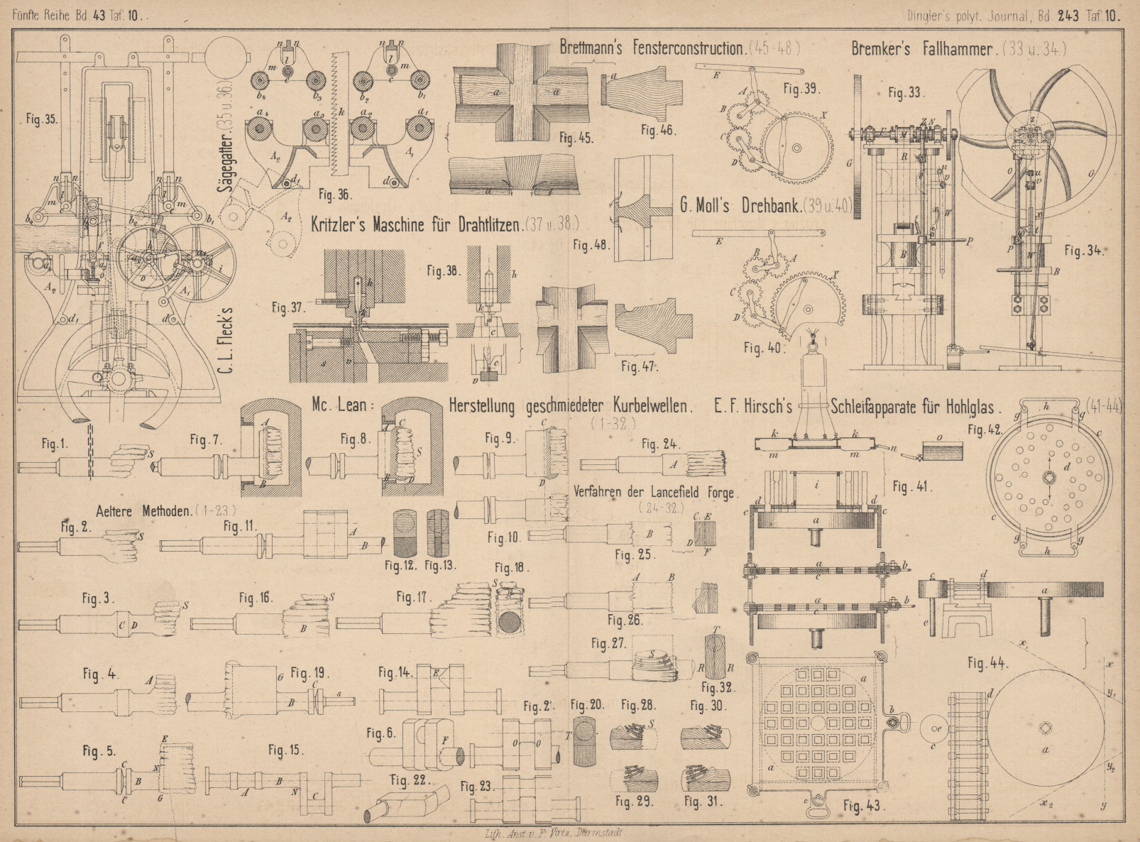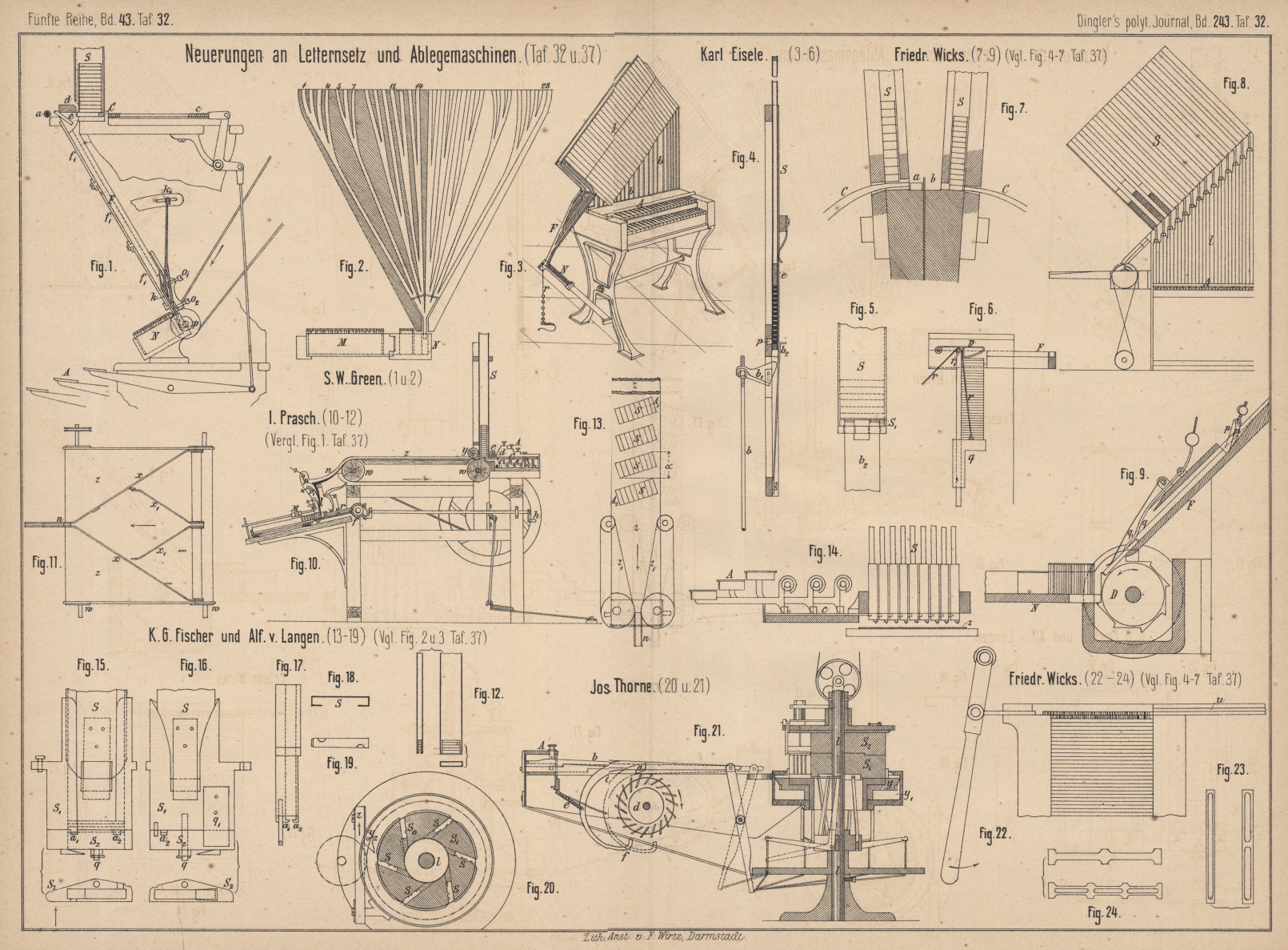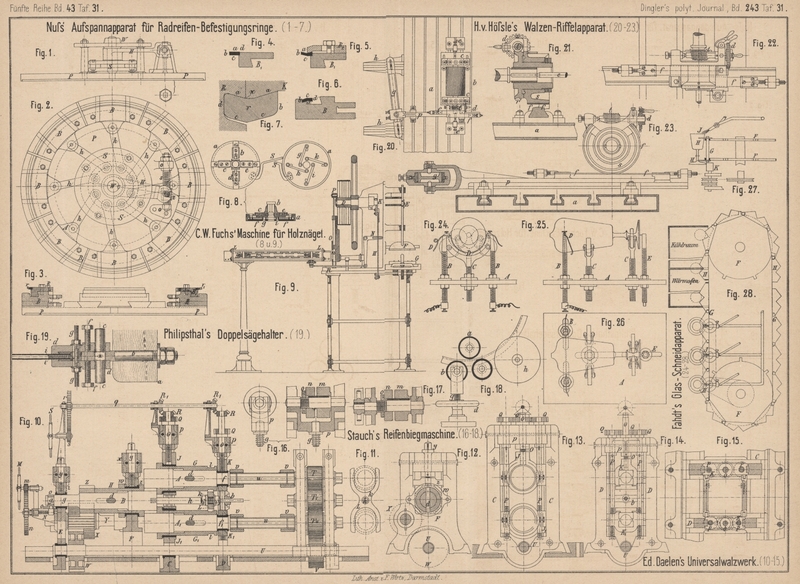 in Düren * 31Maschine für Diagonalschnitt mit periodischem Vorschub durch eine Walze; von Jos. Eck und Söhne in Düsseldorf * 33Zuführung des Papieres durch Walzen; von Grahl und Hoehl