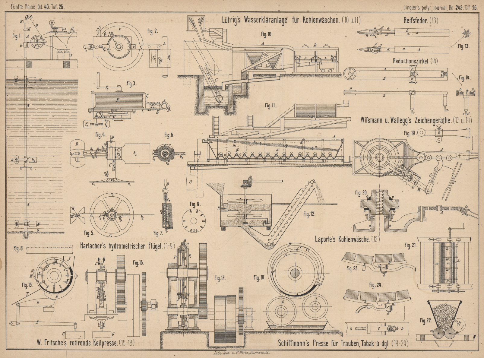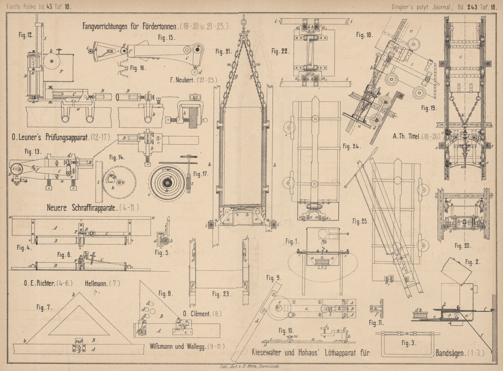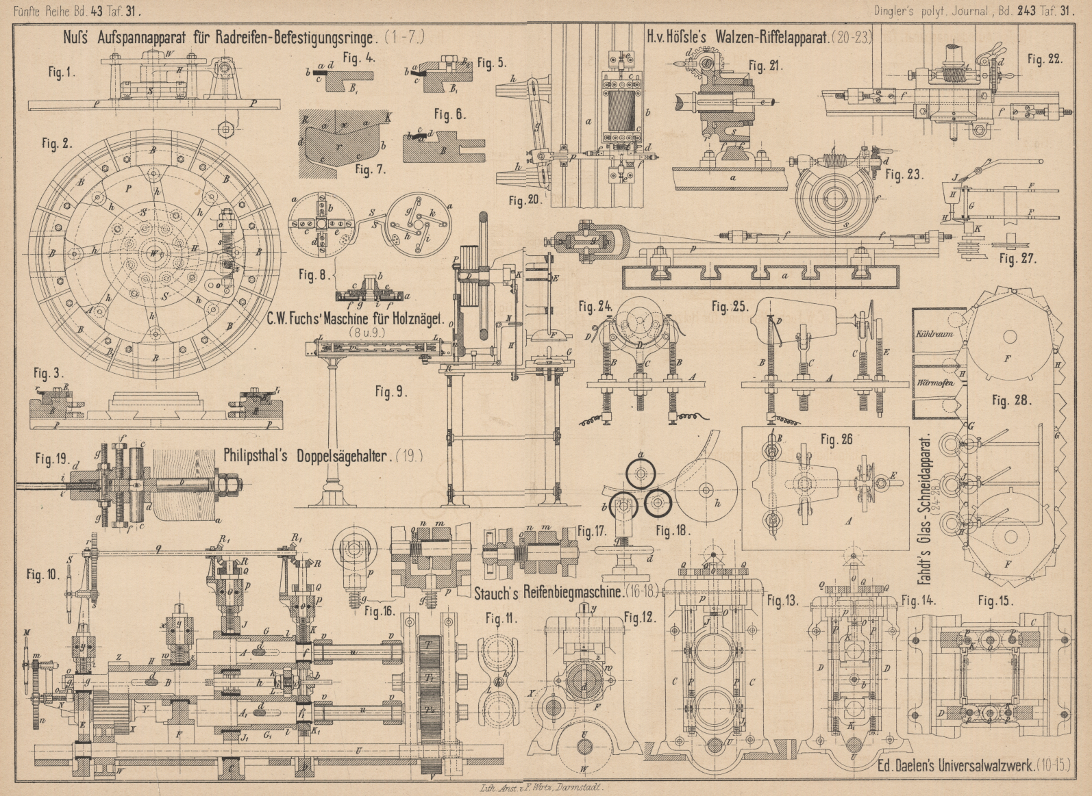 26. * 28Gehrungsschneidapparat von G. Ott in Ulm * 27Maschine zum Fügen und Bestoſsen von Hölzern für Parketfabrikation; von H. Wieland in Leipzig * 28