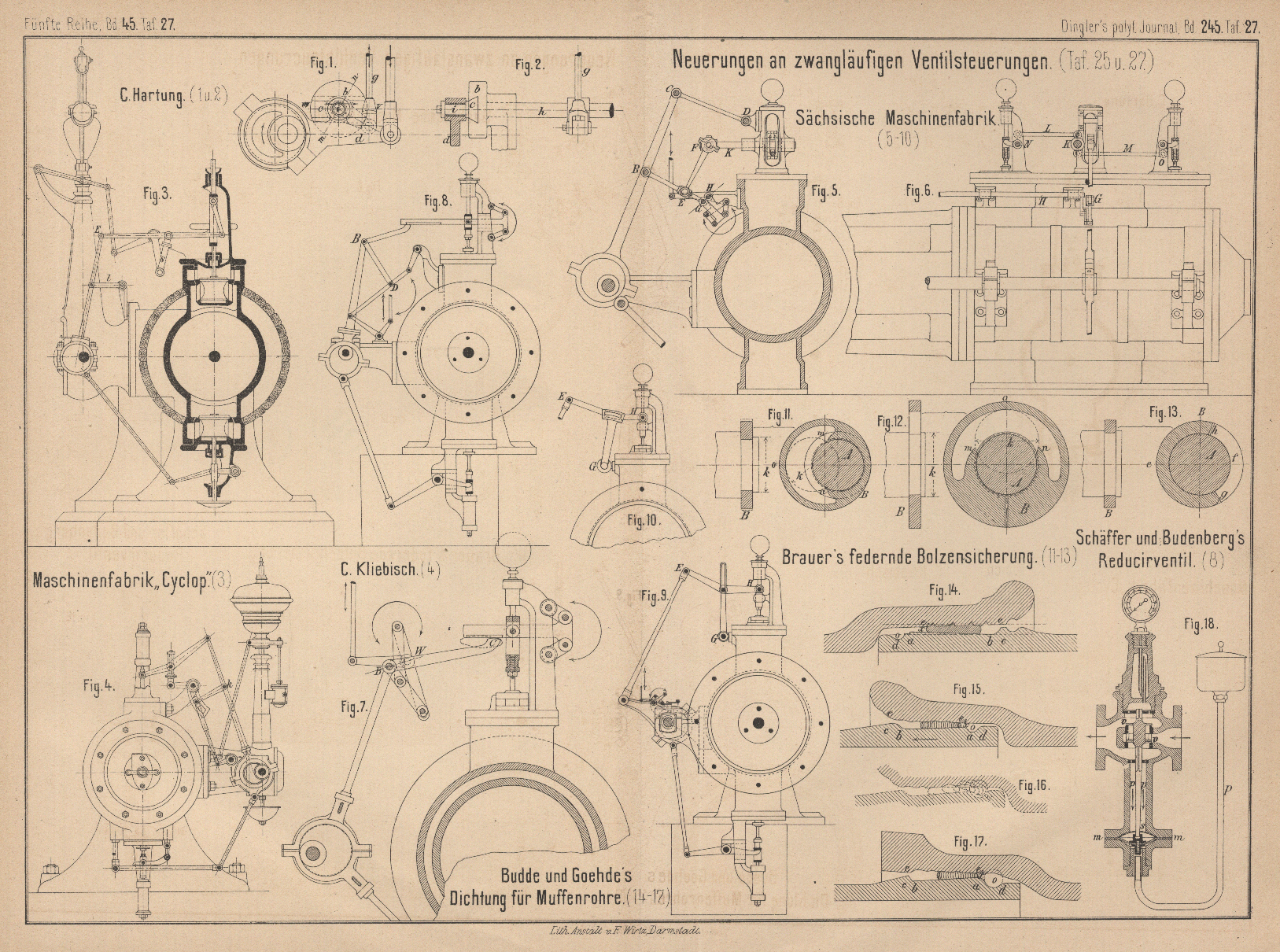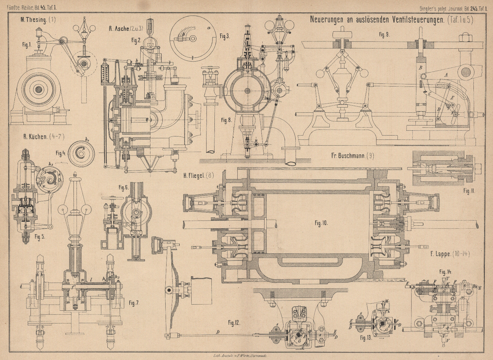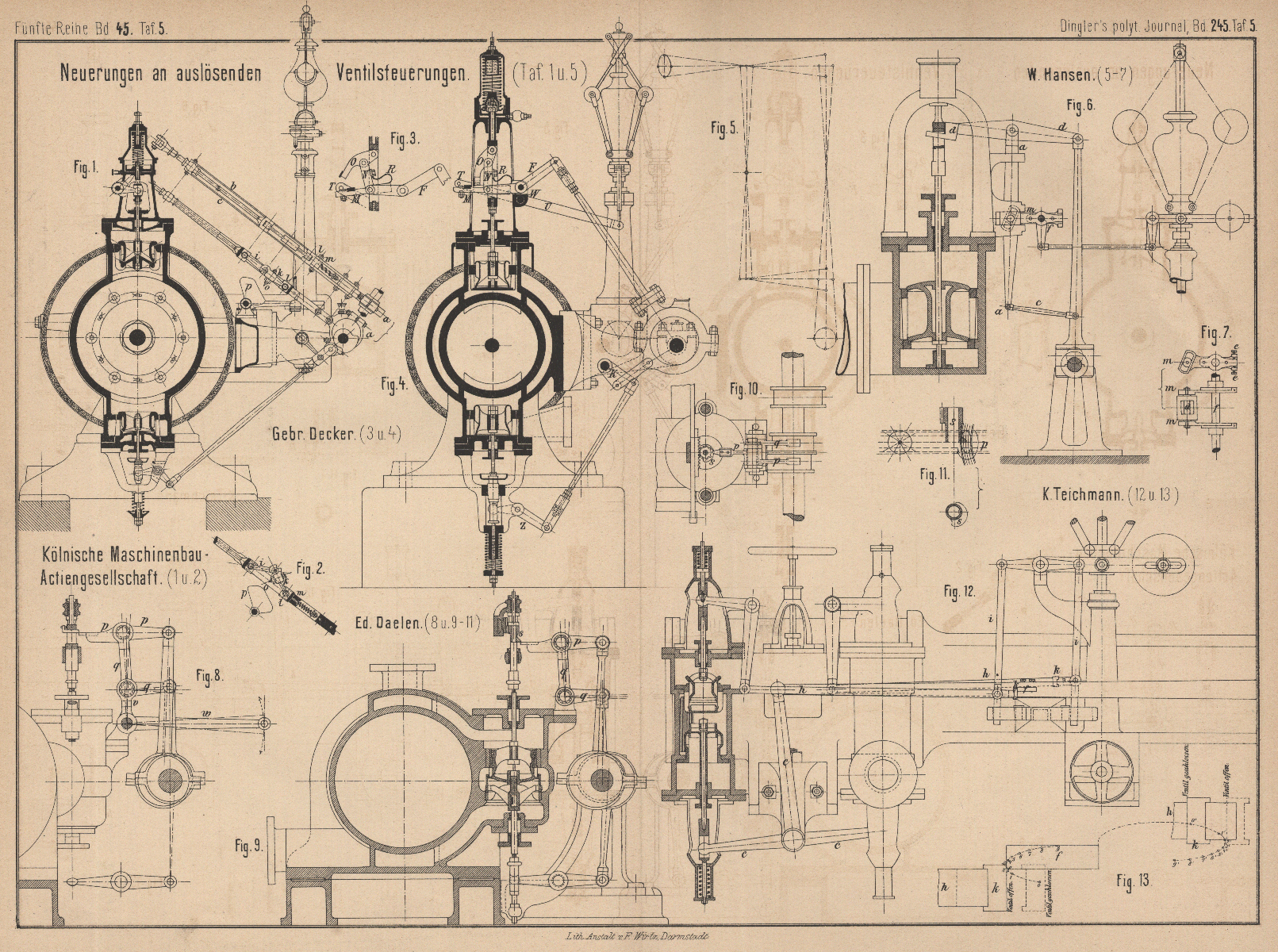 DINGLER'SPolytechnisches Journal. Herausgegeben von Prof. Joh. Zeman und Dr. Ferd. Fischer in Stuttgart in Hannover. 63. Jahrgang: 12. Juli 1882. Band 245. Heft 2. Mit 4 Tafeln Abbildungen (Taf. 5 bis 8) und Holzschnitten. Stuttgart. Verlag der J. G. COTTA'schen Buchhandlung.1882 Textabbildung Bd. 245 Anzeigen der Redactionvon Dingler's polytechnischem Journal. Inhalt von Nr. 2 Band 245. * bedeutet mit Abbild. Neuerungen an auslösenden Ventilsteuerungen; von der Kölnischen Maschinenbau-Actiengesellschaft in Bayenthal *, Gebrüder Decker und Comp. in Cannstatt, jetzt Maschinenfabrik Eßlingen in Eſslingen bei Stuttgart*, W. Hansen in Gotha*, Ed. Daelen in Düsseldorf*, K. Teichmann in Stuttgart* 49 Abdichtung von Rauchröhren unter Dampfdruck-, von D. J. Morgan in Cardiff, England * 52 Leuchtender Schwimmer für Wasserstandsgläser; von Schlag und Berend in Berlin * 52 Siederohr-Dichtapparat von C. F. Wischeropp in Berlin * 53 Herstellung gewellter Kesselsiederöhren; von J. Empson und Comp. in Hamburg * 53 Bewegliche Kupplung für Schiffs wellen; von A. Verity in Bramley bei Leeds * 53 Ausgleichungsvorrichtung für Rohrleitungen; von R. Kuhn in Hochdahl* 54 Schlauchkupplung von P: Keil in Fulda * 54 Selbstthätiger Druckregulator für Dampfkessel u. dgl.; von A. Bechern in Hagen * 55 Rohrbrunnen von F. C. Glaser in Berlin * 56 Neuerungen an Vielkantdrehbänken; von A. Wenzel in Berlin und H. Hoff in Berlin * 56 Neuerungen an Korkschneidmaschinen; von P. Ficker in Reutlingen und W. H. Gropp in Braunschweig * 58 Ueber Abt's combinirtes Tractionssystem für Industrie- und Secundärbahnen mit steilen Rampen; von Paulus * 59 Holzschliffmaschine mit Anwendung von Dampf und heiſsem Wasser; von H. A. Trambach in Kaukauna, Nordamerika * 60 Rotirende Schabmaschine für Münzplatten; von Ludw. Seyß in Atzgersdorf bei Wien * 61 Untersuchungen über das Verhalten des Phosphorbronzedrahtes bei der Beanspruchung durch Zugkräfte; von Prof. Hugo Fischer in Dresden * 64 Neuerungen an Feuerungsanlagen: Feuerungsroste von C. Nikiforoff in Warschau *, E. A. Schott in Kreiensen *, J. Alves in Dunedin, Neuseeland *, E. Schmitz *, F. Jauner in Wien, B. R. Huntley in West-Hartlepool, G. E. Wolff in Hamburg *, H. Heine in Berlin, A. E. Wackernie in Paris *. Einblasen der Kohlen; von Newton in London *. Vorschieben mittels Kolben von W. Brück und F. Lürmann in Osnabrück *, durch Kippen der Kohlenmulde von H. Göbel in Ostrowo. Rost mit mechanischer Beschickung; von C. Kölling in Bulmke *, Fr. M. Goujet in Paris. Vorwärmung der Verbrennungsluft; von H. Dekkert in Stettin und Ch. M. William in Montreal. Reinigung der Feuergase durch Wasser; von J. K. Martin in Chemnitz. Feuerungsanlage für feuchte Holzabfälle und Sägespäne; von Niederberger und Comp. in Hamburg *. Verbrennung von Theer; von C. W. Schumann und F. Küchler in Weiſsenfels *. Einblasen flüssiger Brennstoffe; von W. D. Dickey in New-York und H. Th. Litchfield in Hüll. Vorrichtungen zur Rauchverbrennung; von L. Juilliard in Paris *, O. D. Orvis in Chicago, C. Dahlmann in Courl bei Dortmund *, B. Röber in Dresden *, Th. Bauer in Grottau *. Gasfeuerung von F. A. Schulz in Zeitz * 76 Ueber Ausnützung der Brennstoffe durch Zimmeröfen; von Civil-Ingenieur Friedr. Bode (Schluſs) 81 Ueber Patinabildung; von Prof. Dr. Rud. Weber in Berlin 86 Kreosot aus Buchenholztheer; von Hartmann und Hauers in Hannover 91 Kleinere Mittheilungen: Neuerungen an Klappenschützen für Turbinen; von J. Heyn in Stettin 92Verfahren zur Herstellung von Verblendsteinen; von Ant. Heber in Chemnitz * 92Flachkeil zur Dichtung von Rissen in Kessel wänden; von L. Knölke in Hannover * 93Mandelschneidmaschine von L. Hussong in Stuttgart * 93Elektrisches Licht in dem Kohlenbergwerk Earnock-Grube bei Glasgow 93Elektrische Straſsenbeleuchtung in New-York nach Edison's System 94Ueber die Elektrizität der Flamme; von J. Elster und H. Geitel 94Herstellung basischer Ofenfutter; von Th. Kutscha, G. Oelwein und P. v. Mertens in Teschen und H. Bollinger in Mailand 94J. Krutwig's Bestimmung des Silbers in Bleierzen 95Ueber die im Samarskit vorkommenden Erdmetalle; von H. E. Roscoe 96Die Kohlenhydrate des Fucus amylaceus; von H. G. Greenish 96Ueber schwedischen Hopfen; von R. Braungart 96Zur Untersuchung der atmosphärischen Luft; von H. Heine 96 –––––––––– Bei der Redaction sind nachstehende WerkeDie verehrl. Verlagshandlungen werden gebeten, bei Zusendung von Recensionsexemplaren die Ladenpreise derselben beizufügen. eingelaufen: Dr. W. Schaefer: Der gewerbliche Credit. Vom privatökonomischen Standpunkte für Techniker und angehende Industrielle. 128 S. in gr. 8. Pr. 1,60 M. (C. F. Winter. Leipzig und Heidelberg 1882.) Forschungen auf dem Gebiete der Viehhaltung und ihrer Erzeugnisse. 12. Heft. (Beilage zur Milchzeitung.) Pr. 1 M. (M. Heinsius. Bremen 1882.) –––––––––– Es wird höflichst ersucht, alle die Redaction betreffenden Mittheilungen Sendungen u. dgl. gefälligst zu adressiren: An die Redaction von Dingler's polytechn. Journal Hrn. Prof. Joh. Zeman in Stuttgart, bezieh. Hrn. Dr. Ferd. Fischer in Hannover, Gustav Adolf-Straſse 28; alle die Expedition und Anzeigen betreffenden Schreiben an die J. G. Cotta'sche Buchhandlung in Stuttgart. ☞ Prof. Zeman in Stuttgart wohnt Hoppenlaustraſse 2 ☜ (Ecke der Schloſsstraſse). Neuerungen an auslösenden Ventilsteuerungen. Patentklasse 14. Mit Abbildungen auf Tafel 1 und 5. (Schluſs des Berichtes Seite 2 dieses Bandes.) Neuerungen an auslösenden Ventilsteuerungen. D. J. Morgan's Abdichtung von Rauchröhren unter Dampfdruck. Mit Abbildung auf Tafel 6. [Morgan's Abdichtung von Rauchröhren unter Dampfdruck.] Schlag und Berend's leuchtender Schwimmer für Wasserstandsgläser. Mit Abbildung. Schlag und Berend's Schwimmer für Wasserstandsgläser. C. F. Wischeropp's Siederohr-Dichtapparat. Mit Abbildungen auf Tafel 6. [Wischeropp's Siederohr-Dichtapparat.] J. Empson's Herstellung gewell