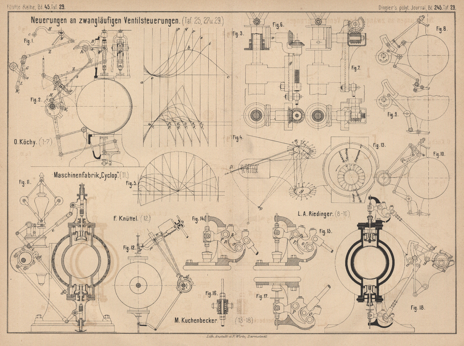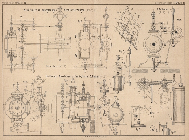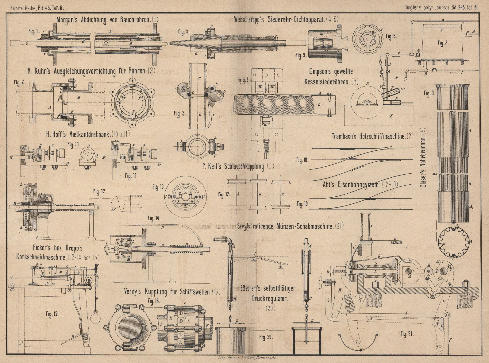 DINGLER'SPolytechnisches Journal. Herausgegeben von Prof. Joh. Zeman und Dr. Ferd. Fischer in Stuttgart in Hannover. 63. Jahrgang: 12. Juli 1882. Band 245. Heft 2. Mit 4 Tafeln Abbildungen (Taf. 5 bis 8) und Holzschnitten. Stuttgart. Verlag der J. G. COTTA'schen Buchhandlung.1882 Textabbildung Bd. 245 Anzeigen der Redactionvon Dingler's polytechnischem Journal. Inhalt von Nr. 2 Band 245. * bedeutet mit Abbild. Neuerungen an auslösenden Ventilsteuerungen; von der Kölnischen Maschinenbau-Actiengesellschaft in Bayenthal *, Gebrüder Decker und Comp. in Cannstatt, jetzt Maschinenfabrik Eßlingen in Eſslingen bei Stuttgart*, W. Hansen in Gotha*, Ed. Daelen in Düsseldorf*, K. Teichmann in Stuttgart* 49 Abdichtung von Rauchröhren unter Dampfdruck-, von D. J. Morgan in Cardiff, England * 52 Leuchtender Schwimmer für Wasserstandsgläser; von Schlag und Berend in Berlin * 52 Siederohr-Dichtapparat von C. F. Wischeropp in Berlin * 53 Herstellung gewellter Kesselsiederöhren; von J. Empson und Comp. in Hamburg * 53 Bewegliche Kupplung für Schiffs wellen; von A. Verity in Bramley bei Leeds * 53 Ausgleichungsvorrichtung für Rohrleitungen; von R. Kuhn in Hochdahl* 54 Schlauchkupplung von P: Keil in Fulda * 54 Selbstthätiger Druckregulator für Dampfkessel u. dgl.; von A. Bechern in Hagen * 55 Rohrbrunnen von F. C. Glaser in Berlin * 56 Neuerungen an Vielkantdrehbänken; von A. Wenzel in Berlin und H. Hoff in Berlin * 56 Neuerungen an Korkschneidmaschinen; von P. Ficker in Reutlingen und W. H. Gropp in Braunschweig * 58 Ueber Abt's combinirtes Tractionssystem für Industrie- und Secundärbahnen mit steilen Rampen; von Paulus * 59 Holzschliffmaschine mit Anwendung von Dampf und heiſsem Wasser; von H. A. Trambach in Kaukauna, Nordamerika * 60 Rotirende Schabmaschine für Münzplatten; von Ludw. Seyß in Atzgersdorf bei Wien * 61 Untersuchungen über das Verhalten des Phosphorbronzedrahtes bei der Beanspruchung durch Zugkräfte; von Prof. Hugo Fischer in Dresden * 64 Neuerungen an Feuerungsanlagen: Feuerungsroste von C. Nikiforoff in Warschau *, E. A. Schott in Kreiensen *, J. Alves in Dunedin, Neuseeland *, E. Schmitz *, F. Jauner in Wien, B. R. Huntley in West-Hartlepool, G. E. Wolff in Hamburg *, H. Heine in Berlin, A. E. Wackernie in Paris *. Einblasen der Kohlen; von Newton in London *. Vorschieben mittels Kolben von W. Brück und F. Lürmann in Osnabrück *, durch Kippen der Kohlenmulde von H. Göbel in Ostrowo. Rost mit mechanischer Beschickung; von C. Kölling in Bulmke *, Fr. M. Goujet in Paris. Vorwärmung der Verbrennungsluft; von H. Dekkert in Stettin und Ch. M. William in Montreal. Reinigung der Feuergase durch Wasser; von J. K. Martin in Chemnitz. Feuerungsanlage für feuchte Holzabfälle und Sägespäne; von Niederberger und Comp. in Hamburg *. Verbrennung von Theer; von C. W. Schumann und F. Küchler in Weiſsenfels *. Einblasen flüssiger Brennstoffe; von W. D. Dickey in New-York und H. Th. Litchfield in Hüll. Vorrichtungen zur Rauchverbrennung; von L. Juilliard in Paris *, O. D. Orvis in Chicago, C. Dahlmann in Courl bei Dortmund *, B. Röber in Dresden *, Th. Bauer in Grottau *. Gasfeuerung von F. A. Schulz in Zeitz * 76 Ueber Ausnützung der Brennstoffe durch Zimmeröfen; von Civil-Ingenieur Friedr. Bode (Schluſs) 81 Ueber Patinabildung; von Prof. Dr. Rud. Weber in Berlin 86 Kreosot aus Buchenholztheer; von Hartmann und Hauers in Hannover 91 Kleinere Mittheilungen: Neuerungen an Klappenschützen für Turbinen; von J. Heyn in Stettin 92Verfahren zur Herstellung von Verblendsteinen; von Ant. Heber in Chemnitz * 92Flachkeil zur Dichtung von Rissen in Kessel wänden; von L. Knölke in Hannover * 93Mandelschneidmaschine von L. Hussong in Stuttgart * 93Elektrisches Licht in dem Kohlenbergwerk Earnock-Grube bei Glasgow 93Elektrische Straſsenbeleuchtung in New-York nach Edison's System 94Ueber die Elektrizität der Flamme; von J. Elster und H. Geitel 94Herstellung basischer Ofenfutter; von Th. Kutscha, G. Oelwein und P. v. Mertens in Teschen und H. Bollinger in Mailand 94J. Krutwig's Bestimmung des Silbers in Bleierzen 95Ueber die im Samarskit vorkommenden Erdmetalle; von H. E. Roscoe 96Die Kohlenhydrate des Fucus amylaceus; von H. G. Greenish 96Ueber schwedischen Hopfen; von R. Braungart 96Zur Untersuchung der atmosphärischen Luft; von H. Heine 96 –––––––––– Bei der Redaction sind nachstehende WerkeDie verehrl. Verlagshandlungen werden gebeten, bei Zusendung von Recensionsexemplaren die Ladenpreise derselben beizufügen. eingelaufen: Dr. W. Schaefer: Der gewerbliche Credit. Vom privatökonomischen Standpunkte für Techniker und angehende Industrielle. 128 S. in gr. 8. Pr. 1,60 M. (C. F. Winter. Leipzig und Heidelberg 1882.) Forschungen auf dem Gebiete der Viehhaltung und ihrer Erzeugnisse. 12. Heft. (Beilage zur Milchzeitung.) Pr. 1 M. (M. Heinsius. Bremen 1882.) –––––––––– Es wird höflichst ersucht, alle die Redaction betreffenden Mittheilungen Sendungen u. dgl. gefälligst zu adressiren: An die Redaction von Dingler's polytechn. Journal Hrn. Prof. Joh. Zeman in Stuttgart, bezieh. Hrn. Dr. Ferd. Fischer in Hannover, Gustav Adolf-Straſse 28; alle die Expedition und Anzeigen betreffenden Schreiben an die J. G. Cotta'sche Buchhandlung in Stuttgart. ☞ Prof. Zeman in Stuttgart wohnt Hoppenlaustraſse 2 ☜ (Ecke der Schloſsstraſse). Neuerungen an auslösenden Ventilsteuerungen. Patentklasse 14. Mit Abbildungen auf Tafel 1 und 5. (Schluſs des Berichtes Seite 2 dieses Bandes.) Neuerungen an auslösenden Ventilsteuerungen. D. J. Morgan's Abdichtung von Rauchröhren unter Dampfdruck. Mit Abbildung auf Tafel 6. [Morgan's Abdichtung von Rauchröhren unter Dampfdruck.] Schlag und Berend's leuchtender Schwimmer für Wasserstandsgläser. Mit Abbildung. Schlag und Berend's Schwimmer für Wasserstandsgläser. C. F. Wischeropp's Siederohr-Dichtapparat. Mit Abbildungen auf Tafel 6. [Wischeropp's Siederohr-Dichtapparat.] J. Empson's Herstellung gewell