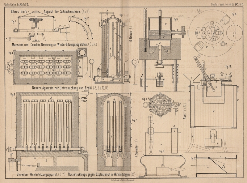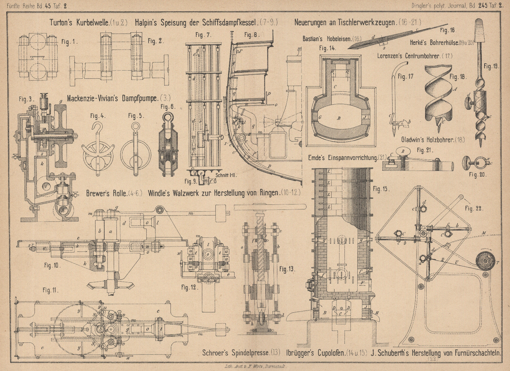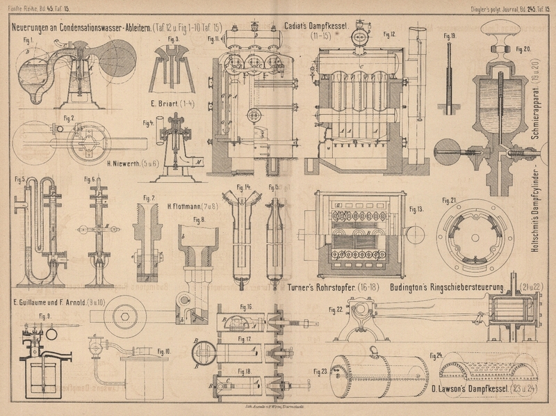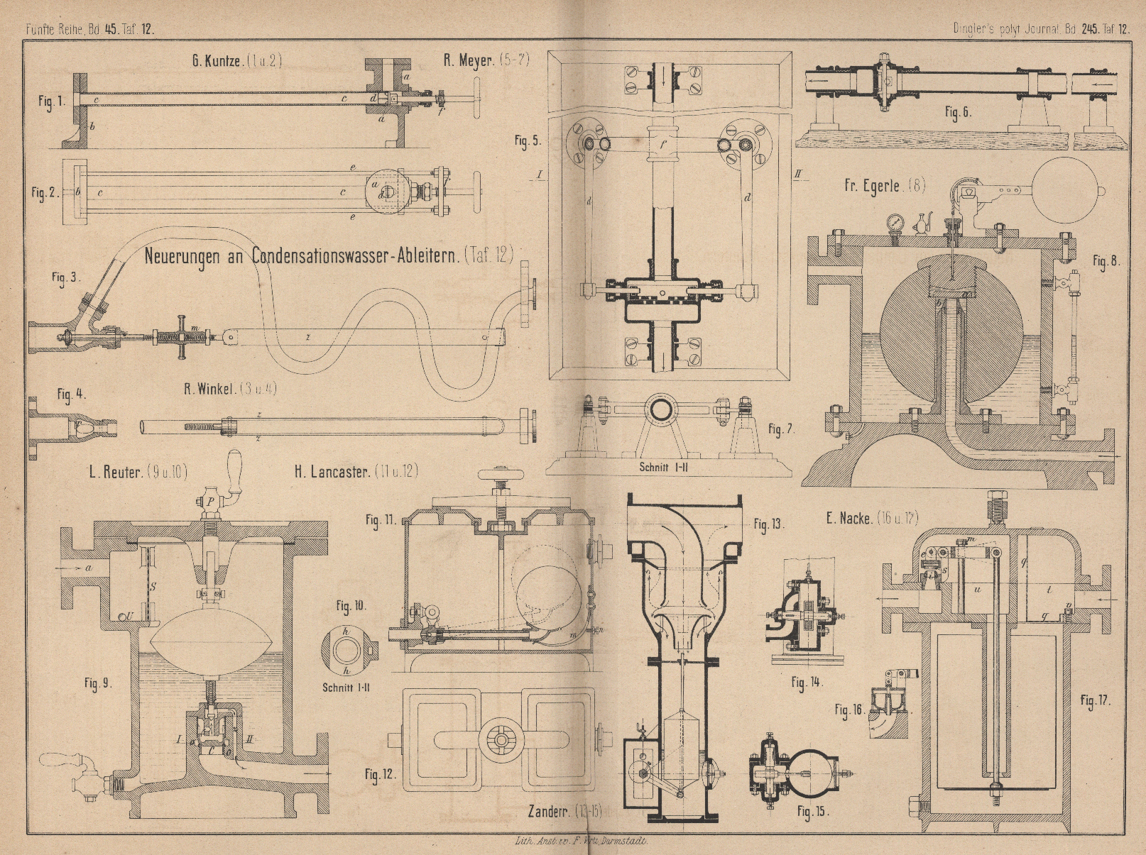 DINGLER'S Polytechnisches Journal. Herausgegeben von Prof. Joh. Zeman und Dr. Ferd. Fischer in Stuttgart in Hannover. 63. Jahrgang: 26. Juli 1882. Band 245. Heft 4. Mit 3 Tafeln Abbildungen (Taf. 12 bis 14) und Holzschnitten. Stuttgart. Verlag der J. G. COTTA'schen Buchhandlung.1882 Anzeigen der Redactionvon Dingler's polytechnischem Journal. Inhalt von Nr. 4 Band 245. * bedeutet mit Abbild. Zur Geschichte der Centrifugal-Gebläse und Pumpen; von Prof. H. Fritz in Zürich * 145 Neuerungen an Condensationswasser-Ableitern; von G. Kuntze in Göppingen *, H. Winkel in Chemnitz *, Rob. Meyer in Breslau *, Fr. Egerle in Horic *, L. Reuter in Halle a. S.*, H. Lancaster in Pendleton bei Manchester *, Zander in Schwientochlowitz *, E. Nacke in Dresden * 147 Neuerungen an Dampfcylindern; von W. Hanna in Gilroy, Nordamerika * 151 Gelenkruder für Schiffe; von A. Figge, G. A. Köttgen und H. Wedekind in London * 152 Ueber Neuerungen an Wirkereimaschinen (Forts.): Direkte Lagerung der stehenden Platinen in Handwirkmaschinen von H. G. Escher in Kleinneuschönberg, Sachsen *. Platinenanordnung für Handwirkstühle von Karl H. Wolf in Grüna *. Nadellagerung für Handwirkstühle von E. W. Schubert in Olbernhau *. Ausrückvorrichtung für Kettenstühle von Jak. Landau in Berlin *. Einrichtung zur Herstellung von Deckelfersen von der Société Poron frères, fils et Mortier in Troyes. Mechanischer Ränderwirkstuhl für reguläre Waare von Gebrüder Herfurth in Chemnitz. Preismustervorrichtung für flache Wirkstühle von G. Hilscher und F. A. Hertel in Chemnitz *. Preſsmustervorrichtung von May und Stahlknecht in Stollberg *. Einrichtung zur selbstthätigen Verschiebung der Seitendreiecke und Antriebeinrichtung für die Schlösser der Lamb'schen Strickmaschine von der Schaffhauser Strickmaschinenfabrik in Schaffhausen*. Strickmaschine, deren Nadeln mittels Hebel von den Schlössern bewegt werden *, Nieten für Zungennadeln und Zungennadeln mit verschiebbarer anstatt drehbarer Zunge * von G. L. Oemler in Plagwitz. Verfahren zur Herstellung von Strickmaschinennadeln von S. Peberdy in Philadelphia* 152 Neuerung an Bublirmaschinen für Gewebe aller Art; von Fr. Gebauer in Charlottenburg * 159 Verfahren zum Gieſsen von Hochofenschlacke; von A. D. Elbers in Hoboken, Nordamerika * 161 Neuerungen an Winderhitzungsapparaten: Verbesserungen an Whitwell – Apparaten; von der Firma Th. Whitwell in Stockton-on-Tees, H. Massicks und W. Crooke in Millom, England *. Fuſskastenapparat von der Gleiwitzer Hütte * 161 Rückstauklappe zur Verhütung der Explosionen in Windleitungsröhren * 164 Ueber die Untersuchung von Erdöl: Verbesserter Taucher von O. Braun in Berlin *. Amtliche Einführung des Abel'schen Erdölprüfers im Deutschen Reich *. Ueber den Entflammungspunkt von C. Engler. Apparat zur gefahrlosen Untersuchung von Erdöl auf seine Entzündlichkeit von P. Semmler in Lieberose * 165 Ueber die Analyse von Dynamiten; von Prof. Dr. G. Lunge in Zürich 171 Ueber die Ursache der sauren Reaction mancher Papiersorten; von Prof. Dr. Feichtinger in München 174 Ueber Patinabildung; von Prof. Dr. Rud. Weber in Berlin (Forts.) 176 Ueber das Bleichen mit Schwefligsäure; von Marius Moyret 183 Ueber die Kosten der elektrischen Beleuchtung: Personenhalle des Schlesischen Bahnhofes in Berlin. South Kensington Museum in London. Oeffentliche Beleuchtung in Norwich in England 184 Leistungsfähigkeit amerikanischer Locomotivfabriken 188 Selbstschmierendes Wellenlager von Gebrüder Bentall in Maldon, England * 188 Cordier's Schornstein auf der Elektricitätsausstellung zu Paris 1881 188 Hobelmaschine von F. und J. Butterfield in Keighley, England 189 Ueber die Tragfähigkeit genieteter Stahlträger; von Enke 189 Filterpressen von Schütz und Hertel in Würzen 190 Verfahren zur Herstellung gemusteter Gewebe; von A. L. Pollet in Roubaix 190 Statistik der Buchdruckerkunst in Deutschland und Oesterreich; von Karl Faulmann 190 Elektrische Hafenbeleuchtung in Bordeaux 191 Einfluſs des elektrischen Lichtes auf das Wachsthum der Pflanzen; von C. W. Siemens in London 191 Zur Kenntniſs der Saccharine; von H. Kiliani und L. Cuisinier 191 Ueber Freiburger Poudrette; von J. Neßler 191 Herstellung von Salpeter aus Osmosewasser 192 Gewinnung von Glycerin aus den Unterlaugen der Seifenfabrikation; von L. Dalton und Comp. in Frankfurt a. M. S. 192 Es wird höflichst ersucht, alle die Redaction betreffenden Mittheilungen, Sendungen u. dgl. gefälligst zu adressiren: An die Redaction von Dingler's polytechn. Journal Hrn. Prof. Joh. Zeman in Stuttgart, bezieh. Hrn. Dr. Ferd. Fischer in Hannover, Gustav Adolf-Straſse 23; alle die Expedition und Anzeigen betreffenden Schreiben an die J. G. Cotta'sche Buchhandlung in Stuttgart. Zur Geschichte der Centrifugal-Gebläse und Pumpen; von Prof. H. Fritz in Zürich. Mit Abbildungen. H. Fritz, zur Geschichte der Centrifugal-Gebläse und Pumpen. Neuerungen an Condensationswasser-Ableitern. Patentklasse 13. Mit Abbildungen auf Tafel 12 und 15. Neuerungen an Condensationswasser-Ableitern. W. Hanna's Neuerungen an Dampfcylindern. Mit Abbildung. Hanna's Neuerungen an Dampfcylindern. Gelenkruder für Schiffe. Mit Abbildung. [Gelenkruder für Schiffe.] Ueber Neuerungen an Wirkereimaschinen. Mit Abbildungen auf Tafel 14. (Patentklasse 25. Fortsetzung des Berichtes S. 125 Bd. 244.) Ueber Neuerungen an Wirkereimaschinen. Neuerung an Dublirmaschinen für Gewebe aller Art; von Fr. Gebauer in Charlottenburg. Mit Abbildungen auf Tafel 14. Gebauer's Dublirmaschine für Gewebe aller Art. Verfahren zum Gieſsen von Hochofenschlacke. Mit Abbildungen auf Tafel 13. [Verfahren zum Gieſsen von Hochofenschlacke.] Neuerungen an Winderhitzungsapparaten. Patentklasse 18. Mit Abbildungen auf Tafel 13. Neuerungen an Winderhitzungsapparaten. Die Explosionen in Windleitungsröhren. Mit Abbildung auf Tafel 13. Die Explosionen in Windleitungsröhren. Ueber die Untersuchung von Erdöl. Mit Abbildungen auf Tafel 13. Ueber die Untersuchun