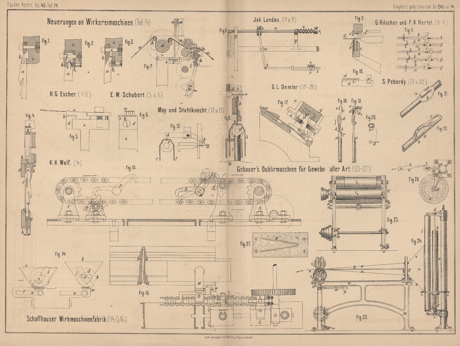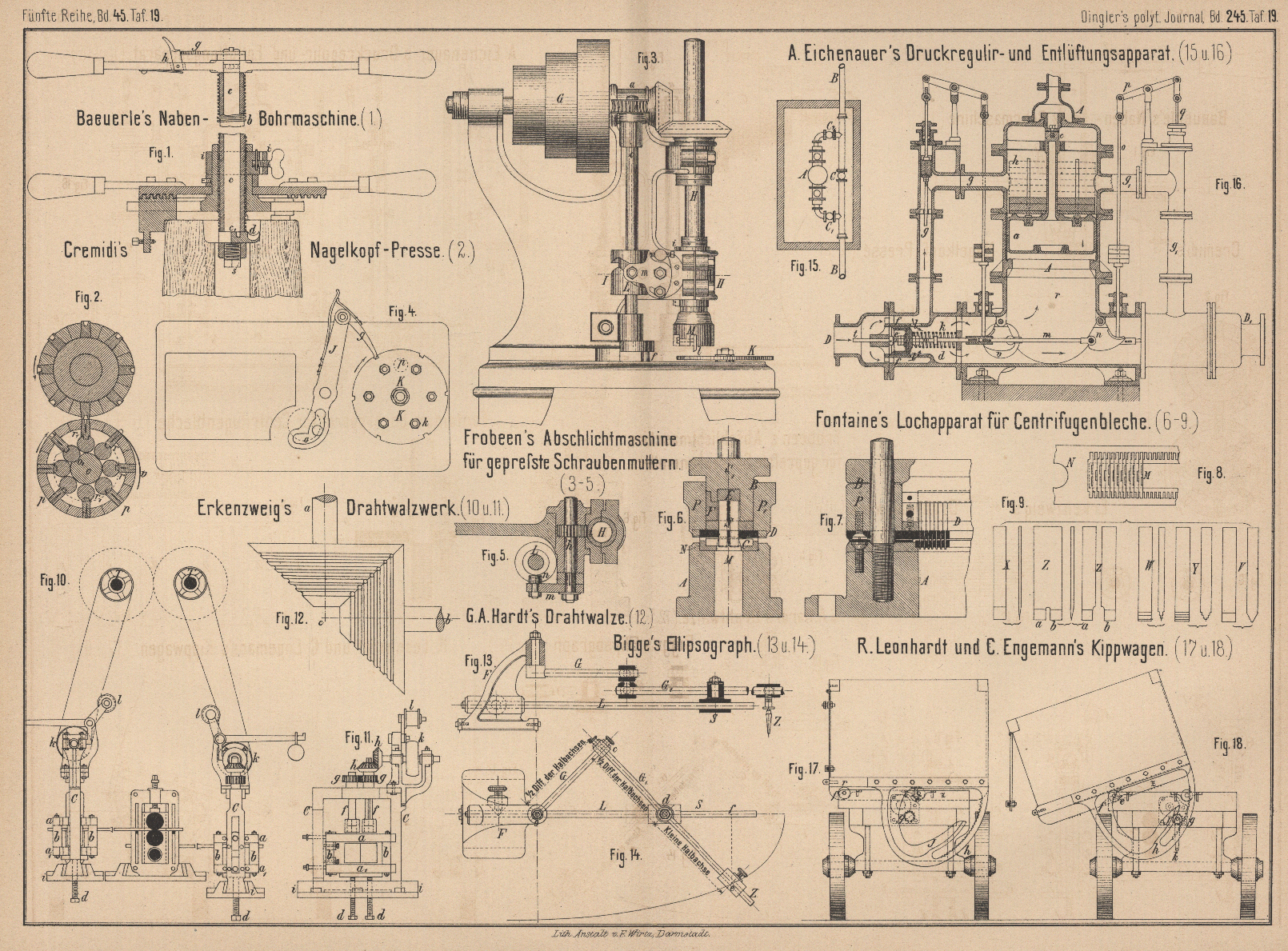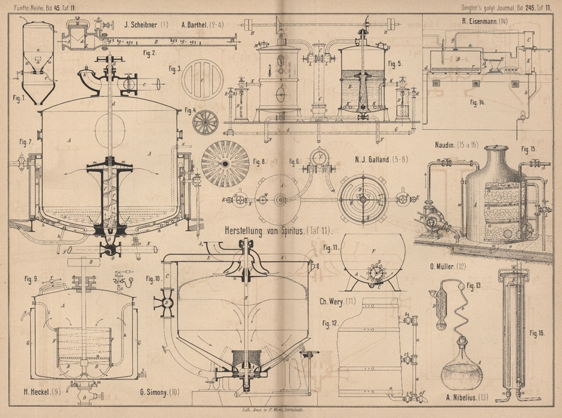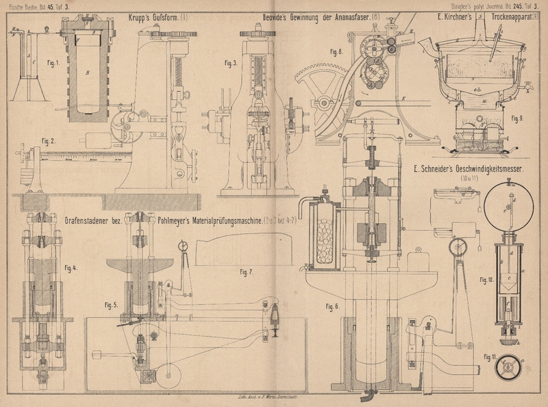 DINGLER'S Polytechnisches Journal. Herausgegeben von Prof. Joh. Zeman und Dr. Ferd. Fischer in Stuttgart in Hannover. 63. Jahrgang: 26. Juli 1882. Band 245. Heft 4. Mit 3 Tafeln Abbildungen (Taf. 12 bis 14) und Holzschnitten. Stuttgart. Verlag der J. G. COTTA'schen Buchhandlung.1882 Anzeigen der Redactionvon Dingler's polytechnischem Journal. Inhalt von Nr. 4 Band 245. * bedeutet mit Abbild. Zur Geschichte der Centrifugal-Gebläse und Pumpen; von Prof. H. Fritz in Zürich * 145 Neuerungen an Condensationswasser-Ableitern; von G. Kuntze in Göppingen *, H. Winkel in Chemnitz *, Rob. Meyer in Breslau *, Fr. Egerle in Horic *, L. Reuter in Halle a. S.*, H. Lancaster in Pendleton bei Manchester *, Zander in Schwientochlowitz *, E. Nacke in Dresden * 147 Neuerungen an Dampfcylindern; von W. Hanna in Gilroy, Nordamerika * 151 Gelenkruder für Schiffe; von A. Figge, G. A. Köttgen und H. Wedekind in London * 152 Ueber Neuerungen an Wirkereimaschinen (Forts.): Direkte Lagerung der stehenden Platinen in Handwirkmaschinen von H. G. Escher in Kleinneuschönberg, Sachsen *. Platinenanordnung für Handwirkstühle von Karl H. Wolf in Grüna *. Nadellagerung für Handwirkstühle von E. W. Schubert in Olbernhau *. Ausrückvorrichtung für Kettenstühle von Jak. Landau in Berlin *. Einrichtung zur Herstellung von Deckelfersen von der Société Poron frères, fils et Mortier in Troyes. Mechanischer Ränderwirkstuhl für reguläre Waare von Gebrüder Herfurth in Chemnitz. Preismustervorrichtung für flache Wirkstühle von G. Hilscher und F. A. Hertel in Chemnitz *. Preſsmustervorrichtung von May und Stahlknecht in Stollberg *. Einrichtung zur selbstthätigen Verschiebung der Seitendreiecke und Antriebeinrichtung für die Schlösser der Lamb'schen Strickmaschine von der Schaffhauser Strickmaschinenfabrik in Schaffhausen*. Strickmaschine, deren Nadeln mittels Hebel von den Schlössern bewegt werden *, Nieten für Zungennadeln und Zungennadeln mit verschiebbarer anstatt drehbarer Zunge * von G. L. Oemler in Plagwitz. Verfahren zur Herstellung von Strickmaschinennadeln von S. Peberdy in Philadelphia* 152 Neuerung an Bublirmaschinen für Gewebe aller Art; von Fr. Gebauer in Charlottenburg * 159 Verfahren zum Gieſsen von Hochofenschlacke; von A. D. Elbers in Hoboken, Nordamerika * 161 Neuerungen an Winderhitzungsapparaten: Verbesserungen an Whitwell – Apparaten; von der Firma Th. Whitwell in Stockton-on-Tees, H. Massicks und W. Crooke in Millom, England *. Fuſskastenapparat von der Gleiwitzer Hütte * 161 Rückstauklappe zur Verhütung der Explosionen in Windleitungsröhren * 164 Ueber die Untersuchung von Erdöl: Verbesserter Taucher von O. Braun in Berlin *. Amtliche Einführung des Abel'schen Erdölprüfers im Deutschen Reich *. Ueber den Entflammungspunkt von C. Engler. Apparat zur gefahrlosen Untersuchung von Erdöl auf seine Entzündlichkeit von P. Semmler in Lieberose * 165 Ueber die Analyse von Dynamiten; von Prof. Dr. G. Lunge in Zürich 171 Ueber die Ursache der sauren Reaction mancher Papiersorten; von Prof. Dr. Feichtinger in München 174 Ueber Patinabildung; von Prof. Dr. Rud. Weber in Berlin (Forts.) 176 Ueber das Bleichen mit Schwefligsäure; von Marius Moyret 183 Ueber die Kosten der elektrischen Beleuchtung: Personenhalle des Schlesischen Bahnhofes in Berlin. South Kensington Museum in London. Oeffentliche Beleuchtung in Norwich in England 184 Leistungsfähigkeit amerikanischer Locomotivfabriken 188 Selbstschmierendes Wellenlager von Gebrüder Bentall in Maldon, England * 188 Cordier's Schornstein auf der Elektricitätsausstellung zu Paris 1881 188 Hobelmaschine von F. und J. Butterfield in Keighley, England 189 Ueber die Tragfähigkeit genieteter Stahlträger; von Enke 189 Filterpressen von Schütz und Hertel in Würzen 190 Verfahren zur Herstellung gemusteter Gewebe; von A. L. Pollet in Roubaix 190 Statistik der Buchdruckerkunst in Deutschland und Oesterreich; von Karl Faulmann 190 Elektrische Hafenbeleuchtung in Bordeaux 191 Einfluſs des elektrischen Lichtes auf das Wachsthum der Pflanzen; von C. W. Siemens in London 191 Zur Kenntniſs der Saccharine; von H. Kiliani und L. Cuisinier 191 Ueber Freiburger Poudrette; von J. Neßler 191 Herstellung von Salpeter aus Osmosewasser 192 Gewinnung von Glycerin aus den Unterlaugen der Seifenfabrikation; von L. Dalton und Comp. in Frankfurt a. M. S. 192 Es wird höflichst ersucht, alle die Redaction betreffenden Mittheilungen, Sendungen u. dgl. gefälligst zu adressiren: An die Redaction von Dingler's polytechn. Journal Hrn. Prof. Joh. Zeman in Stuttgart, bezieh. Hrn. Dr. Ferd. Fischer in Hannover, Gustav Adolf-Straſse 23; alle die Expedition und Anzeigen betreffenden Schreiben an die J. G. Cotta'sche Buchhandlung in Stuttgart. Zur Geschichte der Centrifugal-Gebläse und Pumpen; von Prof. H. Fritz in Zürich. Mit Abbildungen. H. Fritz, zur Geschichte der Centrifugal-Gebläse und Pumpen. Neuerungen an Condensationswasser-Ableitern. Patentklasse 13. Mit Abbildungen auf Tafel 12 und 15. Neuerungen an Condensationswasser-Ableitern. W. Hanna's Neuerungen an Dampfcylindern. Mit Abbildung. Hanna's Neuerungen an Dampfcylindern. Gelenkruder für Schiffe. Mit Abbildung. [Gelenkruder für Schiffe.] Ueber Neuerungen an Wirkereimaschinen. Mit Abbildungen auf Tafel 14. (Patentklasse 25. Fortsetzung des Berichtes S. 125 Bd. 244.) Ueber Neuerungen an Wirkereimaschinen. Neuerung an Dublirmaschinen für Gewebe aller Art; von Fr. Gebauer in Charlottenburg. Mit Abbildungen auf Tafel 14. Gebauer's Dublirmaschine für Gewebe aller Art. Verfahren zum Gieſsen von Hochofenschlacke. Mit Abbildungen auf Tafel 13. [Verfahren zum Gieſsen von Hochofenschlacke.] Neuerungen an Winderhitzungsapparaten. Patentklasse 18. Mit Abbildungen auf Tafel 13. Neuerungen an Winderhitzungsapparaten. Die Explosionen in Windleitungsröhren. Mit Abbildung auf Tafel 13. Die Explosionen in Windleitungsröhren. Ueber die Untersuchung von Erdöl. Mit Abbildungen auf Tafel 13. Ueber die Untersuchun