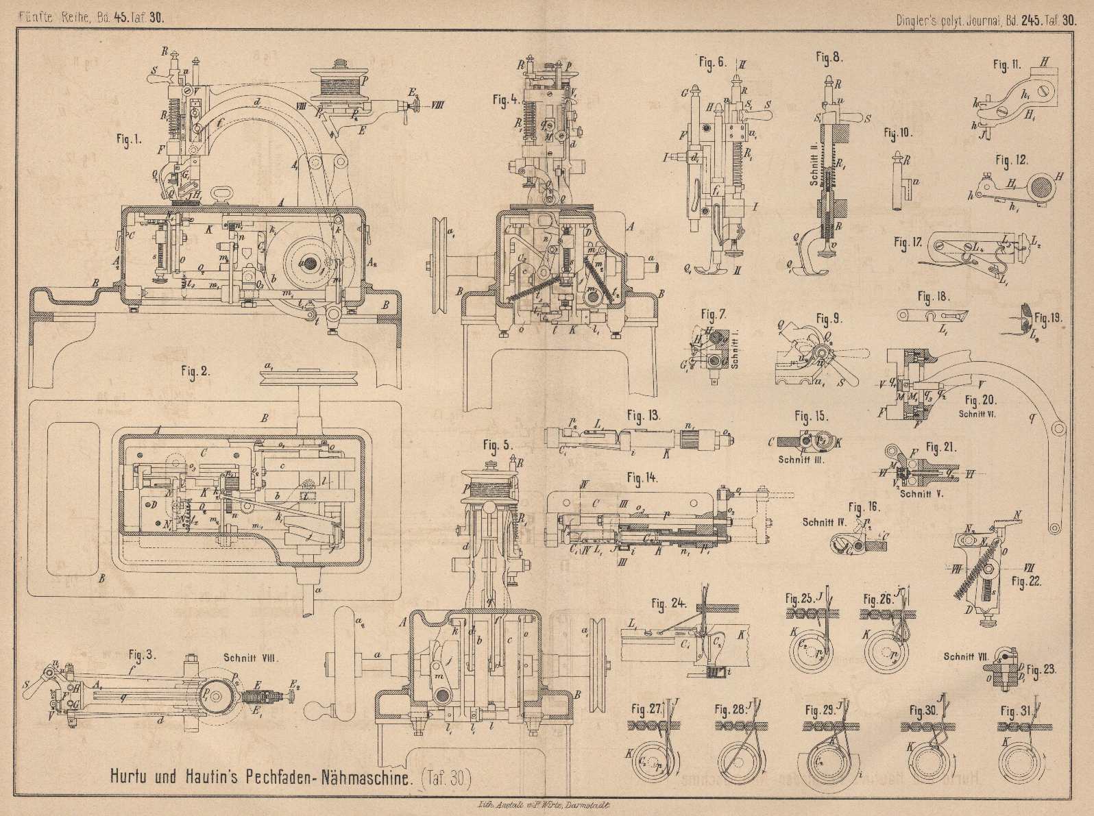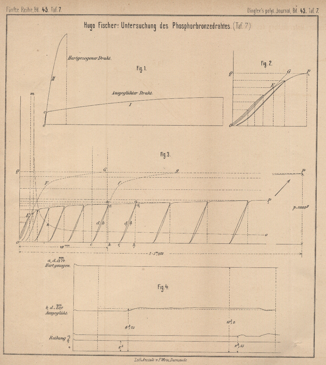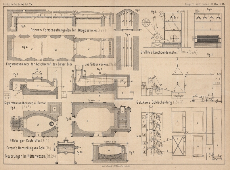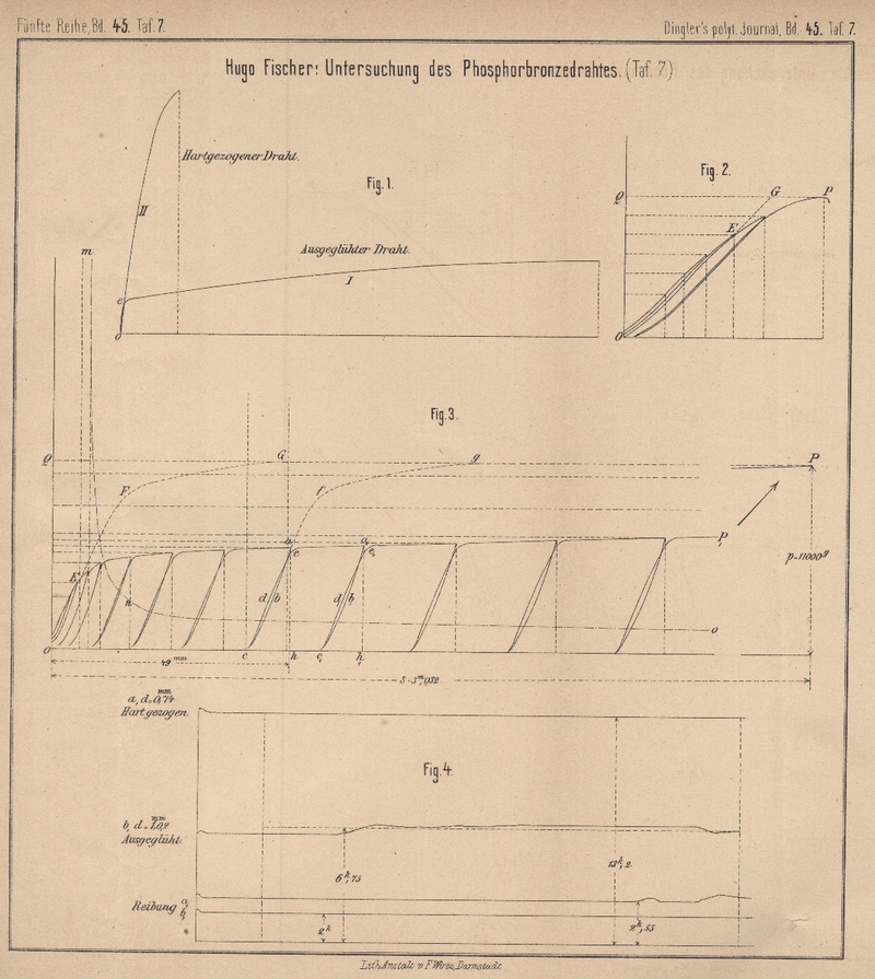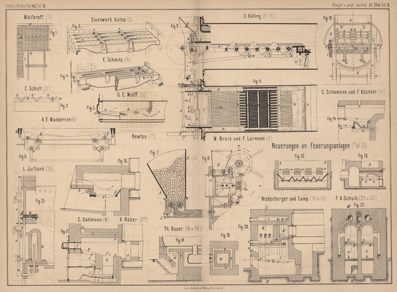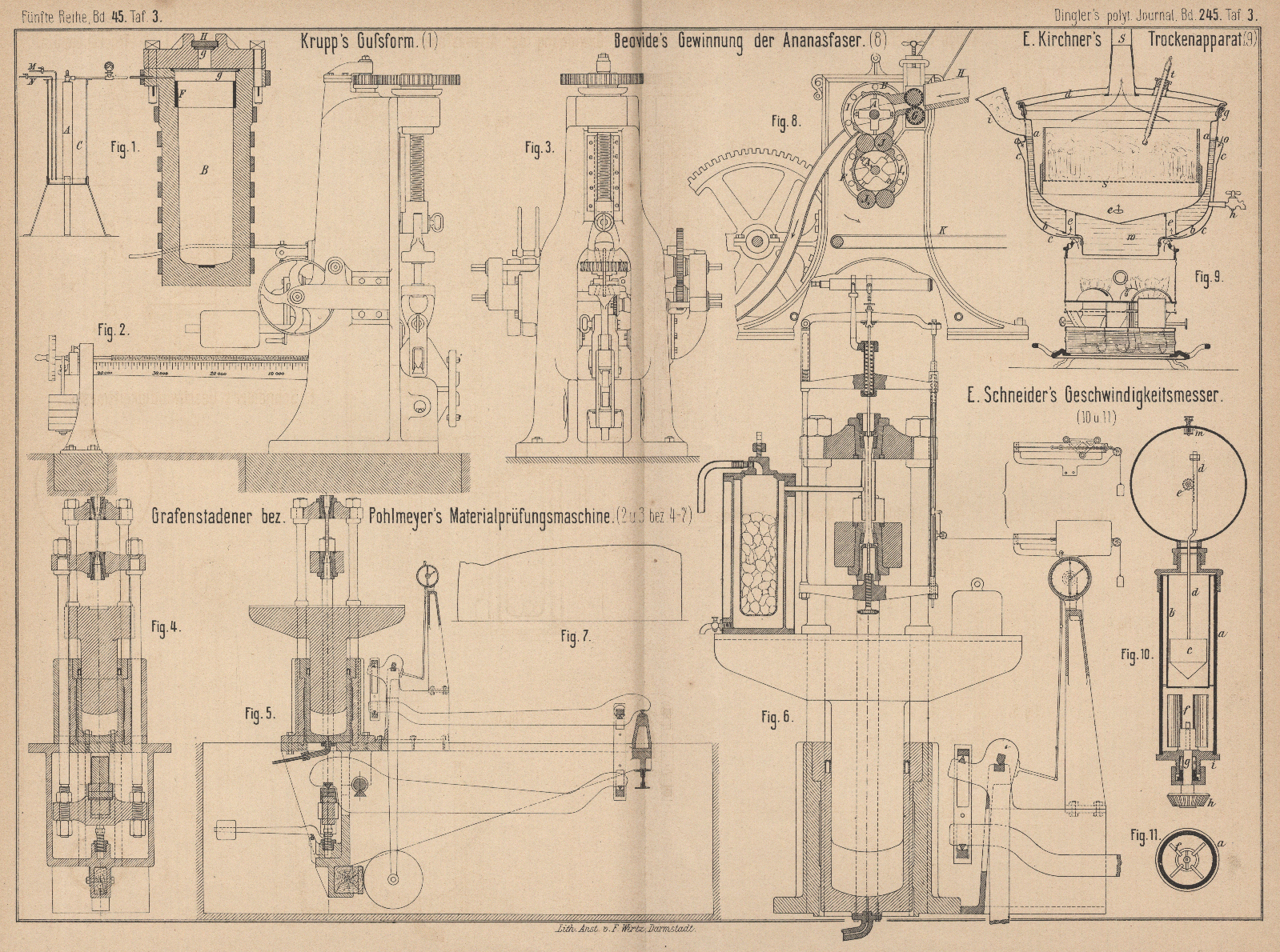 DINGLER'S Polytechnisches Journal. Herausgegeben von Prof. Joh. Zeman und Dr. Ferd. Fischer in Stuttgart in Hannover. 63. Jahrgang: 13. September 1882. Band 245. Heft 11. Mit 3 Tafeln Abbildungen (Taf. 29 bis 31) und Holzschnitten. Stuttgart. Verlag der J. G. COTTA'schen Buchhandlung.1882 Textabbildung Bd. 245 Anzeigen der Redactionvon Dingler's polytechnischem Journal. Inhalt von Nr. 11 Band 245. * bedeutet mit Abbild. Ueber die Beurtheilung der Dampfkesselfeuerungen (Nachtrag); von Ferd. Fischer 437 Neuerungen an zwangläufigen Ventilsteuerungen (Schluſs); von O. Köchy in Berlin*, L. A. Riedinger in Augsburg*, der Maschinenfabrik „Cyclop“ (Mehlis und Behrens) in Berlin *, F. Knüttel in Barmen*, M. Kuchenbecker in Schweidnitz, Schlesien* 439 Wagenbremse von Atkinson und Phillipson in Newcastle-on-Tyne* 442 Die Pechfaden-Nähmaschine mit Schiffchen; von Hurtu und Hautin in Paris* 443 Elektrische Normaluhr mit frei schwingendem Pendel und constantem Antriebe; von H. Grau in Kassel* 449 Hygroskop von O. Mithoff in Berlin 452 Ueber Neuerungen im Hüttenwesen (Fortsetzung): Verwendung der Gröbe-Lürmann'schen Generatoren für belgische Zinkdestilliröfen; von F. Lürmann in Osnabrück *. Verfahren zur Raffination von unreinem Zink; von W. Merton in Frankfurt a. M. *. Herstellung von Zink mittels Elektricität; von L. Létrange in Paris* 453 Ueber Cement und dessen Verwendung (Fortsetzung): Die russischen Normen; von Böhme. Einfluſs der Menge des Wasserzusatzes bei Ermittelung der Bindezeit des Cementes; von Heintzel, H. Delbrück, A. Bernoully, Dyckerhoff und Herzog. Ueber Anfertigung der Normenproben; von Bernoully, Erdmenger, R. Dyckerhoff und Delbrück 456 Die Verarbeitung von Melasse mittels Strontian (Schluſs) von C. Scheibler und über die Zusammensetzung des Strontiumsaccharates von H. Landolt und K. Degener 465 Die Bestimmung des Alkoholgehaltes gegohrener Flüssigkeiten; von Dr. Georg Holzner, Professor in Weihenstephan 470 Ausblase-Apparat zur Verminderung des Geräusches für Gasmotoren; von W. Weißenbach in Zürich 473 Kleine Blechschere für kräftige Schnitte; von E. Sherwin in Birmingham 473 Schmierapparat für Dampfkolben u. dgl.; von W. Schober und W. Letsche in Mülhausen, Elsaſs * 474 Thonrohrgeflecht zur Befestigung von Deckenputz; von S. Müller in Oberföhring bei München 474 Putzsteine von C. Benneke in Berlin 474 Ueber Kosten und Vorzüge der elektrischen Zimmerbeleuchtung; von W. Crookes u.a. 474 Herstellung von Feueranzündern; von A. Hafner in Meerane 475 Flammensichere Isolirgurten von J. Weiler in Köln 475 Herstellung einer guten billigen Schreibtinte 475 Analyse einiger deutschen Porteroder Gesundheitsbiere; von E. Geißler 476 Theeconserve von der Königsberger Thee-Compagnie in Berlin 476 Herstellung von Chlorbarium; von B. Lach in Wien 476 Herstellung von Magnesia mittels Diffusion; von Th. Schlösing in Paris 476 –––––––––– Bei der Redaktion ist nachstehendes WerkDie verehrl. Verlagshandlungen werden gebeten, bei Zusendung von Recensionsexemplaren die Ladenpreise derselben beizufügen. eingelaufen: Gustav Eger: Technologisches Wörterbuch in englischer und deutscher Sprache. Die Wörter und Ausdrucksweisen in Civil- und Militär-Baukunst, Schiffsbau, Eisenbahnbau, Straſsen-, Brücken- und Wasserbau, Mechanik und Maschinenbau, Technologie, Künste, Gewerbe und Fabrikindustrie, Landwirthschaft, Handel und Schifffahrt, Bergbau und Hüttenkunde, Geschützwesen, Physik, Chemie, Mathematik, Astronomie, Mineralogie, Botanik etc. umfassend. In Verbindung mit mehreren Mitarbeitern herausgegeben. 1. Theil: Englisch-Deutsch. Technisch durchgesehen und vermehrt von Otto Brandes. 711 S. in gr. 8. Preis 9 M. (Braunschweig 1882. Friedr. Vieweg und Sohn). –––––––––– Es wird höflichst ersucht, alle die Redaction betreffenden Mittheilungen, Sendungen u. dgl. gefälligst zu adressiren: An die Redaction von Dingler's polytechn. Journal Hrn. Prof. Joh. Zeman in Stuttgart, bezieh. Hrn. Dr. Ferd. Fischer in Hannover, Gustav Adolf-Straſse 23; alle die Expedition und Anzeigen betreffenden Schreiben an die J. G. Cotta'sche Buchhandlung in Stuttgart. ☞ Prof. Zeman in Stuttgart wohnt Hoppenlaustraſse 2 ☜ (Ecke der Schloſsstraſse). Königlich Bayerische Technische Hochschulein München. Das Wintersemester 1882/83 beginnt am 16. Oktober mit der Inscription, welche 14 Tage dauert. Die Vorlesungen und Uebungen fangen am 2. November an. Das ausführliche Verzeichniss derselben nebst Angabe der Tage und Stunden ist im Programme pro 1882/83 enthalten, welches auch die näheren Aufschlüsse über die Organisation der technischen Hochschule, Studienpläne, Prüfungen, Stipendien u.s.w. gibt und auf Verlangen sofort vom Sekretariate zugesendet wird. Directorium der K. b. technischen Hochschule.Dr. C. M. v. Bauernfeind. [432-433]2 ☞ Diesem Hefte liegt bei ein Prospekt von Dreyer, Rosenkranz & Droop in Hannover. Ueber die Beurtheilung der Dampfkesselfeuerungen; von Ferd. Fischer. (Nachtrag zur Abhandlung S. 357 und 397 d. Bd.) F. Fischer, über die Beurtheilung von Dampfkesselfeuerungen. Neuerungen an zwangläufigen Ventilsteuerungen. Mit Abbildungen auf Tafel 25, 27 und 29. (Patentklasse 14. Schluſs des Berichtes S. 401 dieses Bandes.) Neuerungen an zwangläufigen Ventilsteuerungen. Atkinson und Phillipson's Wagenbremse. Mit Abbildung. Atkinson und Phillipson's Wagenbremse. Die Pechfaden-Nähmaschine mit Schiffchen; von Hurtu und Hautin in Paris. Mit Abbildungen auf Tafel 30. Hurtu und Hautin's Pechfaden-Nähmaschine. Elektrische Normaluhr von H. Grau in Kassel. Mit Abbildungen. Grau's elektrische Normaluhr. Hygroskop von O. Mithoff in Berlin. Mithoff's Hygroskop. Ueber Neuerungen im Hüttenwesen. Mit Abbildungen auf Tafel 31. (Patentklasse 40. Fortsetzung des Berichtes S. 333 dieses Bandes.) Ueber Neuerungen im Hüttenwesen. Ueber Cement und dessen Verwendung. (Fortsetzung des Berichtes S. 381 d. Bd.) Ueber Cement und dessen Ver
