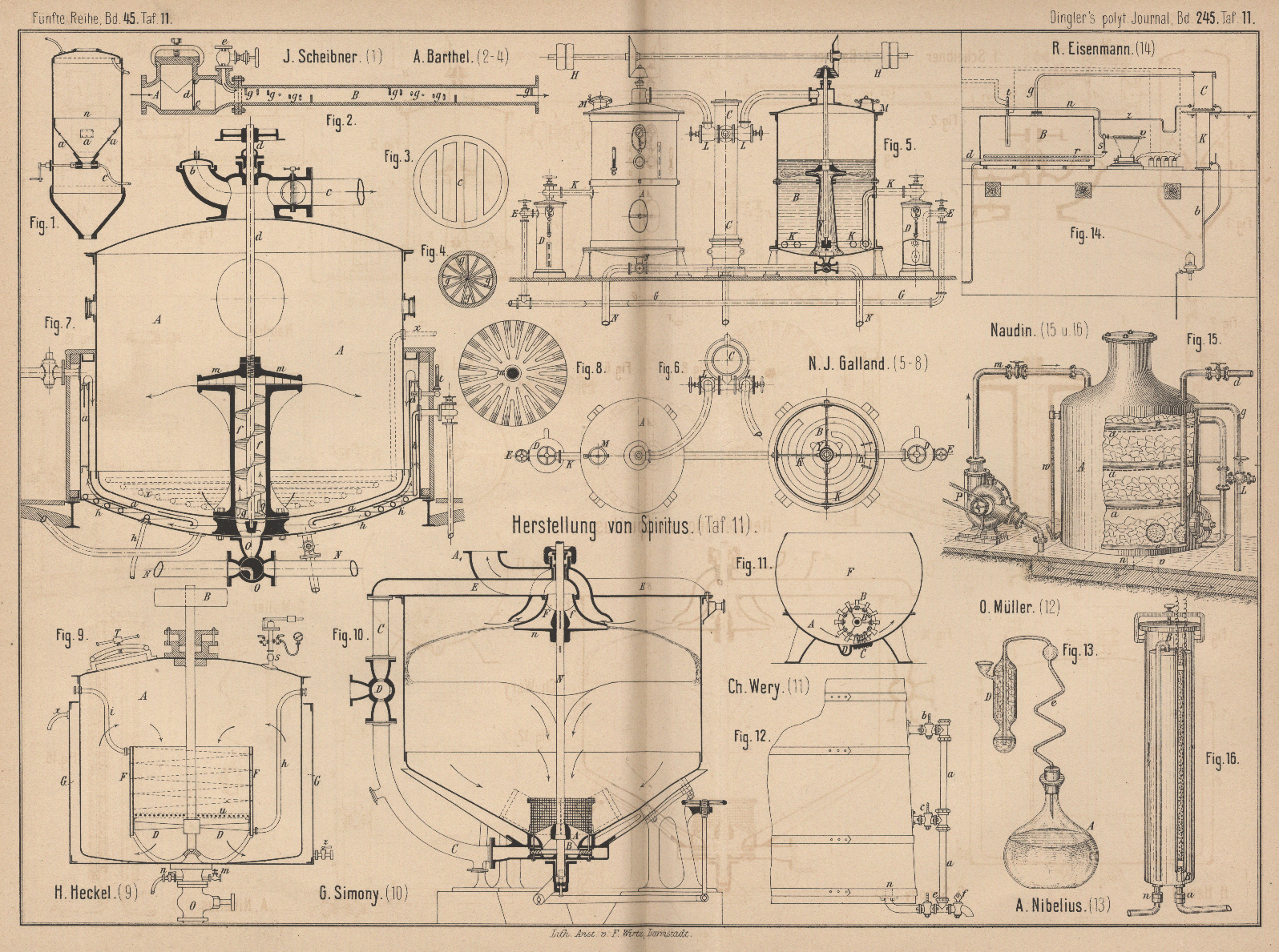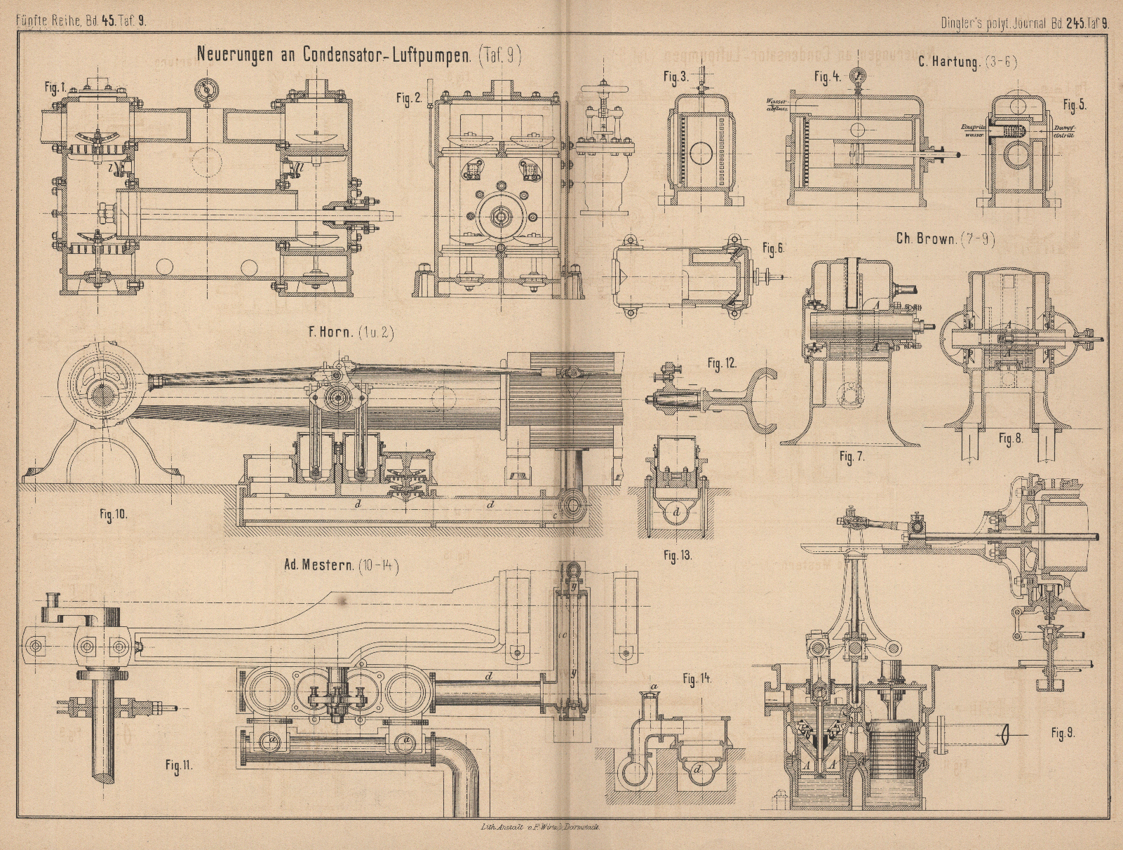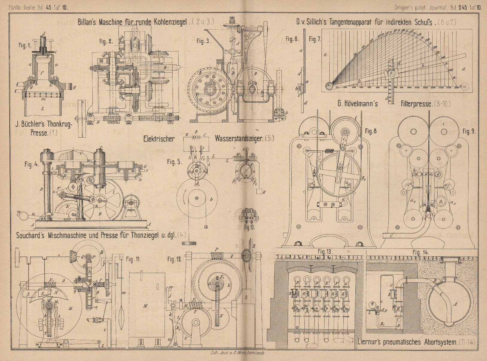DINGLER'S Polytechnisches Journal. Herausgegeben von Prof. Joh. Zeman und Dr. Ferd. Fischer in Stuttgart in Hannover. 63. Jahrgang: 19. Juli 1882. Band 245. Heft 3. Mit 3 Tafeln Abbildungen (Taf. 9 bis 11) und Holzschnitten. Stuttgart. Verlag der J. G. COTTA'schen Buchhandlung.1882 Textabbildung Bd. 245 Anzeigen der Redactionvon Dingler's polytechnischem Journal. Inhalt von Nr. 3 Band 245. * bedeutet mit Abbild. Neuerungen an Condensator-Luftpumpen; von F. Horn in Wetter a. d. Ruhr *, C. Hartung in Nordhausen *, C. Brown in Winterthur *, Ad. Mestern in Wilhelmshütte bei Sprottau* 97 Vorrichtung zum selbstthätigen Löschen des Kesselfeuers bei Wassermangel; von C. Dahlmann in Courl * 99 Entlasteter Schieber von W. S. Hughes in Long Island City, N.-Y.* 99 Dimensionirung der Riementriebe; von Prof. Josef Pechan in Reichenberg 100 Tangenten-Apparat für den indirekten Schuſs; von D. v. Sillich in Spandau * 106 Elektrischer Wasserstandszeiger der Silvertown-Company * 107 Maschinen zur Verarbeitung des Thones und zur Herstellung von Kohlenziegeln: Maschine zum Pressen der Braunkohlen, Lohe, Sägespäne, des Torfes u. dgl. von Edm. Geisenberger und Em. Picard in Brüssel. Thonkrugpresse von Jakob Büchler in Sayn bei Coblenz *. Abschneidetisch für Ziegelsteine von F. H. Hetschold in Nippes. Billan's Maschine zum Verfertigen rundlicher Kohlenziegel *. Boulton's Töpferei-Maschinen. Mischmaschine und Presse mit Drehtisch zum Formen der Thonziegel, Träberkuchen u. dgl. von L. Souchard in Berlin *. Ziegelpressen für Handbetrieb von C. Schlickeysen in Berlin 108 Filterpresse von G. Hövelmann in Berlin * 112 Selbstthätige Betriebseinrichtungen zur Entfernung von Abortstoffen aus Städten; von Ch. T. Liernur in Haarlem * 113 Ueber die Herstellung von Spiritus: Dämpfapparat von J. Scheibner in Berlin*. Zerkleinerungsapparat für im Henze'schen Apparat gedämpfte Kartoffeln, Mais u. dgl. von A. Barthel in Reibersdorf bei Zittau *. Maischverfahren von A. W. Gillmann und S. Spencer in Southwark, England. Bereitung von Maische für Brennereien und Brauereien von N. J. Galland in Paris *. Maischapparat von H. Heckel in Naila bei Hof *. Maischbottich von G. Simony in Königsberg *. Maischapparat von J. Hampel in Dresden. Maisch- und Zerkleinerungsapparat von Ch. Wery in Zweibrücken*. Gährbottich von O. Müller in Neu-Ulm*. Apparat zur Bestimmung der Gährkraft von Preſshefe von A. Nibelius *. Apparat zur Reinigung des Rohspiritus von R. Eisenmann in Berlin *. Apparat zur Reinigung des Spiritus von L. Naudin und J. Schneider in Paris *. Verfahren zur Reinigung von Alkohol aus Runkelrüben oder Melasse; von L. Salzer in Wien 115 Darstellung von reinem Stärkezucker: Herstellung von reinem wasserfreiem Stärkezucker-Dextroseanhydrid von F. Soxhlet in München. Mittheilungen über Krystallisation des wasserfreien Traubenzuckers aus wässeriger Lösung von A. Behr 121 Ueber Patinabildung von Prof. Rud. Weber in Berlin (Fortsetzung) 125 Zur Kenntniſs der Albocarbonbrenner; von Prof. Fr. Rüdorff in Berlin 131 Ueber Indigofarbstoffe: Ueber die Verbindungen der Indigogruppe von A. Baeyer. Darstellung des künstlichen Indigos von der Badischen Anilin- und Sodafabrik in Ludwigshafen 137 Sicherheitsdichtungsring für Dampf- und Heiſsluftröhren; von Wilh. Daniels in Rheinberg * 139 Centrirkörner für dünne Wellen u. dgl.; von R. K. Jones in Birkenhead * 140 Kluppen zum Festhalten von Geweben; von C. H. Weisbach in Chemnitz * 140 Selbstthätiger Feuerlöschapparat von H. S. Parmelle in New-Haven 140 Die Lampen für getheiltes elektrisches Licht auf der Pariser Ausstellung 1881; von Dr. O. Frölich in Berlin 140 Herstellung von Gegenständen aus Zellstoff; von A. Parkes in Birmingham 141 A. Crawford's Verfahren zur Herstellung eines an Silicium reichen Roheisens 142 R. v. Petersen's Anstrich für Eisen als Rostschutz und schlechter Wärmeleiter 142 Verfahren zur Reinigung des Rübensaftes; von O. Licht in Magdeburg und E. A. Schott in Kreiensen 142 Ueber die Veränderungen des Milchcaseïns; von E. Meiſsl 142 Herstellung von Malzextract aus Malzgelée; von L. Hoff in Hamburg 143 F. Wibel's Verarbeitung der Straſsfurter Kalisalze 143 Herstellung von Zimmtsäure; von der Badischen Anilin- und Sodafabrik in Ludwigshafen und den Farbwerken, vormals Meister, Lucius und Brüning in Höchst 144 Neue Anstrichmassen: O. Kall's Untergrund für Oelfarbenanstrich. A. B. Rodyk's Herstellung eines Schutzanstriches gegen die Einflüsse von Seewasser, Dämpfen u. dgl. E. Heim's Stiefelwichse. G. Glafey's Herstellung wasserundurchlässiger, säurefreier Wichsen und Polituren für Leder, Holz, Stein und Metall 144 Bezeichnung der deutschen Maſse, Gewichte und Münzen. 1 Kilometer 1km 1 Liter (Cubikdecimeter) 1l 1 Meter 1m 1 Cubikcentimeter 1cc 1 Centimeter 1cm 1 Tonne (1000k) 1t 1 Millimeter 1mm 1 Kilogramm 1k 1 Hektar 1ha 1 Gramm 1g 1 Ar (Quadratdekameter) 1a 1 Milligramm 1mg 1 Quadratmeter 1qm 1 Meterkilogramm 1mk 1 Quadratcentimeter 1qc 1 Pferdestärke (Pferdeeffect) 1e 1 Quadratmillimeter 1qmm 1 Atmosphärendruck 1at 1 Cubikmeter 1cbm 1 Reichsmark 1 M. 1 Hektoliter 1hl 1 Markpfennig 1 Pf. 1 Calorie 1c (Deutsches Reichs-Patent D. R. P.) Bei Druckangaben, Belastungen u. dgl. bedeutet k/qc = k auf 1qc u.s.w. Schreibweise chemischer Formeln und Bezeichnung der Citate. Um in der Schreibweise der chemischen Formeln Verwechslungen möglichst zu vermeiden und das gegenseitige Verständniſs der neuen und alten Formeln zu erleichtern, sind die alten Aequivalentformeln mit Cursiv- (schräger) Schrift und die neuen Atomformeln mit Antiqua- (stehender) Schrift bezeichnet. (Vgl. 1874 212 145.) Alle Dingler's polytechn. Journal betreffenden Citate werden in dieser Zeitschrift einfach durch die auf einander folgenden Zahlen: Jahrgang, Band (mit fettem Druck) und Seitenzahl ausgedrückt. * bedeutet: Mit Abbild. Es wird höflichst ersucht, alle die Redaction betreffenden Mittheilungen, Sendungen u. dgl. gefälligst zu adressiren: An