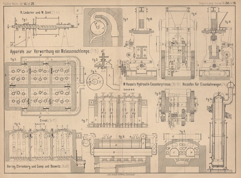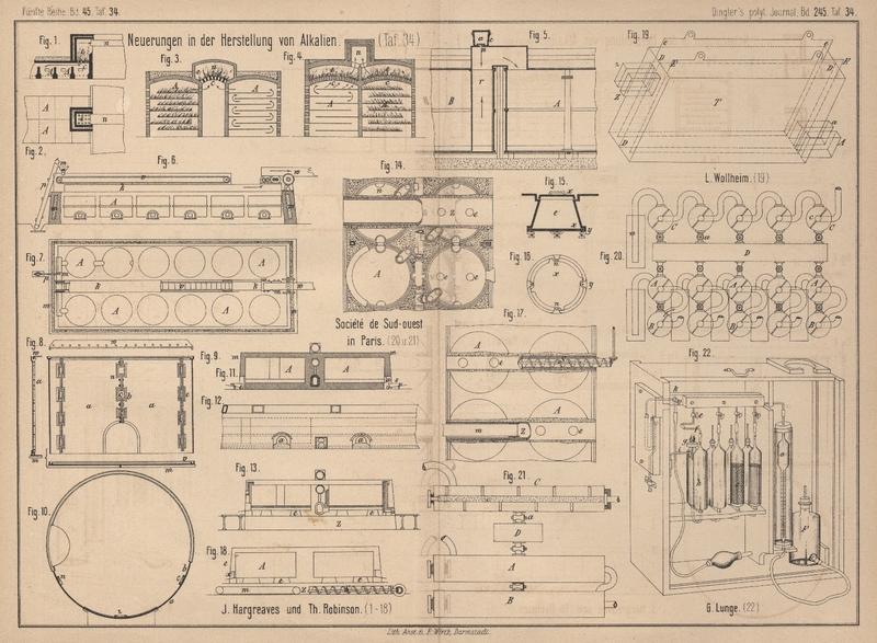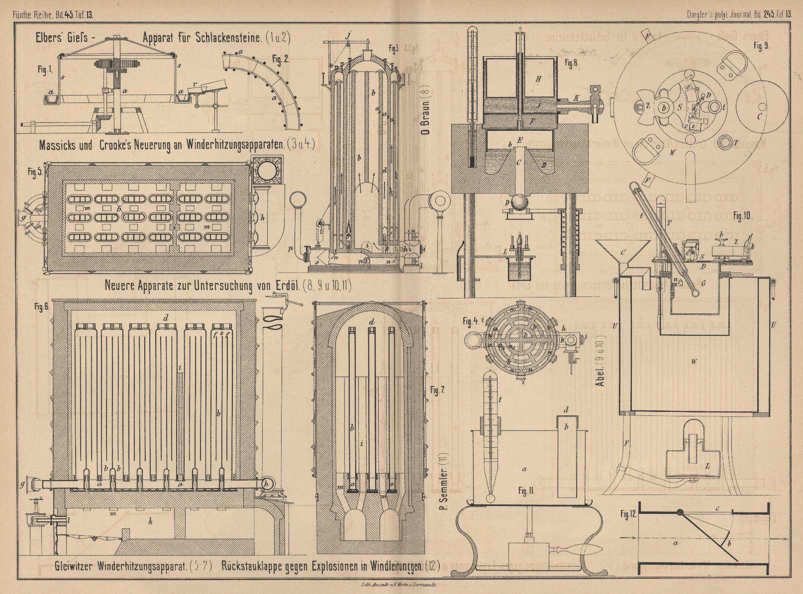 DINGLER'S Polytechnisches Journal. Herausgegeben von Prof. Joh. Zeman und Dr. Ferd. Fischer in Stuttgart in Hannover. 63. Jahrgang: 27. September 1882. Band 245. Heft 13. Mit 2 Tafeln Abbildungen (Taf. 33 und 34). Stuttgart.Verlag der J. G. COTTA'schen Buchhandlung.1882 Textabbildung Bd. 245 Anzeigen der Redaction vonDingler's polytechnischem Journal. Inhalt von Nr. 12 und 13 Band 245. * bedeutet mit Abbild. ☞ Durch ein Versehen der Buchbinderei ist der für Heft 13 bestimmte Textbogen 37 bereits dem 12. Heft beigebunden worden, wodurch aber die richtige Aufeinanderfolge im Band nicht gestört ist. ☜ G. Wellner's direktwirkende Balanciermaschinen für Wasser und Luft* 477 R. Ardelt's Neuerung an Kettenrollen* 484 Chuwab's dynamometrische Kuppelung* 484 Clouth's Doppelösenschrauben für Gummitreibseile* 485 O. und J. Weir's Vorrichtung zur Untersuchung von Kesselspeisewasser* 486 L. Thieme's Sicherheitsvorrichtung für Dampfkessel* 487 Dinnendahl's Neuerung an Luftcompressoren* 488 Taylor's Reibungskupplung für Schiffswinden* 489 Heydrich's Sicherheitsbuffer für Eisenbahnfahrzeuge* 489 Lenz's Herstellung von Spiralbohrern* 490 Schutzvorrichtungen für Holzhobelmaschinen; von A. Groſs und J. Frank* 491 Bartosch's Stellvorrichtung für Gewindeschneidkluppen * 492 Neuerungen an Feder- und Fallhämmern: C. A. Angström's Federhammer*. B. und S. Massey's Frictionsfallhammer*. J. Cuthbert's Fallhammer 492 Ueber die Festigkeitseigenschaften von Tauwerk- von E. Hartig 494 Ueber Cement und dessen Verwendung (Schluſs): Ueber das Brennen von Cement; von Tomei. Vortheilhafte Verwendung und Verarbeitung des Portlandcementes zu Mörtel und Beton; von R. Dyckerhoff. Beobachtung über Witterungseinflüsse auf die Mörtel; von Dyckerhoff und Hauenschild 499 Die Verarbeitung von Melasse mittels Strontian (Nachtrag); von C. Scheibler 506 Neuerungen in der Herstellung von Alkalien: J. Hargreaves und Th. Robinson's Herstellung von schwefelsaurem Natrium und Kalium. L. Wollheim's Gewinnung von reinen Aetzalkalien mittels Elektrolyse *. Herstellung von Soda mittels Ammoniak; von der Société anonyme de Sud-ouest in Paris*. Verwerthung des Ammoniakwassers und Nachtrag zu den Untersuchungsmethoden für Sodafabriken (Bestimmung des Wasserstoffes in Generatorgasen); von G. Lunge* 508 Verwendung der beim basischen Entphosphorungsverfahren fallenden Schlacke in der Landwirthschaft 513 Keith's Verfahren zum elektrolytischen Entsilbern des Werkbleies; von Hampe 515 Schädliche Wirkung eines Kupfer haltigen Oeles in der Türkischrothfärberei; von E. Schaal 516 Kleinere Mittheilungen:G. Wachtel's Verwerthung der Stickstoffverbindungen aus Schwefelsäurefabriken 517Ueber Dampfkesselexplosionen; von Obé, V. Pierre u.a. 517R. Schöttler's Bremsversuche mit einer Erdölkraftmaschine 518Scriven's Kesselblech-Biegemaschine 519H. Reisert's Lagerschmiervorrichtung für dickflüssige Schmiere* 520E. Rasch und E. Kirchner's Herstellung von braunem und weiſsem Holzstoff 520Herstellung der Eisenbahnwagenräder aus Papier in Nordamerika 520K. Burnett's Eisenfänger für Papierstoff-Leitungen 521Zur Frage der allgemeinen Anwendung der elektrischen Glühlichtbeleuchtung; von Edison, C. W. Siemens, J. Hopkinson, R. Crompton und E. Johnson 521E. Campe's Kleister zum Aufkleben von Etiquetten auf Flaschen 523Zusammensetzung vulkanischer Aschen vom Aetna und vom Vesuv; von L. Ricciardi 523M. Traub's Untersuchung des englischen Methylenchlorides von Robbinson 523Zur Prüfung des Wismuthnitrates; von W. Lenz 523Semper und Fahlberg's Abscheidung von Eisen aus Salzlösungen 524J. Webster's Verfahren zur Gewinnung von Thonerde zur Herstellung von Aluminiumchlorid und Aluminiummetall 524A. Huët's Gewinnung von Speisefett und Leim aus Schlachthausabfällen 524Dunaj's Schwellenbohrer* 524Namen- und Sachregister des 245. Bd. von Dingler's polytechn. Journal 525 –––––––––– Bei der Redaktion sind nachstehende WerkeDie verehrl. Verlagshand hingen werden gebeten, bei Zusendung von Recensionsexemplaren die Ladenpreise derselben beizufügen. eingelaufen: Karmarsch und Heeren's Technisches Wörterbuch. 3. Auflage, ergänzt und bearbeitet von Kick und Gintl, Professoren in Prag. Heft 57. Preis 2 M. Schlagwort „Panzerwaaren“ bis „Parfumerie.“ (Prag 1882. A. Haase.) P. E. Dabovich: Nautisch-technisches Wörterbuch der Marine. Deutsch, italienisch, französisch und englisch. 1. bis 12. Lieferung zu 2 M. (Pola 1882, Verlag der Redaction der „Mittheilungen aus dem Gebiete des Seewesens“.) Chr. Nehls: Ueber graphische Rectification von Kreisbögen und verwandte Aufgaben. 37 S. in 8. Mit 2 Tafeln. (Hamburg 1882. Paul Jenichen.) Vorlagen für Korbflechter, Muster von Geflechten, Korbmodellen und Körben. Zum Gebrauche für Korbflechter und als Lehrbehelf für Korbflechtschulen bei dem Fachzeichnen, herausgegeben von Friedrich Afh. 1. Folge. 40 Tafeln in 4. Preis 6 M. (Weimar 1883. Bernh. Friedr. Voigt.) F. Holthof: Das elektrische Licht in seiner neuesten Entwickelung mit besonderer Berücksichtigung der Pariser Elektricitätsausstellung 1881. 135 S. in 8. Mit 120 Holzschnitten. (Halle a. S. 1882 Wilh. Knapp.) –––––––––– Es wird höflichst ersucht, alle die Redaction betreffenden Mittheilungen, Sendungen u. dgl. gefälligst zu adressiren: An die Redaction von Dingler's polytechn, Journal Hrn. Prof. Joh. Zeman in Stuttgart, bezieh. Hrn. Dr. Ferd. Fischer in Hannover, Gustav Adolf-Straſse 23; alle die Expedition und Anzeigen betreffenden Schreiben an die J. G. Cotta'sche Buchhandlung in Stuttgart. ☞ Prof. Zeman in Stuttgart wohnt Hoppenlaustraſse 2 ☜ (Ecke der Schloſsstraſse). Anmerkung für den Buchbinder: Die Figurentafeln werden je nach Wunsch hinten im Band an einzelnen Ansetzblättchen angebracht, oder in einem eigenen Atlas gebunden, zu welchem das betreffende Titelblatt gehört. Inhalt des zweihundertfünfundvierzigsten Bandes. Abhandlungen, Berichte u. dgl. S. 1. 49. 97. 145. 193. 233. 