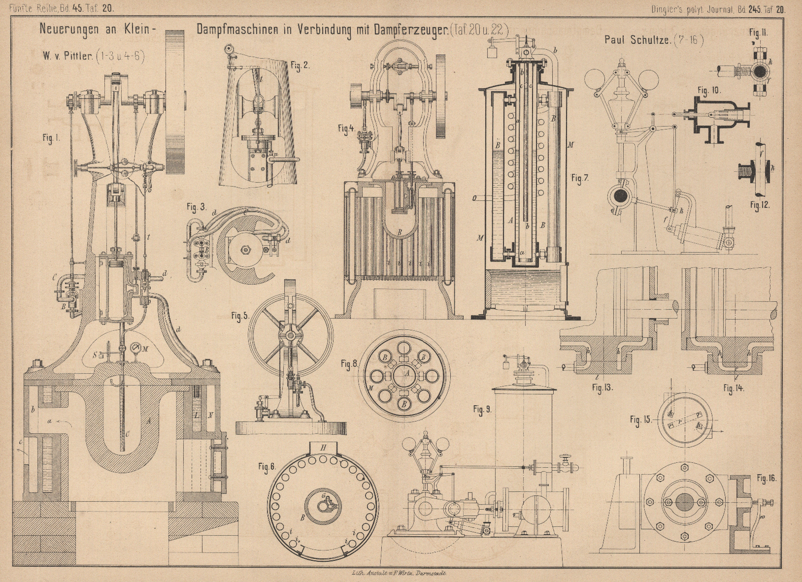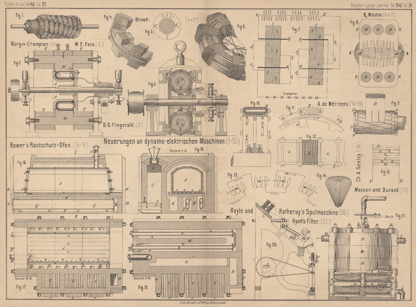 DINGLER'S Polytechnisches Journal. Herausgegeben von Prof. Joh. Zeman und Dr. Ferd. Fischer in Stuttgart in Hannover. 63. Jahrgang: 16. August 1882. Band 245. Heft 7. Mit 2 Tafeln Abbildungen (Taf. 20 und 21) und Holzschnitten. Stuttgart. Verlag der J. G. COTTA'schen Buchhandlung.1882 Textabbildung Bd. 245 Anzeigen der Redaction von Dingler's polytechnischem Journal. Inhalt von Nr. 7 Band 245. * bedeutet mit Abbild. Ueber Arbeitsübertragung durch Elektricität; von Prof. G. Schmidt in Prag 273 Neuerungen an Kleindampfmaschinen, welche mit einem Dampferzeuger verbunden sind; von W. v. Pittler in Gohlis bei Leipzig und Paul Schnitze in Berlin * 277 Pulsometer von G. A. Greeven in Brühl bei Köln * 280 Ueber Salzablagerungen in Cylindern von Schiffsmaschinen; von Marielle, Generalinspector des Génie maritime in Paris 281 Neuerungen an dynamo-elektrischen Maschinen; von R. J. Gülcher, Bürgin, W. E. Fein, D. G. Fitzgerald, Jürgensen, Brush, E. Weston, A. de Méritens, Ball, H. S. Maxim, Th. A. Edison, C. Zipernowsky, Will. W. Griscom, Gotth. Landenberger, Alfr. Niaudet und E. Reynier, Will. Elmore, Ludw. Scharnweber, Siemens und Halske, Ch. A. Seeley, Rob. Syrutschöck jun., A. Masson und J. Durand* 283 Filter für Wasser; von J. W. Hyatt in Newark* 291 Spülmaschine mit Lüstrirvorrichtung; von W. Hoyle und Jos. Rotheray in Bradford* 292 Ofen zur Erzeugung einer gegen Rost schützenden Decke auf Eisen und Stahl; von G. Bower in Saint Neots, England * 292 Bestimmung von Sauerstoff und Kohlenstoff im Eisen; von A. Ledebur in Freiberg, Sachsen 293 Beiträge zur Untersuchung der Fette: von H. Yssel de Schepper und A. Geitel in Gouda, Holland* 295 Ueber die Anwendung von Baeyer's künstlichem Indigo; von H. Schmid in Rouen 302 Herstellung von Rhodanaluminium; von Lauber und Haußmann 306 Die Luftheizung von L. H. Hauber in München; von Gustav Schmidt 306 Ueber Dauer und Festigkeit der Schachtseile und über Seilkosten; von Wenderoth und F. Baumann in Saarbrücken 308 Groſse Drehbank der Chemnitzer Werkzeugmaschinenfabrik, vormals Joh. Zimmermann in Chemnitz 309 Falzziegel von W. Ludowici in Ludwigshafen* 309 Kraftbedarf der Ganzzeugholländer 310 Ueber die Zerstörung des Eisens durch Wasser: R. Cowper's Untersuchung eines Absatzes aus dem Condensator des Schiffes „Spartan“ und J. Farquharson's Prüfung der Einwirkung von Salzwasser auf Eisen und Stahl 310 Zusammensetzung der Blätter des Kautschukbaumes (Ficus elastica); von Sacc 311 Ueber die Bildung des Zuckers in den Pflanzen; von A. Perrey 311 Ueber das Reifen der Trauben; von C. Amthor 312 U. Kreusler's Verfahren zum Paraffiniren von Kautschukwaaren 312 Ueber die Destillation roher Fettsäuren; von A. Cahours und E. Demarçay 312 Zur Herstellung von Magnesia aus Dolomit bezieh. Chlormagnesiumlauge; von C. Scheibler in Berlin und A. Wünsche in Hamburg 312 V. Merz's Herstellung von Oxalsäure 312 Bezeichnung der deutschen Maſse, Gewichte und Münzen. 1 Kilometer 1km 1 Liter (Cubikdecimeter) 1l 1 Meter 1m 1 Cubikcentimeter 1cc 1 Centimeter 1cm 1 Tonne (1000k) 1t 1 Millimeter 1mm 1 Kilogramm 1k 1 Hektar 1ha 1 Gramm 1g 1 Ar (Quadratdekameter) 1a 1 Milligramm 1mg 1 Quadratmeter 1qm 1 Meterkilogramm 1mk 1 Quadratcentimeter 1qc 1 Pferdestärke (Pferdeeffect) 1e 1 Quadratmillimeter 1qmm 1 Atmosphärendruck 1at 1 Cubikmeter 1cbm 1 Reichsmark 1 M. 1 Hektoliter 1hl 1 Markpfennig 1 Pf. 1 Calorie 1c (Deutsches Reich. Patent. D. R. P.) Bei Druckangaben, Belastungen u. dgl. bedeutet k/qc = k auf 1qc u.s.w. Schreibweise chemischer Formeln und Bezeichnung der Citate. Um in der Schreibweise der chemischen Formeln Verwechslungen möglichst zu vermeiden und das gegenseitige Verständniſs der neuen und alten Formeln zu erleichtern, sind die alten Aequivalentformeln mit Cursiv- (schräger) Schrift und die neuen Atomformeln mit Antiqua- (stehender) Schrift bezeichnet. (Vgl. 1874 212 145.) Alle Dingler's polytechn. Journal betreffenden Citate werden in dieser Zeitschrift einfach durch die auf einander folgenden Zahlen: Jahrgang, Band (mit fettem Druck) und Seitenzahl ausgedrückt. * bedeutet: Mit Abbild. –––––––––– Bei der Redaktion ist nachstehendes WerkDie verehrl. Verlagshandlungen werden gebeten, bei Zusendung von Recensionsexemplaren die Ladenpreise derselben beizufügen. eingelaufen: Dr. Fritz Eisner: Die Metalle, 1500 Vorschriften und Recepte zur Verarbeitung, Aetzen, Beizen, Brüniren, Lothe, Bronzen, Legirungen, Salze und chemische Präparate. (Halle a. S. 1882. Wilhelm Knapp.) Es wird höflichst ersucht, alle die Redaction betreffenden Mittheilungen, Sendungen u. dgl. gefälligst zu adressiren: An die Redaction von Dingler's polytechn. Journal Hrn. Prof. Joh. Zeman in Stuttgart, bezieh. Hrn. Dr. Ferd. Fischer in Hannover, Gustav Adolf-Strasse 23; alle die Expedition und Anzeigen betreffenden Schreiben an die J. G. Cotta'sche Buchhandlung in Stuttgart. Ueber Arbeitsübertragung durch Elektricität. (Fortsetzung des Berichtes S. 233 d. Bd.) G. Schmidt, über Arbeitsübertragung durch Elektricität. Neuerungen an Kleindampfmaschinen, welche mit einem Dampferzeuger verbunden sind. Patentklasse 14. Mit Abbildungen auf Tafel 20 und 22. Neuerungen an Kleindampfmaschinen. Pulsometer von G. A. Greeven in Brühl bei Köln. Mit Abbildung. Greeven's Pulsometer. Ueber Salzablagerungen in Cylindern von Schiffsmaschinen. Marielle, über Salzablagerungen in Cylindern von Schiffsmaschinen. Neuerungen an dynamo-elektrischen Maschinen. Patentklasse 21. Mit Abbildungen auf Tafel 21. Neuerungen an dynamo-elektrischen Maschinen. J. W. Hyatt's Filter für Wasser. Mit Abbildung auf Tafel 21. Hyatt's Filter für Wasser. Spulmaschine mit Lüstrirvorrichtung. Mit Abbildung auf Tafel 21. [Spülmaschine mit Lüstrirvorrichtung.] Ofen zur Erzeugung einer gegen Rost schützenden Decke auf Eisen und Stahl. Mit Abbildungen auf Tafel 21. Ofen zur Erzeugung einer gegen Rost schützenden Decke. Bestimmung von Sauerstoff und Kohlenstoff im Eisen. Ledebur's 