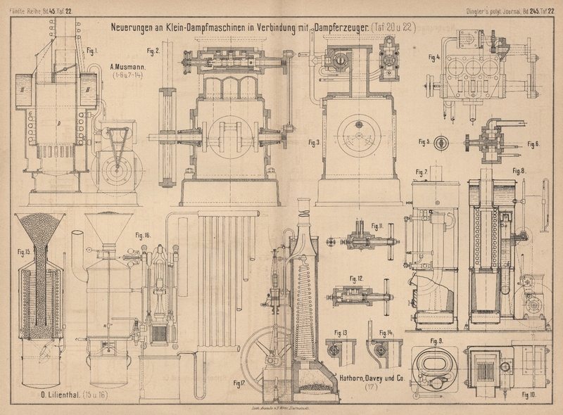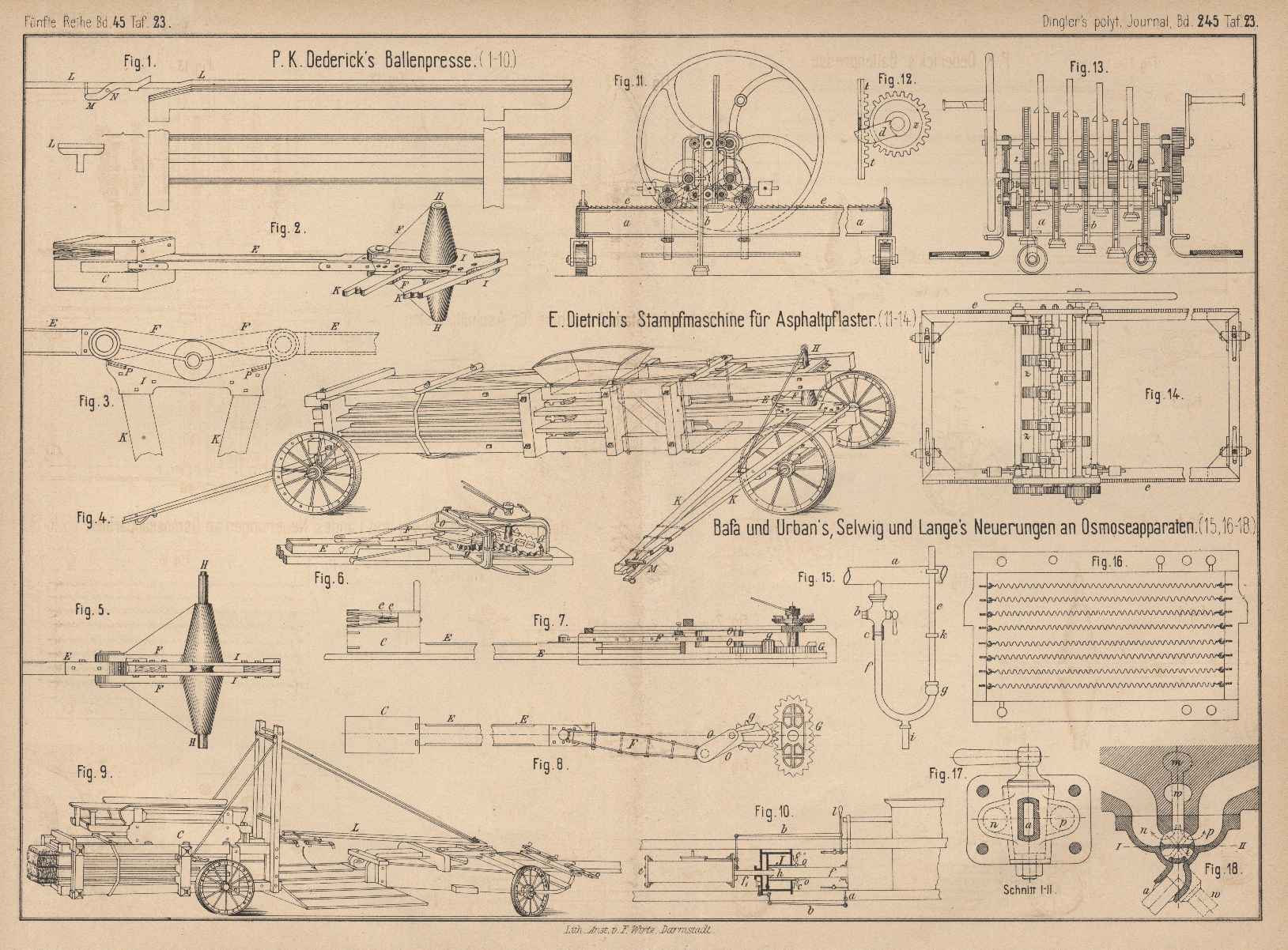 DINGLER'S Polytechnisches Journal. Herausgegeben von Prof. Joh. Zeman und Dr. Ferd. Fischer in Stuttgart in Hannover. 63. Jahrgang: 23. August 1882. Band 245. Heft 8. Mit 3 Tafeln Abbildungen (Taf. 22 bis 24) und Holzschnitten. Stuttgart. Verlag der J. G. COTTA'schen Buchhandlung.1882 Textabbildung Bd. 245 Anzeigen der Redactionvon Dingler's polytechnischem Journal. Inhalt von Nr. 8 Band 245. * bedeutet mit Abbild. Neuerungen an Kleindampfmaschinen, welche mit einem Dampferzeuger verbunden sind (Schluſs); von A. Musmann in Magdeburg*, O. Lilienthal in Berlin*, Hathorn, Davey und Comp. in Leeds* 313 Elsworthy's Strohfeuerung für Locomobilen von Clayton und Shuttleworth in Lincoln* 317 Ballenpresse für Heu, Stroh, Baumwolle u. dgl.; von P. K. Dederick in Albany, Nordamerika* 317 Stampfmaschine für Asphaltpflaster; von Prof. E. Dietrich in Berlin* 319 Ueber die Normen zur Beurtheilung von Eisen und Stahl: Wird die Zähigkeit durch die Dehnung, oder durch die Localcontraction eines zerrissenen Probestabes gemessen; von Dr. F. Müller in Brandenburg a. H. und Ingenieur Ritter v. Stochert in Wien* 321 Einfluſs der Feuchtigkeit auf die Festigkeitseigenschaften des spanischen Rohres; von Prof. Hugo Fischer in Dresden 325 Lassance's elektrische Uhr 327 Ueber die Verarbeitung der Melasse: Statistische Nachrichten über das Osmose-, das Scheibler-Seyffarth-Bodenbender'sche, das Manoury'sche, das Eisfeldt'sche und das Drevermann-Steffen'sche Verfahren. Resultate einer österreichischen Osmose-Fabrik. E. Löw's Osmose-Entlastungspapier. Bafa und Urban's Vorrichtung zur Regelung des Zuflusses von Wasser und Melasse in die Osmoseapparate. Neuerungen an Osmoseapparaten betreff. Umschaltungshähne für den Wasser- und Melasselauf von Selwig und Lange in Braunschweig * 328 Ueber Neuerungen im Hüttenwesen (Fortsetzung): M. Dérer's Fortschauflungsofen für Bleigeschicke *. Vorrichtung zur Flugstaubablagerung der Gesellschaft des Emser Blei- und Silberwerkes in Ems; von M. Freudenberg *. Griffith's Rauchcondensator *. Die Kupferraffinerie in den Vereinigten Staaten; von T. Egleston*. Ueber Gutzkow's Verfahren der Goldscheidung in Californien; von T. Egleston*. Plattner's Goldextractionsproceſs in Californien. W. U. Greene's Darstellung von Chlorgold * und W. M. Davis' Fällung desselben mittels Kohle. Wirkung von Holzkohle auf Goldchloridlösung; von G. A. König 333 Zu Mond's Schwefelregeneration; von H. Schaeppi in Widnes, Lancashire 341 Ueber die Vertheilung des Zuckers in der Rübe: Beziehung des specifischen Gewichtes der ganzen Rübe und deren einzelne Theile zu deren Saftdichtigkeit und Zuckergehalt, sowie Feststellung der Unterschiede zwischen dem specifischen Gewichte des Saftes und dem durch Polarisation ermittelten Zuckergehalte, endlich Untersuchung der Vertheilung des Zuckers in der Rübe; von G. Marek 345 Die Maschinenanlage des Wasserwerkes Darmstadt, ausgeführt von der Maschinenfabrik G. Kuhn in Stuttgart-Berg 350 Die 1000. Locomotive der Locomotivfabrik Krauſs und Comp. in München 354 Centrifugalwaschmaschine für Gewebe u. dgl.; von Sarfert und Vollen in Meerane* 354 Ein runder Kamin von Josef Houzer in Nürnberg 354 Ueber den Silbergehalt von Handelszink; von O. Pufahl 355 Herstellung von Zündhölzern mittels Rhodanverbindungen; von H. Schwarz in Graz und Pojatzki in Deutsch-Landsberg 355 Zur Herstellung von Dünger: E. Kock's Mittel für Rebstockwurzeln, zum Kalken von Getreide und zum Tödten von Insekten, sowie Th. Richters' Behandlung Stickstoff haltiger Abfälle mit verdünnter Schwefelsäure 355 Herstellung von künstlichen Steinen: Masse für Dachziegel, Gesimsen u. dgl.; von R. v. Urbanitzky in Linz. Bausteine aus Rückständen von der Kaustificirung der Seifensiederlauge von P. Py in Meurad, Algier. Herstellung von Schreibtafeln aus Magnesiacement; von E. Thieben in Pilsen. Uebertragung von Zeichnungen mittels Photoreliefplatten auf Thonmassen; von Villeroy und Boch in Mettlach. Herstellung feuerfester Massen aus Dolomit; von A. Braconnier in Paris. Graphittiegel von den Hainsberger Thonwaarenwerken in Hainsberg, Sachsen 355 Herstellung türkischrother Farblacke und Farbpulver aus Alizarin; von A. Müller-Jacobs in Moskau 356 –––––––––– Bei der Redaktion ist nachstehendes WerkDie verehrl. Verlagshandlungen werden gebeten, bei Zusendung von Recensionsexemplaren die Ladenpreise derselben beizufügen. eingelaufen: P. Stühlen: Ingenieur-Kalender für Maschinen- und Hüttentechniker. 1883. 18. Jahrgang. 2 Theile. Preis je nach Einband 3,25 bezieh. 4,25 M. (Essen 1882. G. D. Baedeker.) Es wird höflichst ersucht, alle die Redaction betreffenden Mittheilungen, Sendungen u. dgl. gefälligst zu adressiren: An die Redaction von Dingler's polytechn. Journal Hrn. Prof. Joh. Zeman in Stuttgart, bezieh. Hrn. Dr. Ferd. Fischer in Hannover, Gustav Adolf-Straſse 23; alle die Expedition und Anzeigen betreffenden Schreiben an die J. G. Cotta'sche Buchhandlung in Stuttgart. ☞ Prof. Zeman in Stuttgart wohnt Hoppenlaustraſse 2 ☜ (Ecke der Schloſsstralse) ☞ Diesem Hefte liegen bei Prospekte: von C. W. Julius Blancke & Co. in Merseburg und Gebr. Körting in Hannover. Neuerungen an Kleindampfmaschinen, welche mit einem Dampferzeuger verbunden sind. Mit Abbildungen auf Tafel 20 und 22. (Patentklasse 14. Schluſs des Berichtes S. 277 dieses Bandes.) Neuerungen an Kleindampfmaschinen. Elsworthy's Strohfeuerung für Locomobilen. Mit Abbildung. [Elsworthy's Strohfeuerung für Locomobilen.] Ballenpresse von P. K. Dederick in Albany. Mit Abbildungen auf Tafel 23. Dederick's Ballenpresse. E. Dietrich's Stampfmaschine für Asphaltpflaster. Mit Abbildungen im Text und auf Tafel 23. E. Dietrich's Stampfmaschine für Asphaltpflaster. Ueber die Normen zur Beurtheilung von Eisen und Stahl. Mit Abbildungen. Normen zur Beurtheilung von Eisen und Stahl. Einfluſs der Feuchtigkeit auf die Festigkeitseigenschaften des spanischen Rohres. Hugo Fischer, über Untersuchungen des spanisc