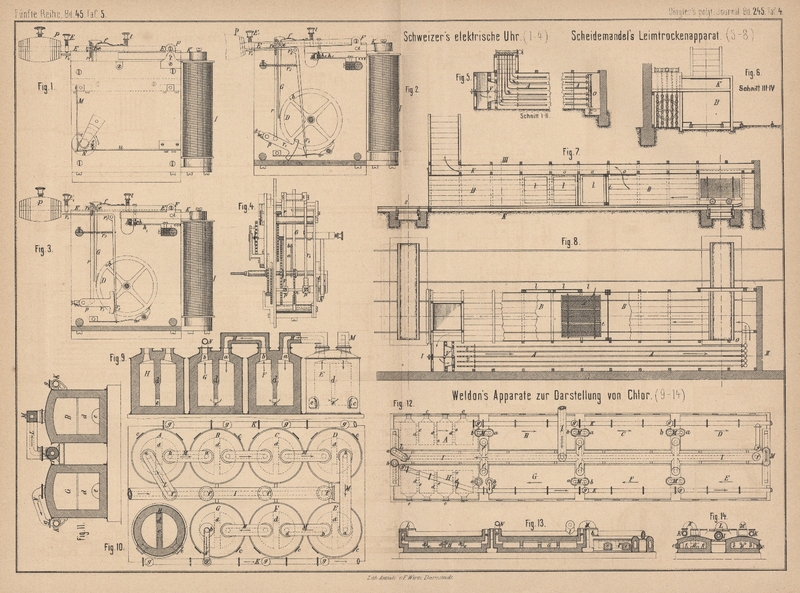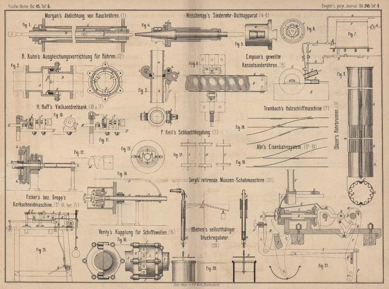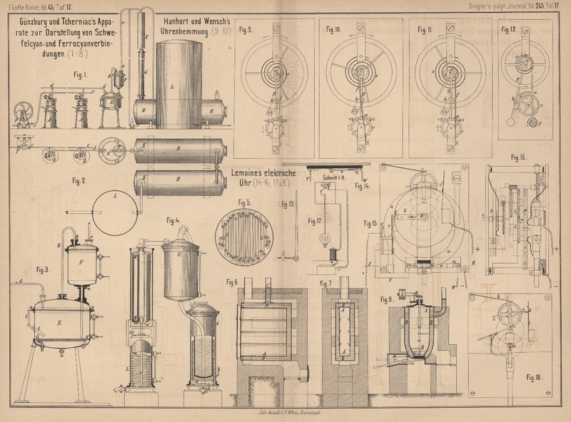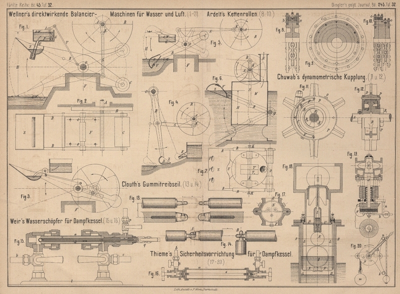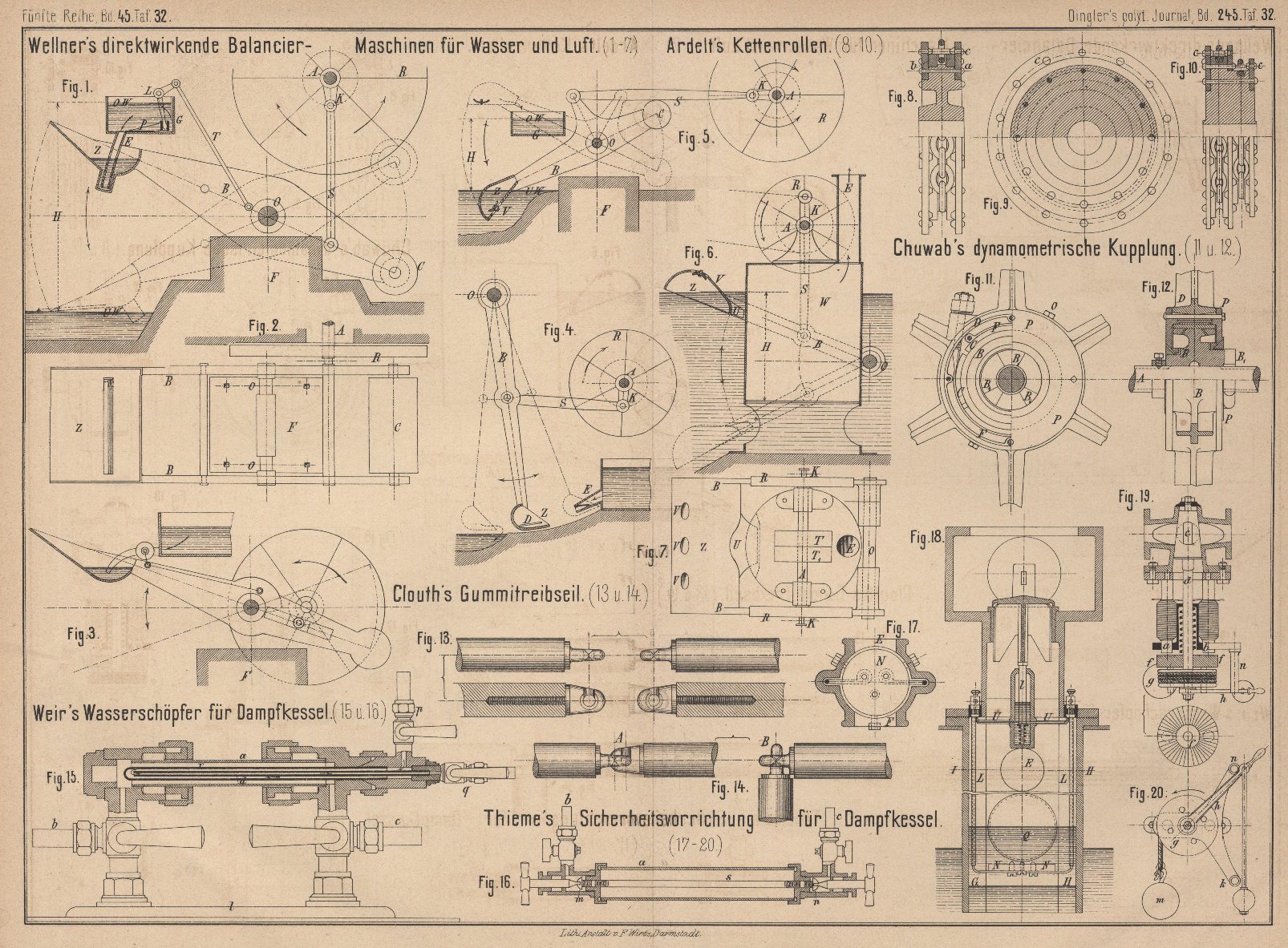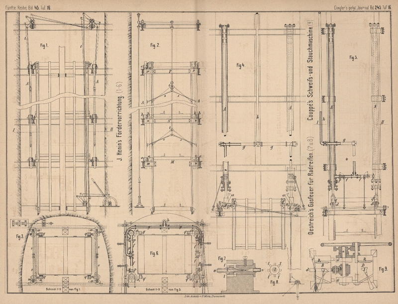 DINGLER'S Polytechnisches Journal. Herausgegeben von Prof. Joh. Zeman und Dr. Ferd. Fischer in Stuttgart in Hannover. 63. Jahrgang: 20. September 1882. Band 245. Heft 12. Mit 1 Tafel Abbildung (Taf. 32) und Holzschnitten. Stuttgart. Verlag der J. G. COTTA'schen Buchhandlung.1882 Textabbildung Bd. 245 Anzeigen der Redactionvon Dingler's polytechnischem Journal. Inhalt von Nr. 12 und 13 Band 245. * bedeutet mit Abbild. G. Wellner's direktwirkende Balanciermaschinen für Wasser und Luft* 477 R. Ardelt's Neuerung an Kettenrollen* 484 Chuwab's dynamometrische Kuppelung* 484 Clouth's Doppelösenschrauben für Gummitreibseile* 485 G. und J. Weir's Vorrichtung zur Untersuchung von Kesselspeisewasser* 486 L. Thieme's Sicherheitsvorrichtung für Dampfkessel* 487 Dinnendahl's Neuerung an Luftcompressoren* 488 Taylor's Reibungskupplung für Schiffswinden* 489 Heydrich's Sicherheitsbuffer für Eisenbahnfahrzeuge* 489 Lenz's Herstellung von Spiralbohrern* 490 Schutzvorrichtungen für Holzhobelmaschinen; von A. Groſs und J. Frank* 491 Bartosch's Stellvorrichtung für Gewindeschneidkluppen* 492 Neuerungen an Feder- und Fallhämmern: C. A. Angström's Federhammer*. B. und S. Massey's Frictionsfallhammer*. J. Cuthbert's Fallhammer 492 Ueber die Festigkeitseigenschaften von Tauwerk; von E. Hartig 494 Ueber Cement und dessen Verwendung (Schluſs): Ueber das Brennen von Cement; von Tomei. Vortheilhafte Verwendung und Verarbeitung des Portlandcementes zu Mörtel und Beton; von R. Dyckerhoff. Beobachtung über Witterungseinflüsse auf die Mörtel; von Dyckerhoff und Hauenschild 499 Die Verarbeitung von Melasse mittels Strontian (Nachtrag); von C. Scheibler 506 Neuerungen in der Herstellung von Alkalien: J. Hargreaves und Th. Robinson's Herstellung von schwefelsaurem Natrium und Kalium.Die Fortsetzung dieses Berichtes und die übrigen Titel erscheinen nebst Taf. 33 und 34 im nächsten Heft Nr. 13.Die Red. L. Wollheim's Gewinnung von reinen Aetzalkalien mittels Elektrolyse *. Herstellung von Soda mittels Ammoniak; von der Société anonyme de Sud-ouest in Paris *. Verwerthung des Ammoniakwassers und Nachtrag zu den Untersuchungsmethoden für Sodafabriken (Bestimmung des Wasserstoffes in Generatorgasen); von G. Lunge* 508 Verwendung der beim basischen Entphosphorungsverfahren fallenden Schlacke in der Landwirthschaft 513 Keith's Verfahren zum elektrolytischen Entsilbern des Werkbleies; von Hampe 515 Schädliche Wirkung eines Kupfer haltigen Oeles in der Türkischrothfärberei; von E. Schaal 516 G. Wachtel's Verwerthung der Stickstoffverbindungen aus Schwefelsäurefabriken 517 Ueber Dampfkesselexplosionen; von Obé, V. Pierre u.a. 517 R. Schöttler's Bremsversuche mit einer Erdölkraftmaschine 518 Scriven's Kesselblech-Biegemaschine 519 H. Reisert's Lagerschmiervorrichtung für dickflüssige Schmiere * 520 E. Rasch und E. Kirchner's Herstellung von braunem und weiſsem Holzstoff 520 Herstellung der Eisenbahnwagenräder aus Papier in Nordamerika 520 K. Burnett's Eisenfänger für Papierstoff-Leitungen 521 Zur Frage der allgemeinen Anwendung der elektrischen Glühlichtbeleuchtung; von Edison, C. W. Siemens, J. Hopkinson, R. Crompton und E. Johnson 521 E. Campe's Kleister zum Aufkleben von Etiquetten auf Flaschen 523 Zusammensetzung vulkanischer Aschen vom Aetna und vom Vesuv; von L. Ricciardi 523 M. Traub's Untersuchung des englischen Methylenchlorides von Robbinson 523 Zur Prüfung des Wismuthnitrates; von W. Lenz 523 Semper und Fahlberg's Abscheidung von Eisen aus Salzlösungen 524 J. Webster's Verfahren zur Gewinnung von Thonerde zur Herstellung von Aluminiumchlorid und Aluminiummetall 524 A. Huët's Gewinnung von Speisefett und Leim aus Schlachthausabfällen 524 Dunaj's Schwellenbohrer* 524 Namen- und Sachregister des 245. Bd. von Dingler's polytechn. Journal 525 –––––––––– Es wird höflichst ersucht, alle die Redaction betreffenden Mittheilungen, Sendungen u. dgl. gefälligst zu adressiren: An die Redaction von Dingler's polytechn. Journal Hrn. Prof. Joh. Zeman in Stuttgart, bezieh. Hrn. Dr. Ferd. Fischer in Hannover, Gustav Adolf-Straſse 23; alle die Expedition und Anzeigen betreffenden Schreiben an die J. G. Cotta'sche Buchhandlung in Stuttgart. ☞ Prof. Zeman in Stuttgart wohnt Hoppenlaustraſse 2 ☜ (Ecke der Schloſsstraſse). –––––––––– Internationale Elektrizitäts-Ausstellung, verbunden mit elektrotechnischen Versuchen im königl. Glaspalaste zu München, vom 16. September bis 15. Oktober 1882. Geöffnet von 9 Uhr Morgens bis 5 Uhr Abends und von ½ 7 Uhr Abends bis 11 Uhr Nachts. Die Ausstellung umfaſst: Die verschiedenen Arten der elektrischen Beleuchtung für Kirchen, Gemäldegalerien, Zeichnungssäle, Theater, Wohnräume, Garten und Straſsen, Torgeführt im Freien, wie in eigens hierzu erbauten, künstlerisch ausgestatteten Räumlichkeiten. Telephonische Uebertragungen von Opern aus dem kgl. Hof- und Nationaltheater, von Operetten aus dem kgl. Theater am Gärtnerplatz, von Konzerten und Gesangsaufführungen aus Kils Kolosseum, ferner mittels lautsprechender Riesentelephons von Konzertstücken aus dem englischen Cafe; eine telephonische Verbindung zwischen Oberammergau und München; telephonische Zentralstationen für Städteverkehr mit Einzelstationen zur beliebigen Benutzung des Publikums; elektrische Kraftübertragungen auf weite Entfernungen zum Betriebe von Maschinen für Landwirthschaft und Kleingewerbe. Die Verwerthung der Elektrizität in der Telegraphie, im Eisenbahn- und Signalwesen, sowie zu militärischen Zwecken; für Medizin und zu häuslichem Gebrauche; historische Apparate; wissenschaftliche Instrumente und Lehrmittel; Bibliothek und Lesezimmer mit elektrotechnischen Zeitschriften und Werken zur freien Benutzung der Besucher; elektrisch beleuchtete Restaurationsräumlichkeiten; photographische Ateliers; Galvanoplastik u.s.w. Zur Belehrung des Publikums dienen: Oeffentliche Vorträge im Liebig'schen Hörsaale während der Dauer der Ausstell