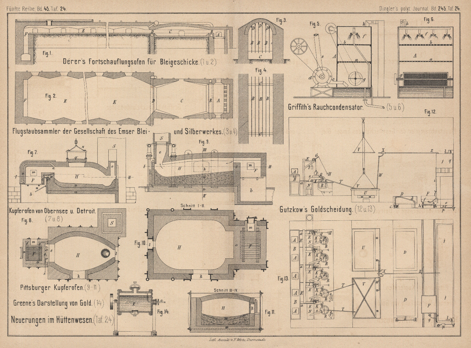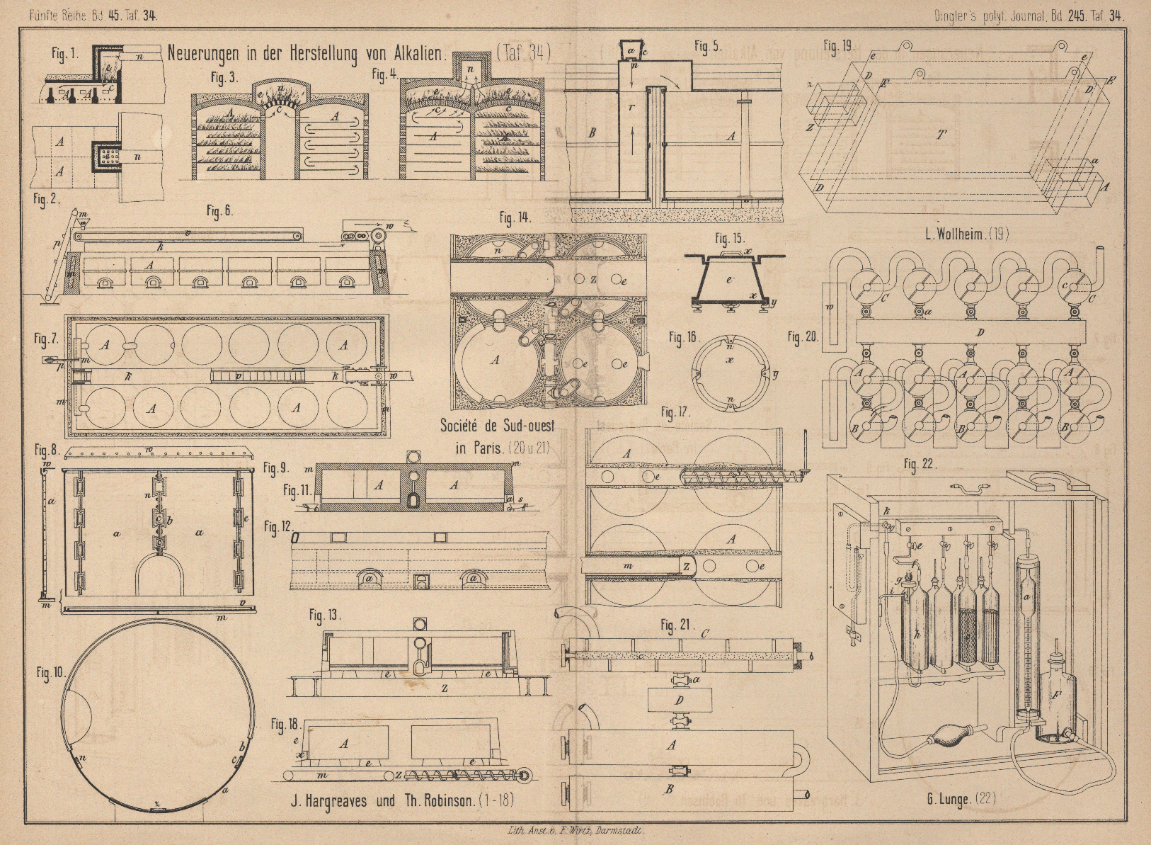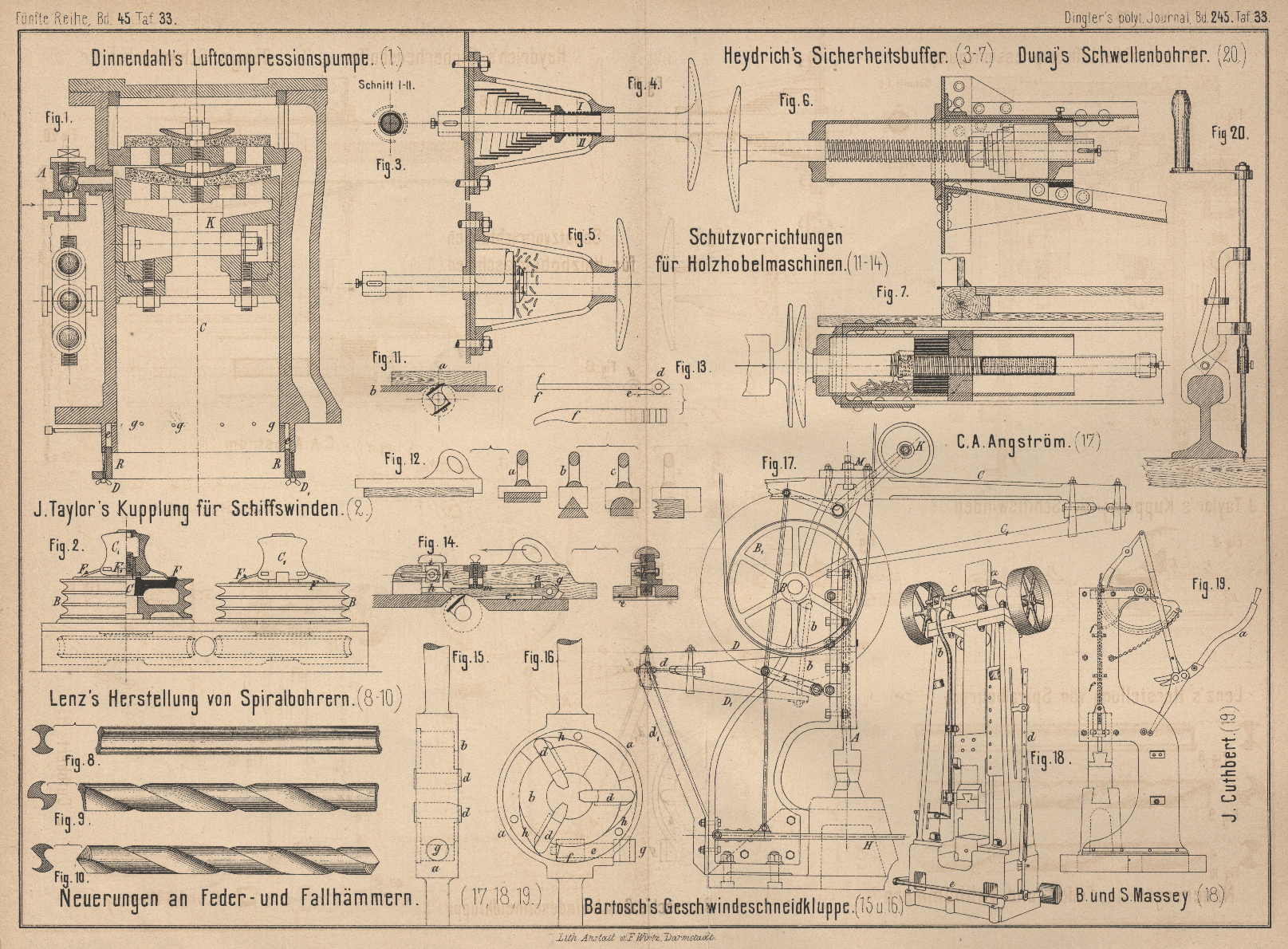 DINGLER'S Polytechnisches Journal. Herausgegeben von Prof. Joh. Zeman und Dr. Ferd. Fischer in Stuttgart in Hannover. 63. Jahrgang: 20. September 1882. Band 245. Heft 12. Mit 1 Tafel Abbildung (Taf. 32) und Holzschnitten. Stuttgart. Verlag der J. G. COTTA'schen Buchhandlung.1882 Textabbildung Bd. 245 Anzeigen der Redactionvon Dingler's polytechnischem Journal. Inhalt von Nr. 12 und 13 Band 245. * bedeutet mit Abbild. G. Wellner's direktwirkende Balanciermaschinen für Wasser und Luft* 477 R. Ardelt's Neuerung an Kettenrollen* 484 Chuwab's dynamometrische Kuppelung* 484 Clouth's Doppelösenschrauben für Gummitreibseile* 485 G. und J. Weir's Vorrichtung zur Untersuchung von Kesselspeisewasser* 486 L. Thieme's Sicherheitsvorrichtung für Dampfkessel* 487 Dinnendahl's Neuerung an Luftcompressoren* 488 Taylor's Reibungskupplung für Schiffswinden* 489 Heydrich's Sicherheitsbuffer für Eisenbahnfahrzeuge* 489 Lenz's Herstellung von Spiralbohrern* 490 Schutzvorrichtungen für Holzhobelmaschinen; von A. Groſs und J. Frank* 491 Bartosch's Stellvorrichtung für Gewindeschneidkluppen* 492 Neuerungen an Feder- und Fallhämmern: C. A. Angström's Federhammer*. B. und S. Massey's Frictionsfallhammer*. J. Cuthbert's Fallhammer 492 Ueber die Festigkeitseigenschaften von Tauwerk; von E. Hartig 494 Ueber Cement und dessen Verwendung (Schluſs): Ueber das Brennen von Cement; von Tomei. Vortheilhafte Verwendung und Verarbeitung des Portlandcementes zu Mörtel und Beton; von R. Dyckerhoff. Beobachtung über Witterungseinflüsse auf die Mörtel; von Dyckerhoff und Hauenschild 499 Die Verarbeitung von Melasse mittels Strontian (Nachtrag); von C. Scheibler 506 Neuerungen in der Herstellung von Alkalien: J. Hargreaves und Th. Robinson's Herstellung von schwefelsaurem Natrium und Kalium.Die Fortsetzung dieses Berichtes und die übrigen Titel erscheinen nebst Taf. 33 und 34 im nächsten Heft Nr. 13.Die Red. L. Wollheim's Gewinnung von reinen Aetzalkalien mittels Elektrolyse *. Herstellung von Soda mittels Ammoniak; von der Société anonyme de Sud-ouest in Paris *. Verwerthung des Ammoniakwassers und Nachtrag zu den Untersuchungsmethoden für Sodafabriken (Bestimmung des Wasserstoffes in Generatorgasen); von G. Lunge* 508 Verwendung der beim basischen Entphosphorungsverfahren fallenden Schlacke in der Landwirthschaft 513 Keith's Verfahren zum elektrolytischen Entsilbern des Werkbleies; von Hampe 515 Schädliche Wirkung eines Kupfer haltigen Oeles in der Türkischrothfärberei; von E. Schaal 516 G. Wachtel's Verwerthung der Stickstoffverbindungen aus Schwefelsäurefabriken 517 Ueber Dampfkesselexplosionen; von Obé, V. Pierre u.a. 517 R. Schöttler's Bremsversuche mit einer Erdölkraftmaschine 518 Scriven's Kesselblech-Biegemaschine 519 H. Reisert's Lagerschmiervorrichtung für dickflüssige Schmiere * 520 E. Rasch und E. Kirchner's Herstellung von braunem und weiſsem Holzstoff 520 Herstellung der Eisenbahnwagenräder aus Papier in Nordamerika 520 K. Burnett's Eisenfänger für Papierstoff-Leitungen 521 Zur Frage der allgemeinen Anwendung der elektrischen Glühlichtbeleuchtung; von Edison, C. W. Siemens, J. Hopkinson, R. Crompton und E. Johnson 521 E. Campe's Kleister zum Aufkleben von Etiquetten auf Flaschen 523 Zusammensetzung vulkanischer Aschen vom Aetna und vom Vesuv; von L. Ricciardi 523 M. Traub's Untersuchung des englischen Methylenchlorides von Robbinson 523 Zur Prüfung des Wismuthnitrates; von W. Lenz 523 Semper und Fahlberg's Abscheidung von Eisen aus Salzlösungen 524 J. Webster's Verfahren zur Gewinnung von Thonerde zur Herstellung von Aluminiumchlorid und Aluminiummetall 524 A. Huët's Gewinnung von Speisefett und Leim aus Schlachthausabfällen 524 Dunaj's Schwellenbohrer* 524 Namen- und Sachregister des 245. Bd. von Dingler's polytechn. Journal 525 –––––––––– Es wird höflichst ersucht, alle die Redaction betreffenden Mittheilungen, Sendungen u. dgl. gefälligst zu adressiren: An die Redaction von Dingler's polytechn. Journal Hrn. Prof. Joh. Zeman in Stuttgart, bezieh. Hrn. Dr. Ferd. Fischer in Hannover, Gustav Adolf-Straſse 23; alle die Expedition und Anzeigen betreffenden Schreiben an die J. G. Cotta'sche Buchhandlung in Stuttgart. ☞ Prof. Zeman in Stuttgart wohnt Hoppenlaustraſse 2 ☜ (Ecke der Schloſsstraſse). –––––––––– Internationale Elektrizitäts-Ausstellung, verbunden mit elektrotechnischen Versuchen im königl. Glaspalaste zu München, vom 16. September bis 15. Oktober 1882. Geöffnet von 9 Uhr Morgens bis 5 Uhr Abends und von ½ 7 Uhr Abends bis 11 Uhr Nachts. Die Ausstellung umfaſst: Die verschiedenen Arten der elektrischen Beleuchtung für Kirchen, Gemäldegalerien, Zeichnungssäle, Theater, Wohnräume, Garten und Straſsen, Torgeführt im Freien, wie in eigens hierzu erbauten, künstlerisch ausgestatteten Räumlichkeiten. Telephonische Uebertragungen von Opern aus dem kgl. Hof- und Nationaltheater, von Operetten aus dem kgl. Theater am Gärtnerplatz, von Konzerten und Gesangsaufführungen aus Kils Kolosseum, ferner mittels lautsprechender Riesentelephons von Konzertstücken aus dem englischen Cafe; eine telephonische Verbindung zwischen Oberammergau und München; telephonische Zentralstationen für Städteverkehr mit Einzelstationen zur beliebigen Benutzung des Publikums; elektrische Kraftübertragungen auf weite Entfernungen zum Betriebe von Maschinen für Landwirthschaft und Kleingewerbe. Die Verwerthung der Elektrizität in der Telegraphie, im Eisenbahn- und Signalwesen, sowie zu militärischen Zwecken; für Medizin und zu häuslichem Gebrauche; historische Apparate; wissenschaftliche Instrumente und Lehrmittel; Bibliothek und Lesezimmer mit elektrotechnischen Zeitschriften und Werken zur freien Benutzung der Besucher; elektrisch beleuchtete Restaurationsräumlichkeiten; photographische Ateliers; Galvanoplastik u.s.w. Zur Belehrung des Publikums dienen: Oeffentliche Vorträge im Liebig'schen Hörsaale während der Dauer der Ausstell
