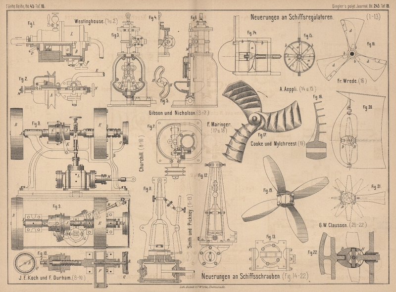 DINGLER'S Polytechnisches Journal. Herausgegeben von Prof. Joh. Zeman und Dr. Ferd. Fischer in Stuttgart in Hannover. 63. Jahrgang: 9. August 1882. Band 245. Heft 6. Mit 2 Tafeln Abbildungen (Taf. 18 und 19) und Holzschnitten. Stuttgart. Verlag der J. G. COTTA'schen Buchhandlung.1882 Anzeigen der Redactionvon Dingler's polytechnischem Journal. Inhalt von Nr. 6 Band 245. * bedeutet mit Abbild. Ueber Arbeitsübertragung durch Elektricität; von Marcel Deprez in Paris (Schluſs) 233 Neuerungen an Regulatoren für Schiffsmaschinen; von J. und E. Hall in Dartford ( Westinghouse's Construction)*, Gibson und Nicholson*, J. E. Koch in London und F. W. Durham in New-Barnet, England*, Smith und Pickney in Sunderland* 237 Ueber Neuerungen an Schiffsschrauben; von R. Mittag: 1) Construction der Schraubenpropeller von W. Ch. Hallett in London, H. J. Jackson in Deptford, G. J. Stevens und J. S. Smith in London, L. Gravier in Havre, H. Hirsch in Paris, Cuizinier, De Bay, A. Aeppli in Riesbach bei Zürich * F. Motte in Dampremy, Fr. Wrede in Duisburg *, F. Maringer in Düsseldorf*, J. B. Ward in San Francisco, W. Cooke und D. Mylchreest in Liverpool*, J. A. Andrée in Esens, Ostfriesland, H Grauel in Magdeburg. 2) Lagerung der Schraube im Schiff: P. Jacquel in Natzweiler, Elsaſs, A. H Reichelt in Hamburg, Z. Oram und P. B. Grove in Philadelphia. 3) Steuerschrauben: H. Dietrich in Potsdam, L. Somzée in Brüssel, E. W. Mayer in Posen, G. W. Claussen in Bremerhaven* 240 Druckregulirungs- und Entlüftungsapparat für Hochdruckwasserleitungen; von A. Eichenauer in Neunkirchen a. d. Blies * 246 Mundstücke für Springbrunnen; von W. Böckmann in Berlin* 247 Nabenbohrapparat für Handbetrieb; von Jakob Baeuerle in Oberkochen* 248 Neuerungen in der Drahterzeugung: Drahtwalzwerk von Gust. Erkenzweig in Hagen i. W. * Konische Drahtwalzen von G. Adolf Hardt in Köln*. Erdölgasheizung zum Glühen, Härten und Anlassen von dünnem Draht, z.B. Kratzendraht; von J. Sykes in Huddersfield. Abdichtung, um Draht ohne Flüssigkeitsverluste durch die Beiz-, Schmier- oder Kühlbäder zu führen; von Gust. Voigt in Ferlach 249 Nagelkopf-Presse von A. D. Cremidi in London* 251 Maschine zum Abschlichten gepreſster Schraubenmuttern; von L. Frobeen in Berlin* 251 Lochvorrichtung für Centrifugenbleche; von M. G. Fontaine in Achen * 252 Ellipsograph von L. Bigge in Köln* 253 Neuerung an Witzleben's Kippwagen; von R. Leonhardt und C. Engemann in Chemnitz* 254 Englische Regeln zur Verhütung von Feuersgefahr bei elektrischer Beleuchtung 255 Ueber Patinabildung; von Prof. Dr. Rud. Weber in Berlin (Schluſs) 256 Zur Reinigung der Rübensäfte mittels Schwefligsäure und Kiesfiltration; von R. Reinicke, R. Stutzer, Drenckmann und Crahe 264 Beiträge zur Indigofärberei: Beschreibung des Verfahrens in Pondichery von Victor Lehr. Verfahren zum Drucken mit natürlichem Indigo von Jul. Ribbert in Hohenlimburg 266 Ueber einen Unfall beim Bleichen: Kalkflecken in einer mit Dampffarben bedruckten Waare; von Dr. E. Lauber und B. Maslowsky in Zawiercie 267 Künstlicher Luftwechsel bei Condensationsmaschinen; von Prof. G. Wellner in Brünn 268 Sackreinigungsmaschine von K. Vogelgesang in Tangermünde und F. Schmersow in Berlin* 269 Stand der städtischen Fernsprecheinrichtungen im Deutschen Reichs-Telegraphengebiete 269 Verwendung des Aethylens zur Erzeugung sehr niedriger Temperaturen; von L. Cailletet 270 Zusammensetzung der Potasche aus Bambusrohr; von R. Romanis 270 J. David's Bestimmung des Glycerins; in Fetten 270 F. Beilstein's Herstellung von Propylen 270 Zur Kenntniſs der Alkaloide: E. A. Maumené's synthetische Darstellung des Chinins, O. Hesse's Verarbeitung der weiſsen Quebrachorinde und L. Rügheimer's Darstellung von künstlichem Piperin 270 Ueber die Trennung des Bariums; von Strontium und Calcium; von J. Meschtschersky 271 Zur Bestimmung des Stickstoffes: A. Guyard's Bestimmung der Salpetersäure und Salpetrigsäure als Ammoniak und A. Bernthsen's Herstellung von Kohlensäure für volumetrische Stickstoffbestimmung 271 Albuminersatz in der Färberei; von J. Hofmeier in Prag 271 Herstellung von Farbholzextracten; von Röſsler. und Sohn in Dornach 272 Berichtigung (Pechan, über Dimensionirung S. 102) 272 –––––––––– ☞ Diesem Hefte liegen bei Prospekte: von C. W. Blanke & Co. in Merseburg, der Rhein. Versandtanstalt in Moers, von G. D. Baedeker in Essen, von J. Springer in Berlin. Es wird höflichst ersucht, alle die Redaction betreffenden Mittheilungen, Sendungen u. dgl. gefälligst zu adressiren: An die Redaction von Dingler's polytechn. Journal Hrn. Prof. Joh. Zeman in Stuttgart, bezieh. Hrn. Dr. Ferd. Fischer in Hannover, Gustav Adolf-Straſse 23; alle die Expedition und Anzeigen betreffenden Schreiben an die J. G. Cotta'sche Buchhandlung in Stuttgart. Ueber Arbeitsübertragung durch Elektricität. (Schluſs des Berichtes S. 193 d. Bd.) Deprez, über Arbeitsübertragung durch Elektricität. Neuerungen an Regulatoren für Schiffsmaschinen. Mit Abbildungen auf Tafel 18. Neuerungen an Regulatoren für Schiffsmaschinen. Ueber Neuerungen an Schiffsschrauben. Patentklasse 65. Mit Abbildungen auf Tafel 18. Ueber Neuerungen an Schiffsschrauben. Druckregulirungs- und Entlüftungsapparat für Hochdruckwasserleitungen. Mit Abbildungen auf Tafel 19. Eichenauer's Druckregulir- und Entlüftungsapparat. W. Böckmann's Springbrunnen. Mit Abbildungen. Böckmann's Springbrunnen. J. Baeuerle's Nabenbohrapparat für Handbetrieb. Mit Abbildung auf Tafel 19. Baeuerle's Nabenbohrapparat für Handbetrieb. Neuerungen in der Drahterzeugung. Patentklasse 7. Mit Abbildungen auf Tafel 19. Neuerungen in der Drahterzeugung. A. D. Cremidi's Nagelkopf-Presse. Mit Abbildung auf Tafel 19. [Cremidi's Nagelkopf-Presse.] L. Frobeen's Maschine zum Abschlichten gepreſster Schraubenmuttern. Mit Abbildungen auf Tafel 19. Frobeen's Abschlichtmaschine für gepreſste Schraubenmuttern. M. G. Fontaine's Lochvorrichtung für Centrifugenbleche. 
