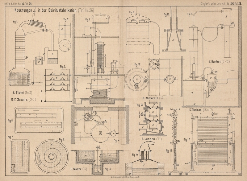 DINGLER'S Polytechnisches Journal. Herausgegeben von Prof. Joh. Zeman und Dr. Ferd. Fischer in Stuttgart in Hannover. 63. Jahrgang: 30. August 1882. Band 245. Heft 9. Mit 2 Tafeln Abbildungen (Taf. 25 und 26) und Holzschnitten. Stuttgart. Verlag der J. G. COTTA'schen Buchhandlung.1882 Textabbildung Bd. 245 Anzeigen der Redactionvon Dingler's polytechnischem Journal. Inhalt von Nr. 9 Band 245. * bedeutet mit Abbild. Ueber die Beurtheilung von Dampfkesselfeuerungen; von Ferd. Fischer 357 Neuerungen an zwangläufigen Ventilsteuerungen; von Richard Lüders Görlitz * und A. Collmann in Wien * 362 Ellis' Wasserstandszeiger für Dampfkessel von Bellamy in Millwall, England* 368 Ueber die Elasticität des Papieres; von Prof. Dr. Hartig in Dresden* 368 Mikroskopstativ mit Kugelgelenken; von A. Martens, Ingenieur in Berlin* 372 Sicherheitspfropfen für Glühlichtbeleuchtung; von Edmunds und Comp. in Halifax* 375 Ueber die Herstellung von Spiritus (Fortsetzung): Apparat zur Rectification des Alkohols unter vermindertem Druck; von R. Pictet in Paris*. Apparat zur Rectification des Alkohols von D. F. Savalle in Paris *. Verfahren zum Reinigen vin Alkohol von E. Barbet in La Madeleine-les-Lille *. Condensator für Alkoholdampfe von H. Niewerth in Wernigerode *. Apparat zum Trocknen von Dämpfen aus Destillirapparaten u. dgl. von E. Langen in Köln*. Kühlapparat zur Verdichtung von Spiritusdämpfen von E. Theisen in Leipzig*. Apparat zum Conserviren der Schlempe von G. Walter in Plauen* 376 Ueber Cement und dessen Verwendung. Verhandlungen des Vereins deutscher Cementfabrikanten: Ueber Einführung der Werthziffer bei Submissionen; von H. Delbrück, Lossius, R. Dyckerhoff und A. Bernoully. Die Versendung des Cementes in Säcken und Bezeichnung „Faſs“ statt „Tonne“ Cement; von G. Dyckerhoff. Ueber Zerkleinerung des Cementes mittels Walzen; von R. Dyckerhoff, Heyn, H. Delbrück, Kaemp. Neue Siebeinrichtungen für Cement; von Bernoully, Prüssing und Delbrück 381 Zu Mond's Schwefelregeneration; von H. Schaeppi in Widnes, Lancashire (Schluſs)* 387 Generalversammlung des Vereins deutscher Eisenhüttenleute: Zur Statistik der Roheisen-Erzeugung; von J. Schlink. Zur Lage der deutschen Gieſserei-Roheisen-Erzeugung; von V. Limbor. Analyse von Gichtstaub aus einem Whitwell-Apparat. Analysen von Schlacken bei Gieſserei-Roheisenbetrieb. Roheisenmarken für Herstellung von Puddeleisen; von W. Tiemann* Analysen von Puddel-Roheisensorten 392 Eisenbahnwagen-Bremse ohne Benutzung der Radreifen; von J. J. Heilmann in Mülhausen i. E. 394 Herstellung von Metalllegirungen: Herstellung Phosphor und Eisen enthaltender Legirungen; von G. A. Dick in London. Bronzemischung von H. Vivian in Swansea 395 Herstellung eines widerstandsfähigen Grundes für Glasverzierungen; von G. Rupprecht in Nürnberg 395 Anwendung von Chlorstrontium zur Scheidung und Reinigung der Zuckersäfte; von G. Kottmann in Berlin 395 J. Biel's Verfahren zur Gehaltsbestimmung von Chinarinden 396 Zusammensetzung der Kolanuſs; von F. Schlagdenhauffen 396 –––––––––– Bei der Redaktion sind nachstehende WerkeDie verehrl. Verlagshandlungen werden gebeten, bei Zusendung von Recensionsexemplaren die Ladenpreise derselben beizufügen. eingelaufen: H. Schuberth: Illustrirtes Hand- und Hilfsbuch für den praktischen Metallarbeiter. Ein Vademecum für Metallarbeiter aller Branchen, für Maschinenbauer, Metallgieſser, Dreher, Klempner, Gürtler, Galvanoplastiker, Bronceure u.a. Mit 300 Text-Illustrationen und 15 Tafeln. In 15 Lieferungen zu 60 Pf. (Wien 1882. A. Hartleben.) Ueber die Methode der pneumatischen Fundirungen. Vortrag vom Ing. L. Brennecke (St. Petersburg 1881. Oscar Kranz). –––––––––– Es wird höflichst ersucht, alle die Redaction betreffenden Mittheilungen, Sendungen u. dgl. gefälligst zu adressiren: An die Redaction von Dingler's polytechn. Journal Hrn. Prof. Joh. Zeman in Stuttgart, bezieh. Hrn. Dr. Ferd. Fischer in Hannover, Gustav Adolf-Straſse 23; alle die Expedition und Anzeigen betreffenden Schreiben an die J. G. Cotta'sche Buchhandlung: in Stuttgart. ☞ Prof. Zeman in Stuttgart wohnt Hoppenlaustraſse 2 ☜ (Ecke der Schloſsstraſse). Textabbildung Bd. 245 ☞ Diesem Hefte liegt bei ein Prospekt von Fr. Tovote in Hannover. Ueber die Beurtheilung von Dampfkesselfeuerungen; von Ferd. Fischer. F. Fischer, über die Beurtheilung von Dampfkesselfeuerungen. Neuerungen an zwangläufigen Ventilsteuerungen. Patentklasse 14. Mit Abbildungen auf Tafel 25, 27 und 29. Neuerungen an zwangläufigen Ventilsteuerungen. Ellis' Wasserstandszeiger. Mit Abbildung. [Ellis' Wasserstandszeiger.] Ueber die Elasticität des Papieres; von Prof. Dr. Hartig in Dresden. Mit Abbildungen. Hartig, über die Elasticität des Papieres. Mikroskopstativ mit Kugelgelenken; von A. Martens, Ingenieur in Berlin. Mit Abbildung. Martens' Mikroskopstativ mit Kugelgelenk. Edmunds' Sicherheitspfropfen für Glühlichtbeleuchtung. Mit Abbildung. Edmunds' Sicherheitspfropfen für Glühlichtbeleuchtung. Ueber die Herstellung von Spiritus. (Patentklasse 6. Fortsetzung des Berichtes S. 115 d. Bd.) Mit Abbildungen auf Tafel 26. Ueber die Herstellung von Spiritus. Ueber Cement und dessen Verwendung. Ueber Cement und dessen Verwendung. Zu Mond's Schwefelregeneration; von H. Schaeppi in Widnes, Lancashire. Mit Abbildung. (Schluſs der Abhandlung S. 341 d. Bd.) Schaeppi, zu Mond's Schwefelregeneration. Generalversammlung des Vereins deutscher Eisenhüttenleute. Generalversammlung des Vereins deutscher Eisenhüttenleute. [Kleinere Mittheilungen.] Kleinere Mittheilungen.[zum vollständigen Artikeltext …]