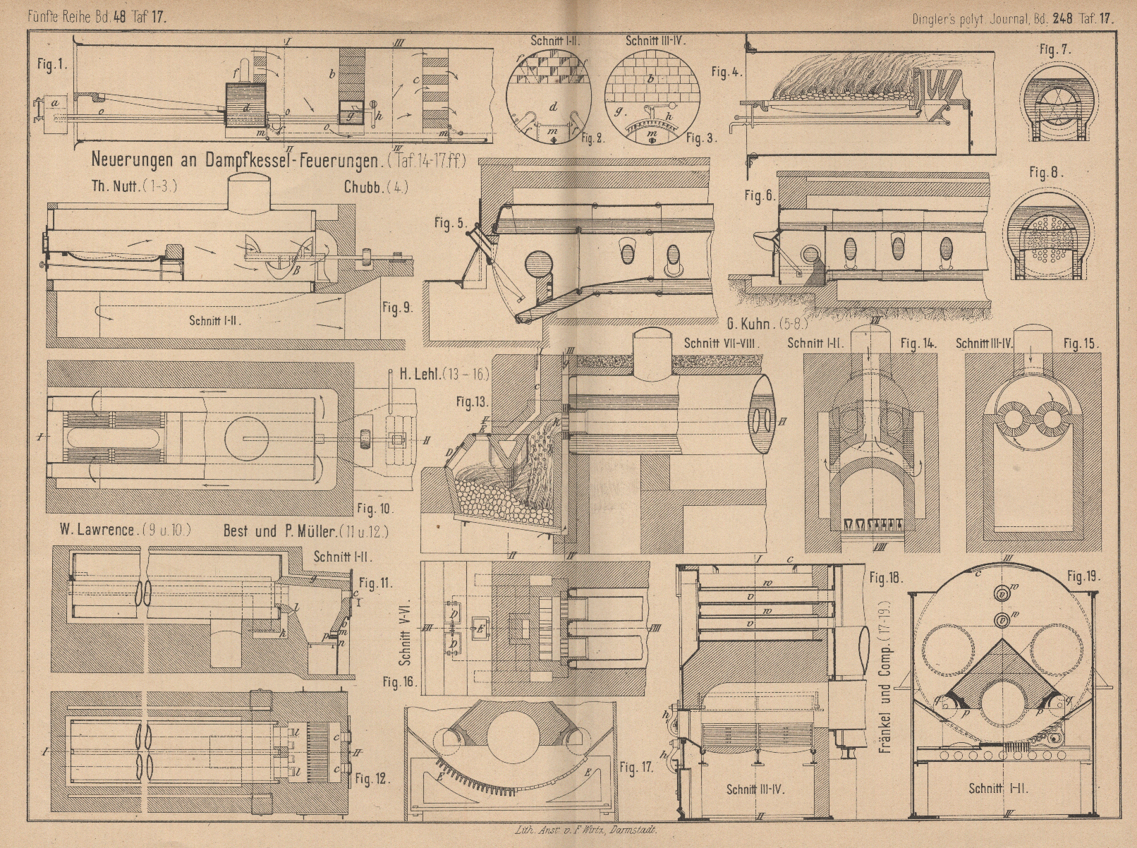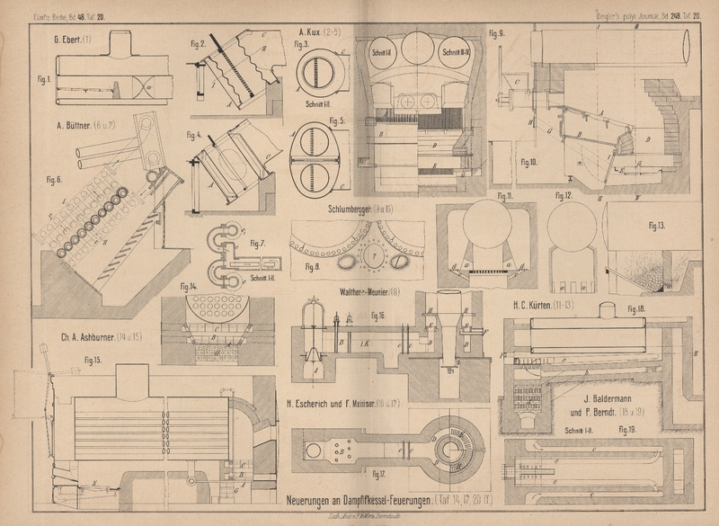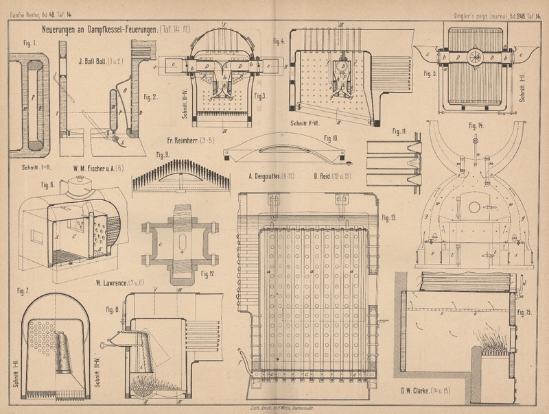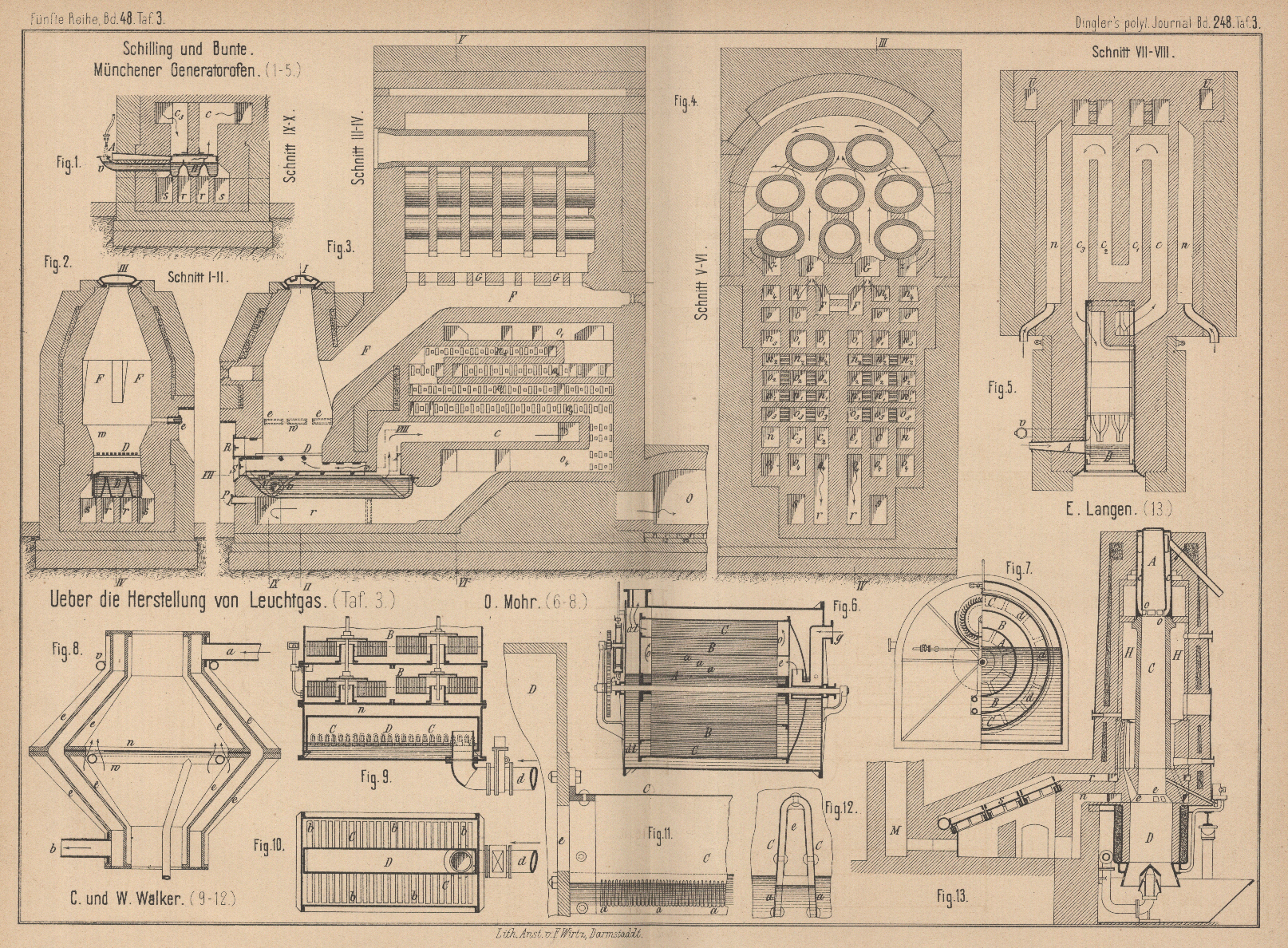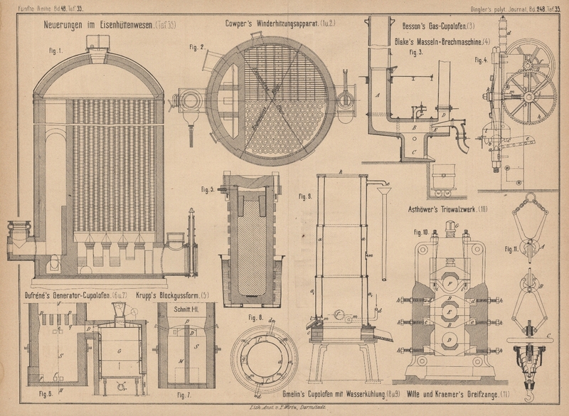 dgl. O. Gmelin's Kupolofen mit Wasserkühlung für den Schacht. H. Dufréné's Generatorfeuerung für