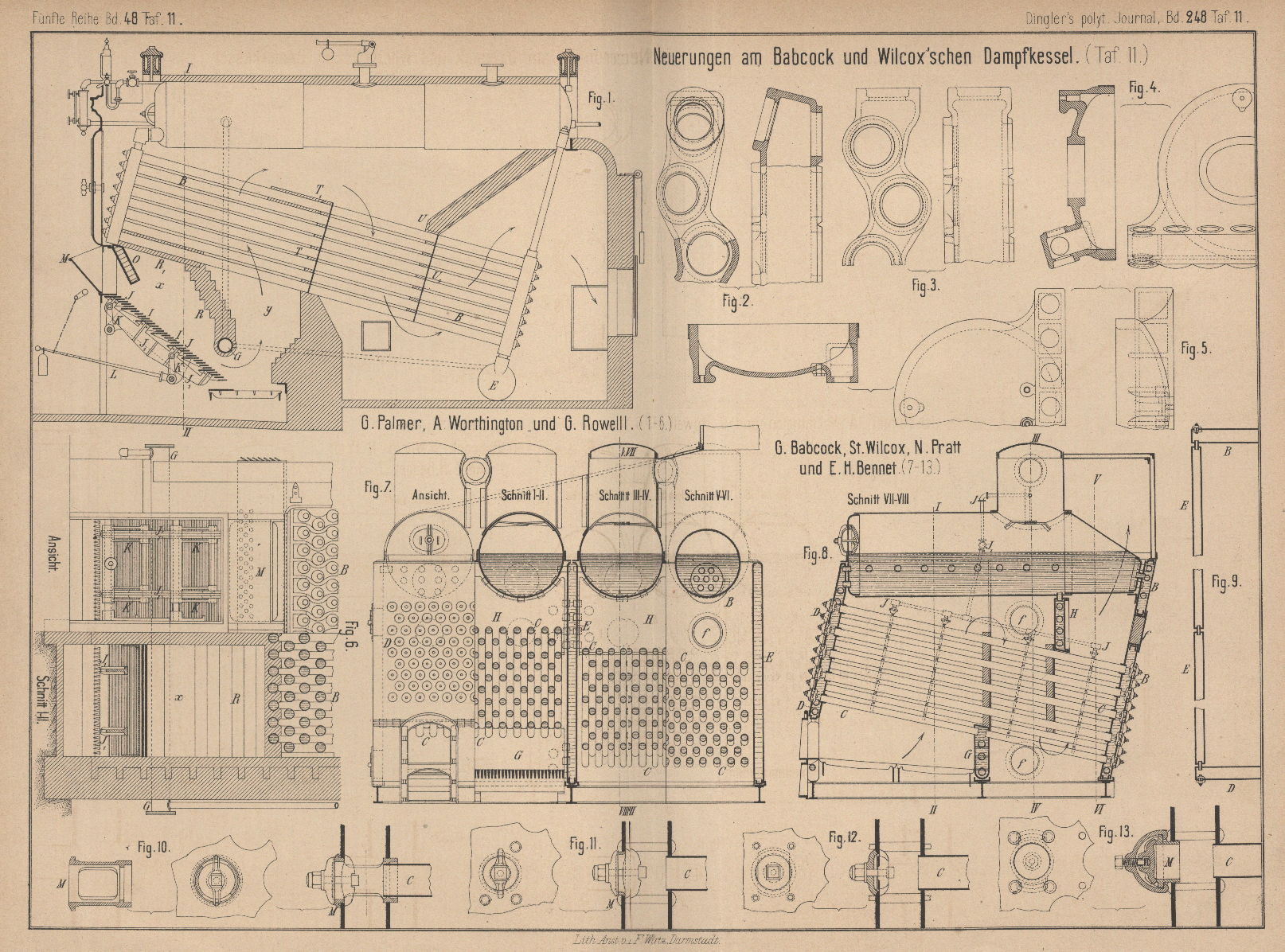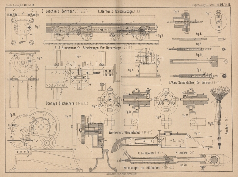 Kleinere Mittheilungen: Zur Statistik der Wasser- und Dampfkraft in Nordamerika 469– Selbstthätige Förderung für Menschen bei Schachttiefen bis 50m; von Haton de la Goupillière 469– H. Chr. Schmidt's Winkelschere * 470– F. Dürholz's Herstellung von Façonhobeleisen 470– Lichtthürme für Bogenlampen 470– M. Deprez's Dynamomaschine mit Bewickelung aus feinem und dickem Drahte 470– Analysen von Manganerzen aus der Bukowina; von M. Lill und L. Schneider 471– Verfahren zum Härten von Gyps und Alabaster; von der Société Anonyme de Certaldo in