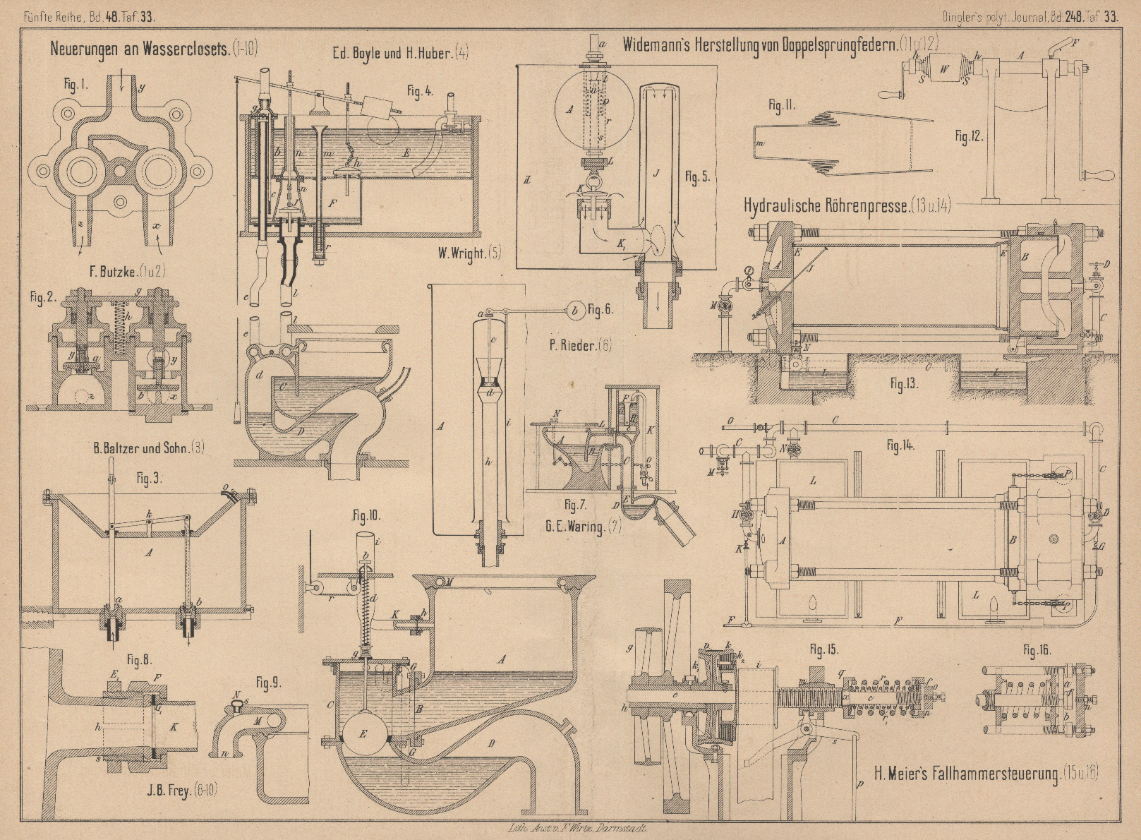 Ueber Neuerungen an Wasser-Closets; von F. Butzke, B. Baltzer und Sohn, J. Boyle und H. Huber,