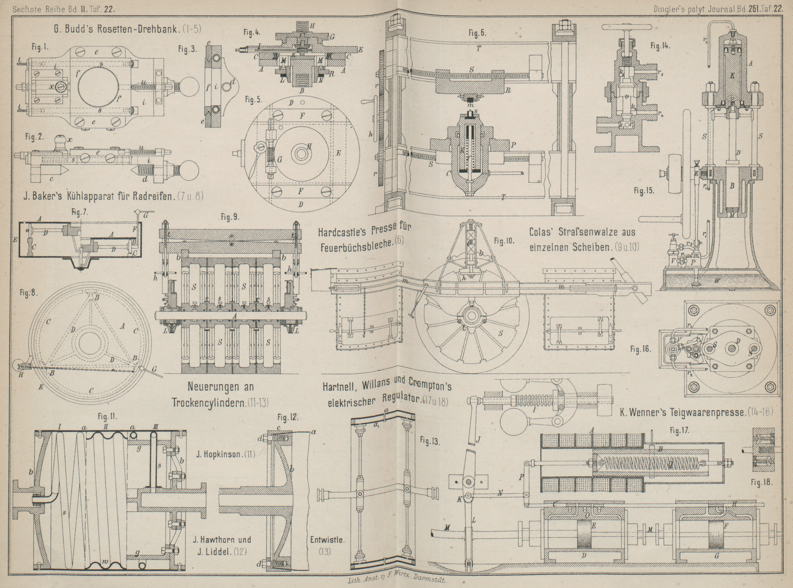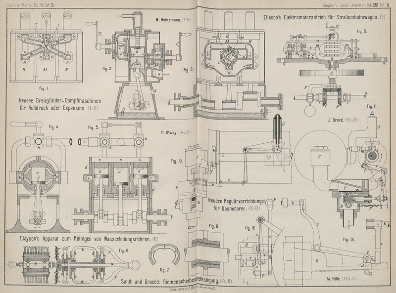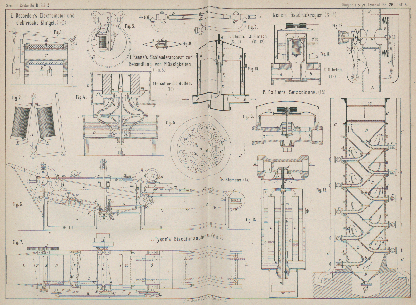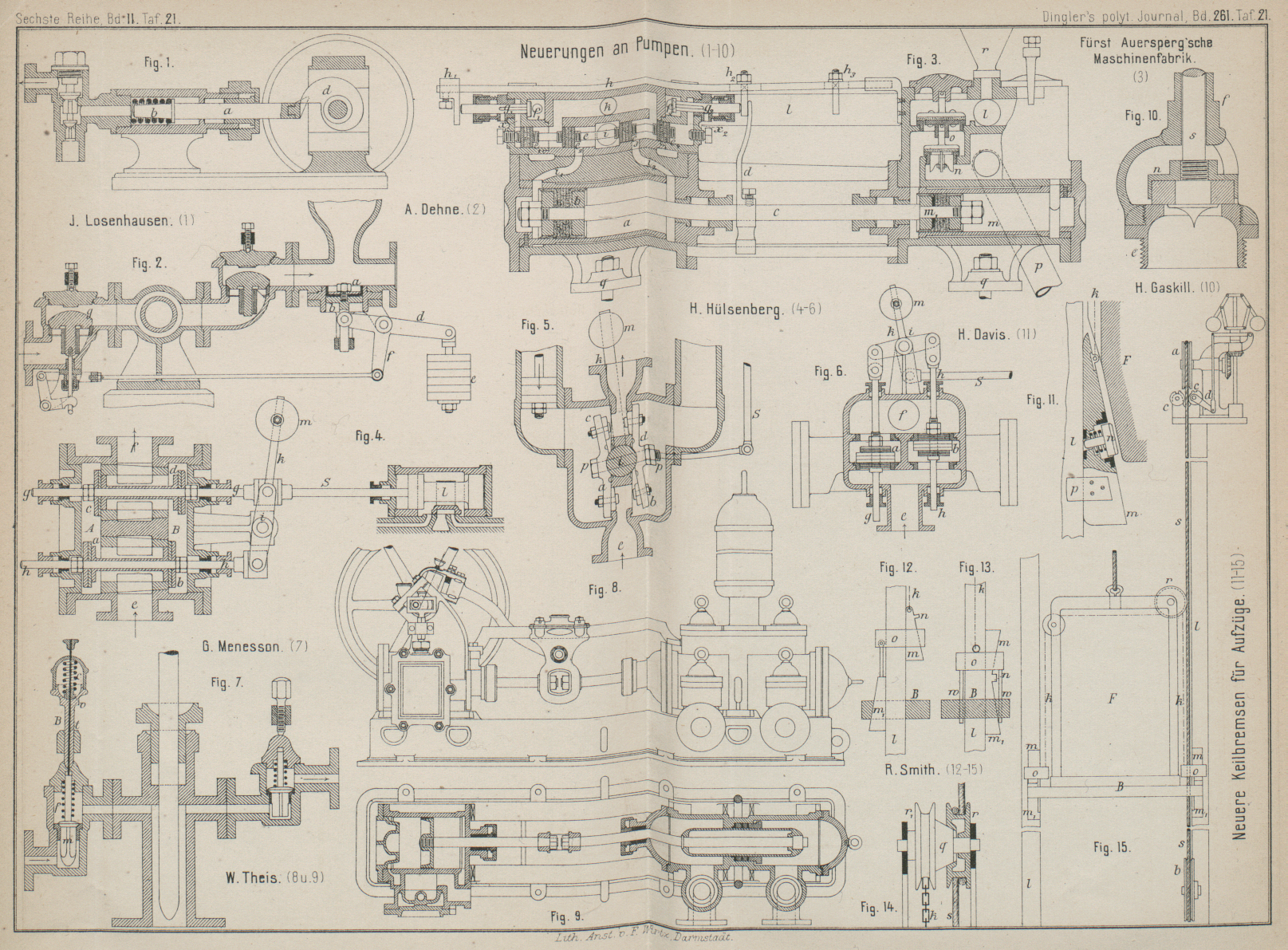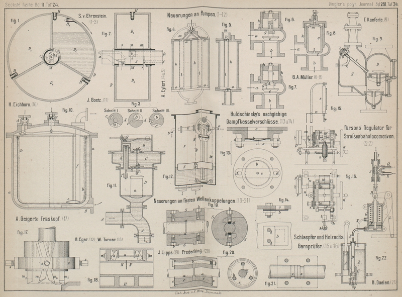 Berichtigungen. In der Beschreibung der Wasserwerke in Buffalo bezieh. Gashill's Zwillings-Compound-Dampfpumpe ist S. 319 Z. 1 v. u. zu lesen: „33mm,4“ und „44mm,4“ statt „350mm“ und „470mm“. – In der Beschreibung des Regulators von Therkelsen und Bruun S. 188 ist die richtige Wirkungsweise angezweifelt, da die Räder a und c gleich groſs angenommen sind. Diese Voraussetzung ist irrig, ebenso die daraus gezogene Folgerung. AtlaszuDingler's polytechnischem Journal. Band 261. (Siebenundsechzigster Jahrgang.) Jahrgang 1886. Enthaltend 33 lithographirte Tafeln. Stuttgart.Verlag der J. G. COTTA'schen Buchhandlung. Tab. I. Tab. II. Tab. III. Tab. IV. Tab. V. Tab. VI. Tab. VII. Tab. VIII. Tab. IX. Tab. X. Tab. XI. Tab. XII. Tab. XIII. Tab. XIV. Tab. XV. Tab. XVI. Tab. XVII. Tab. XVIII. Tab. XIX. Tab. XX. Tab. XXI. Tab. XXII. Tab. XXIII. Tab. XXIV. Tab. XXV. Tab. XXVI. Tab. XXVII. Tab. XXVIII. Tab. XXIX. Tab. XXX. Tab. XXXI. Tab. XXXII. Tab. XXXIII.