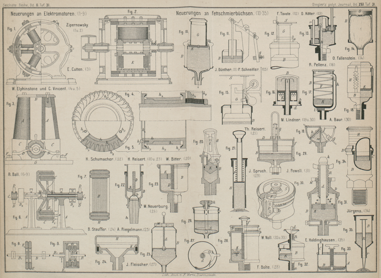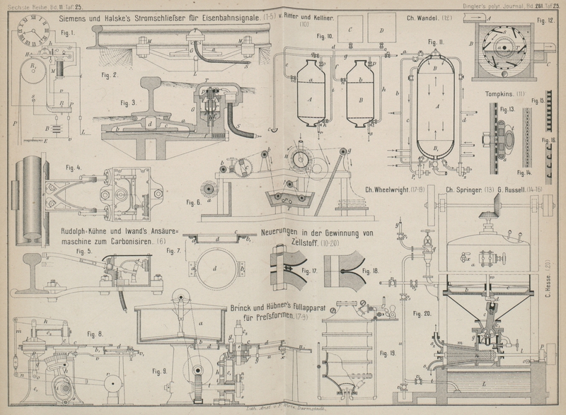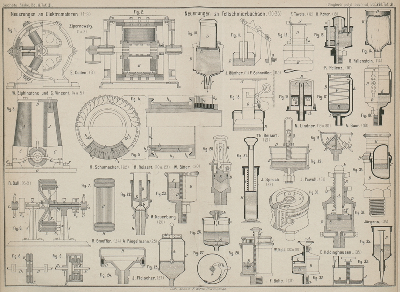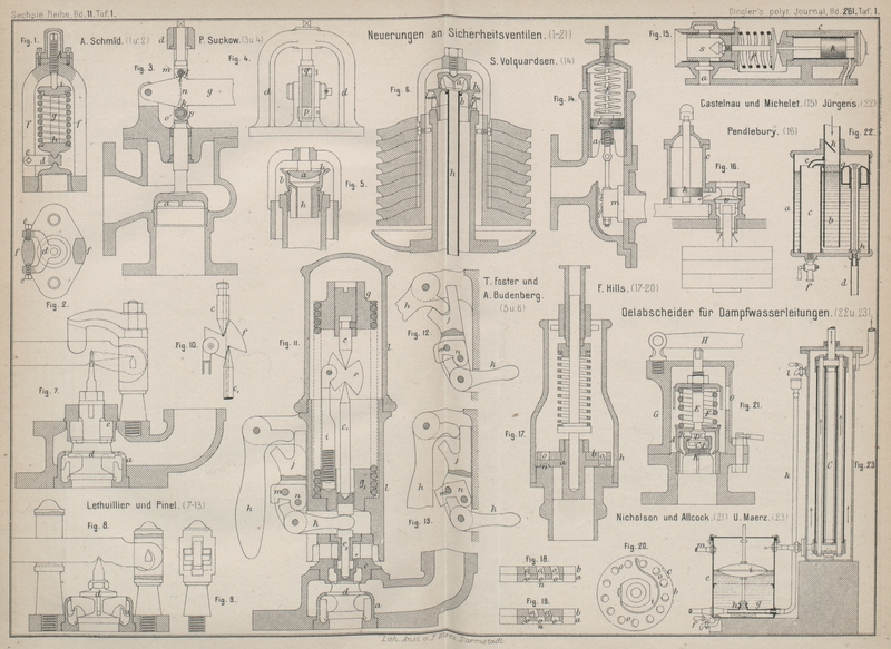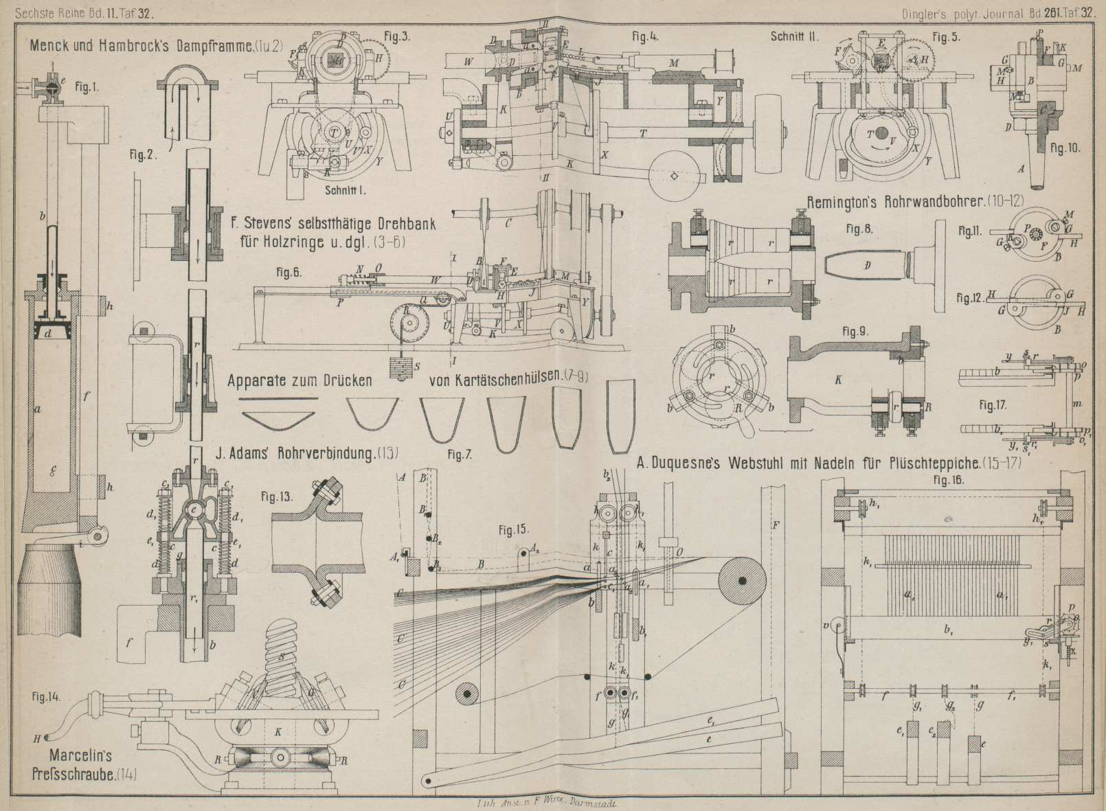 Berichtigungen. In der Beschreibung der Wasserwerke in Buffalo bezieh. Gashill's Zwillings-Compound-Dampfpumpe ist S. 319 Z. 1 v. u. zu lesen: „33mm,4“ und „44mm,4“ statt „350mm“ und „470mm“. – In der Beschreibung des Regulators von Therkelsen und Bruun S. 188 ist die richtige Wirkungsweise angezweifelt, da die Räder a und c gleich groſs angenommen sind. Diese Voraussetzung ist irrig, ebenso die daraus gezogene Folgerung. AtlaszuDingler's polytechnischem Journal. Band 261. (Siebenundsechzigster Jahrgang.) Jahrgang 1886. Enthaltend 33 lithographirte Tafeln. Stuttgart.Verlag der J. G. COTTA'schen Buchhandlung. Tab. I. Tab. II. Tab. III. Tab. IV. Tab. V. Tab. VI. Tab. VII. Tab. VIII. Tab. IX. Tab. X. Tab. XI. Tab. XII. Tab. XIII. Tab. XIV. Tab. XV. Tab. XVI. Tab. XVII. Tab. XVIII. Tab. XIX. Tab. XX. Tab. XXI. Tab. XXII. Tab. XXIII. Tab. XXIV. Tab. XXV. Tab. XXVI. Tab. XXVII. Tab. XXVIII. Tab. XXIX. Tab. XXX. Tab. XXXI. Tab. XXXII. Tab. XXXIII.